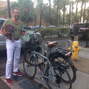 Our first stop turned out to be Lou Wine Shop, where we were greeted by Lou himself. He asked us what we were looking for, but then took a good look at my deep red and very sweaty face, and suggested perhaps I would like to start with a cold glass of water – just what I needed! Of course, el Cochinito was appearing all refreshed and sweat-free, having made the ride on his electric-assist Pedego bike. (Harumph!) Lou helped us select a nice bottle to take with us to the Hollywood Bowl. It was apparent that we could learn a lot about wine from Lou, and we both agreed we will have to return for more one day.