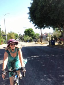 We retrieved our bikes and headed up (really UP) to the Bowl. It wasn’t a bad route, and we were able to do some of the first part off of the busiest streets. But one of those cute little streets took a super steep incline for about 1/4 of a block as we made our way from Yucca to Franklin. Even in my lowest gear, and weaving side to side, I found myself beginning to fall over, rather than continue up that nasty little hill. So I stepped off the bike and walked it up that last little bit, where el Cochinito was waiting for me. I had imagined the hill up Highland to the Bowl would be a hearty climb, but it didn’t seem that hard. Not sure if that’s in comparison to the earlier climb, when it was hotter out, or because I was still buzzing from my killer cocktail!