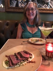 From there we headed west into Hollywood, for a delicious dinner el Cochinito had booked for us at Cleo’s. It appeared the parking valets at Cleo’s were not accustomed to diners arriving by bike, but they were nice enough about helping us identify a suitable place to park in their garage. The restaurant is elegant, without being over the top – lots of photos and decor celebrating Cleopatra. They have an enticing menu of craft cocktails to choose from, and a delectable selection of food to cover just about any appetite or palate. I had a fancy-schmancy cocktail and some seriously delicious roast lamb with lebaneh and Israeli couscous. I felt like I was getting quite the royal treatment, and it was wonderful.
