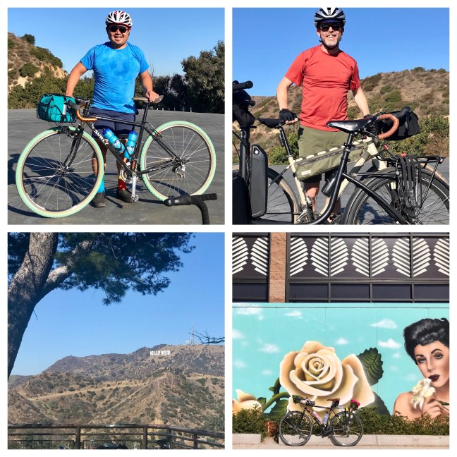 Notes: Many Thursdays this summer, I joined a group that bikes up to the Helipad after work to watch the sunset and sip beer. As the sunsets became too early in the Fall, the group switched to Sunday mornings and coffee. An advantage to doing it in the morning is that I could then continue riding on through the park. The photo in the lower left panel is the view of the Hollywood sign from the Griffith Observatory. Lower right is a favorite mural I pass on my way home from the park.