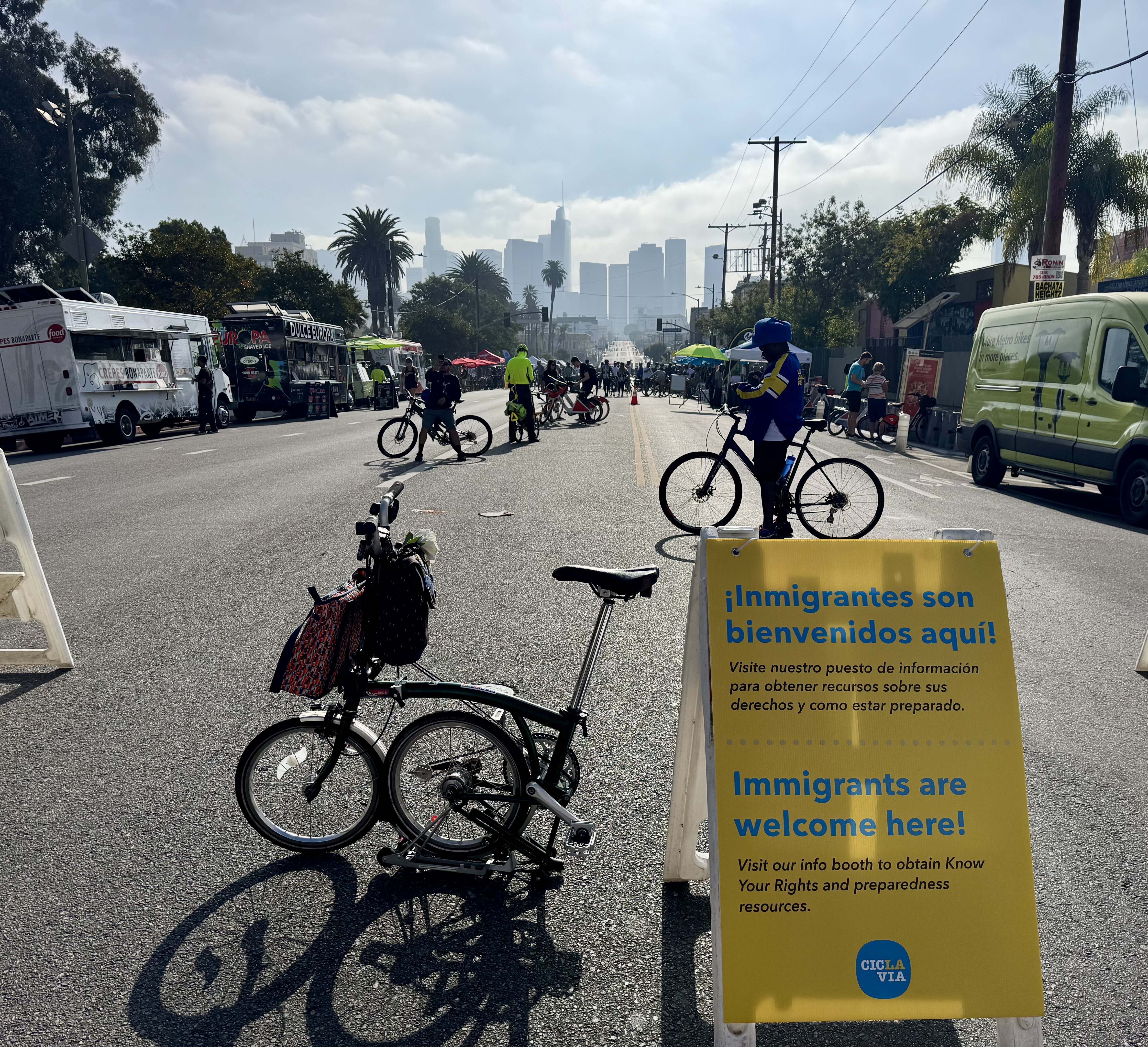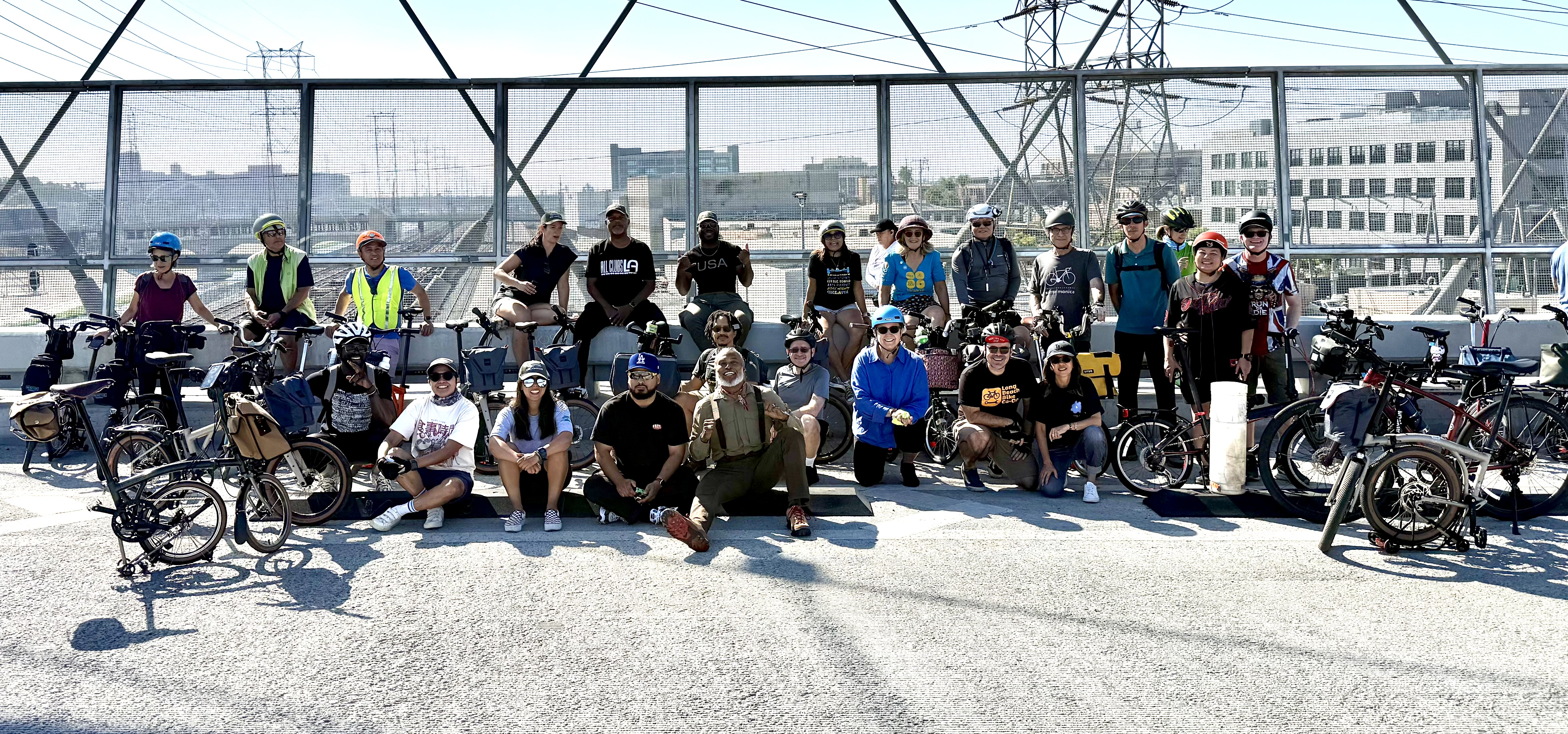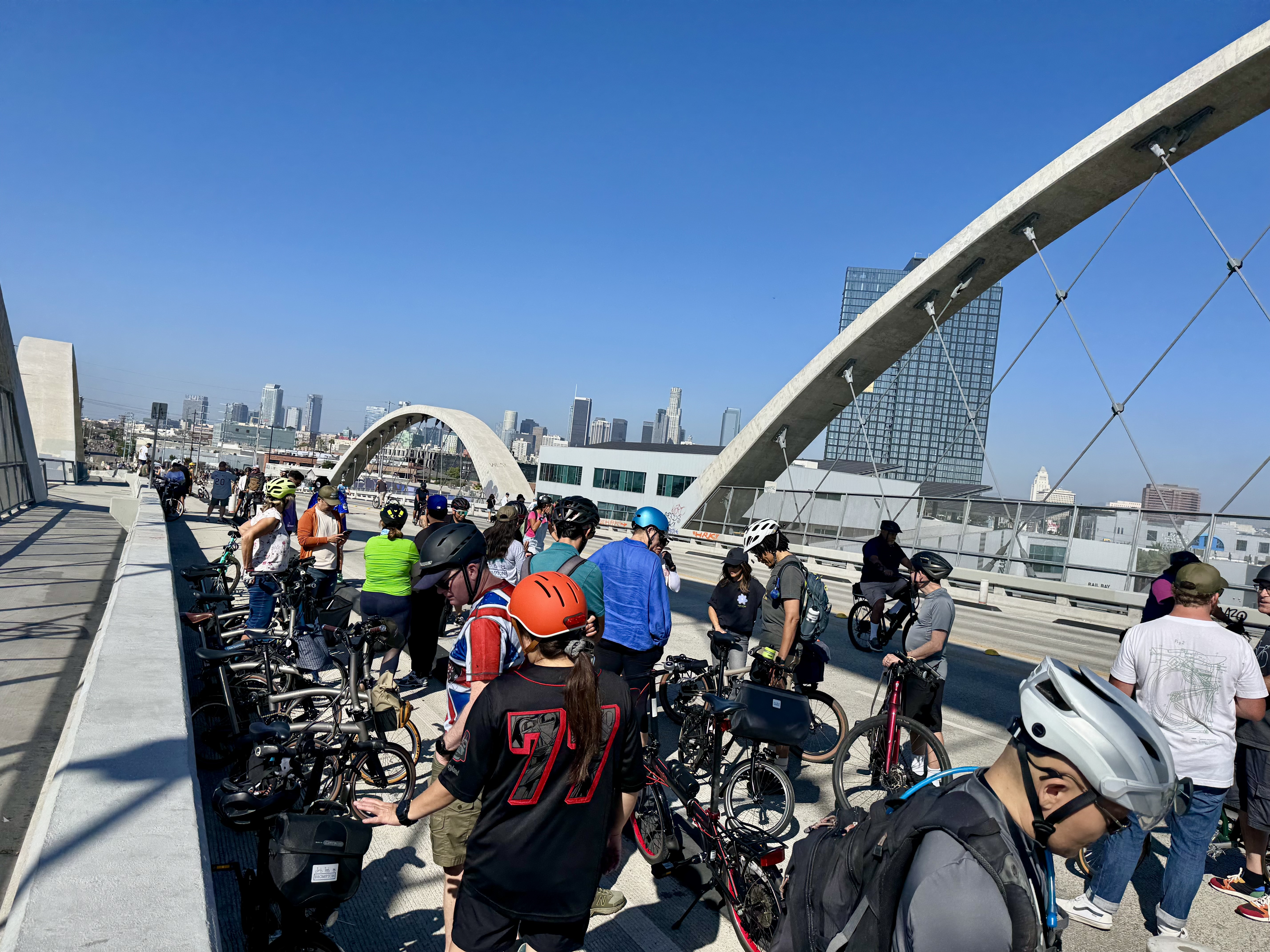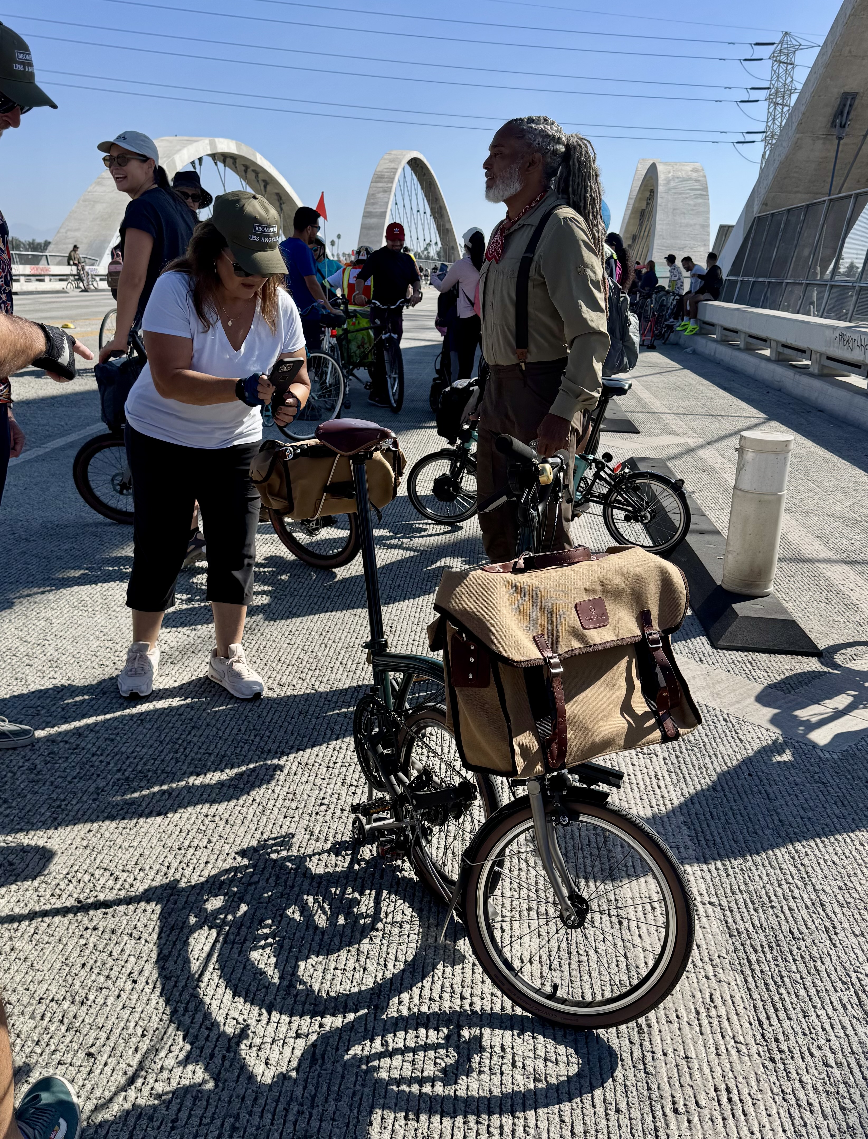 I hopped on the course at MacArthur Park and quite soon saw a large group of folks on Bromptons. I realized this must be the organized Brompton group that often rides together at CicLAvia events. I don’t always ride my Brompton for these events, but this time I did. I spotted my Brompton-owning friend Joni and she encouraged me to partake of the provided coffee and pastries, but it looked like the good stuff had already been taken. I did ride with the group into downtown where we participated in a group photo on the 6th Street Bridge. It was an impressively large group. One Brompton was drawing a lot of attention, the specially outfitted one ridden by Eric Cedeño, also known as the Bicycle Nomad. He is a fun one to follow on Instagram.