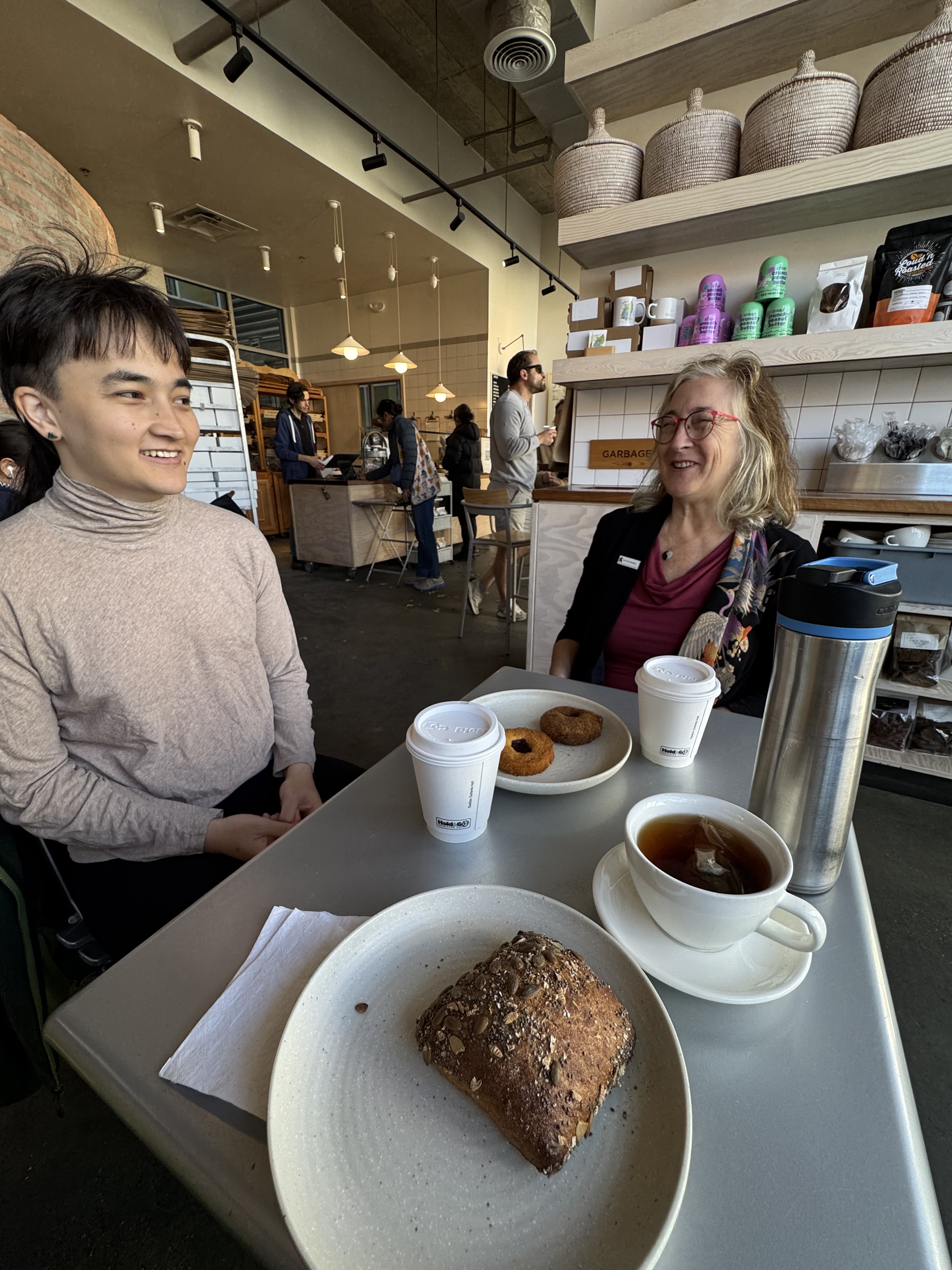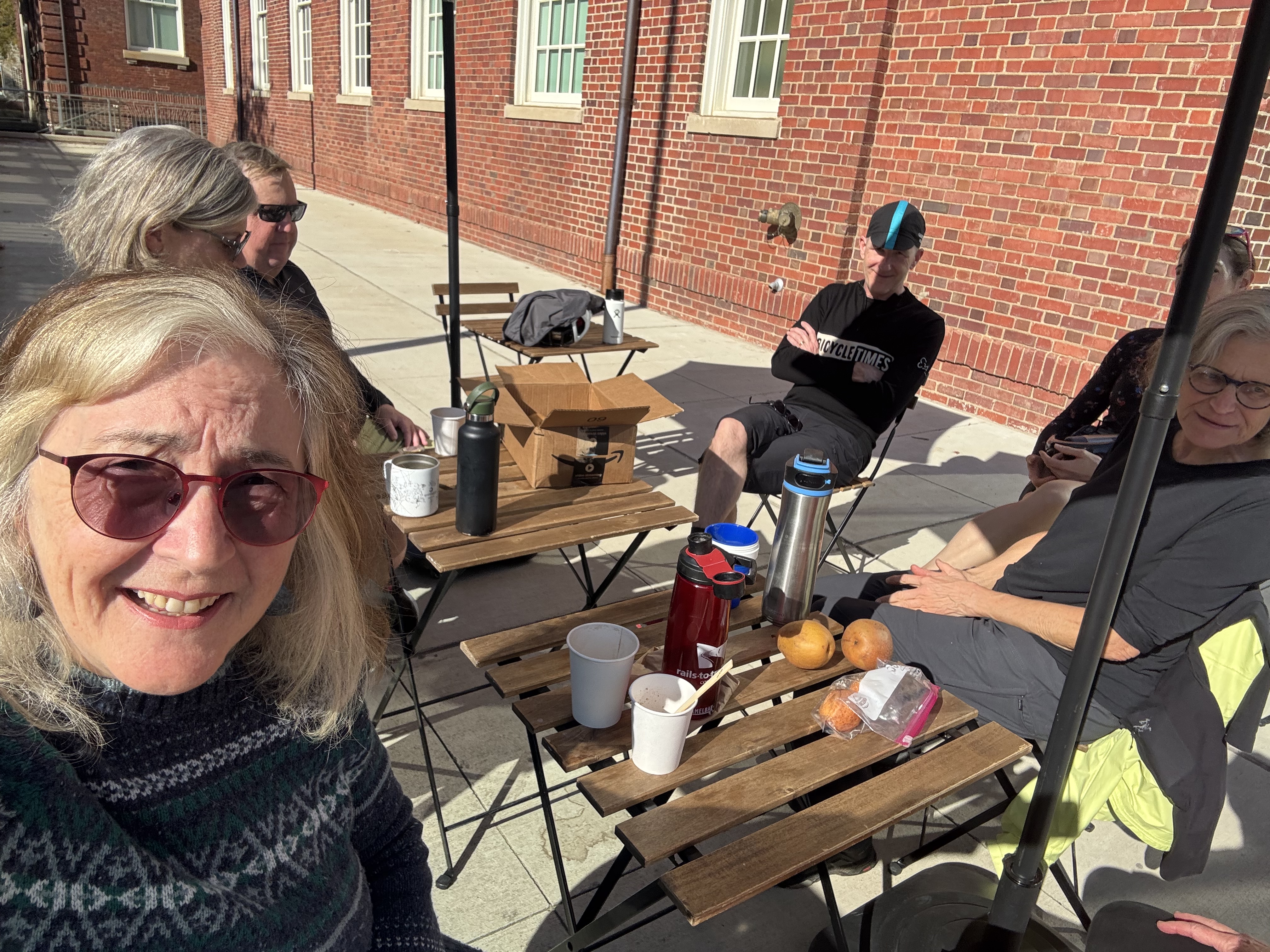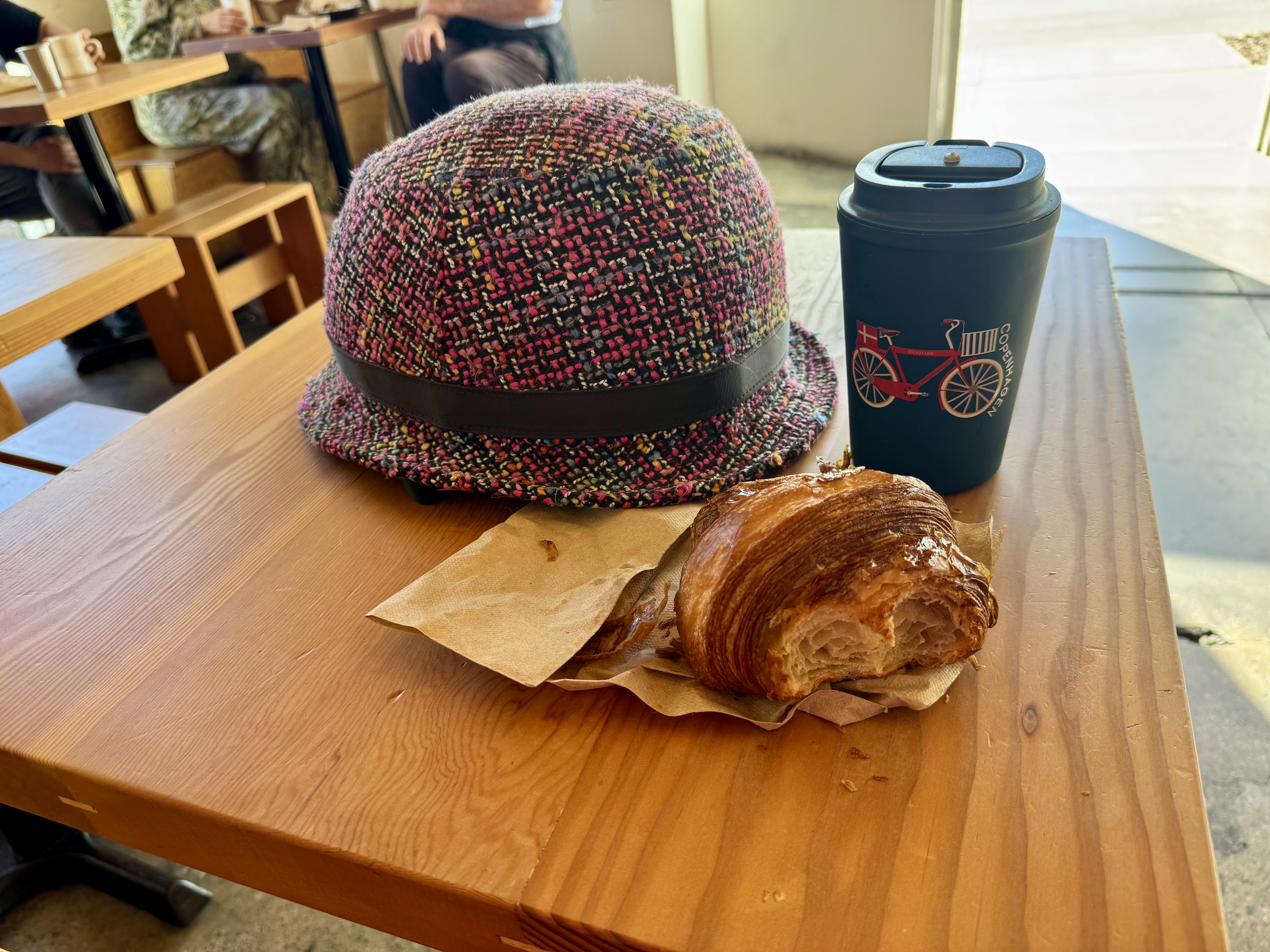 By the time I arrived, my husband had texted me a photo to help me find where he’d parked the car, and I put my bike in the back of our car. I got my coffee while he finished up with his students. When I went to sit down with him, we enjoyed sharing an almond croissant he had picked up for us.