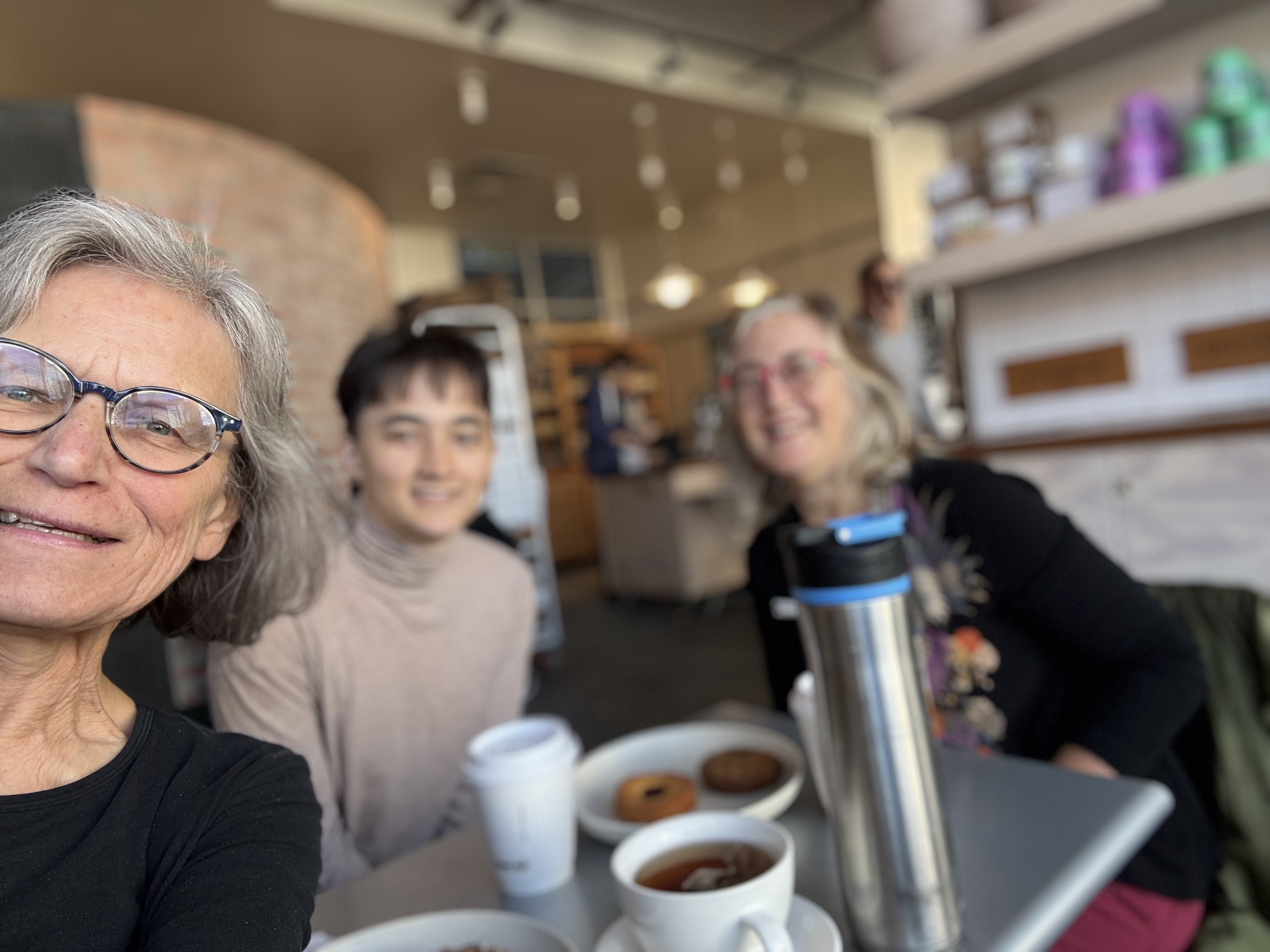 When I got to Dam Good Coffee, I saw someone sitting outside, seemingly finishing up their coffee, and I decided on a place to lock up my bike near the outdoor tables. But when I went to enter, the door seemed to be locked. I walked around to a side door that was open but behind a locked security screen door. I hollered through that open area to see if someone might be in the back, but got no response. I hung around for a bit, trying to decide if I should just roll on or wait awhile. I checked the shop’s hours on my phone and saw that it should be open, so perhaps someone had taken a short break and would return. Then one of those cyber trucks sped up and pulled into a driveway next to the side door and out jumped a man who told me he’d seen me on the security camera and rushed back to let me in. Turns out he’d been dealing with some kind of emergency involving his water system, and had to leave to address it.