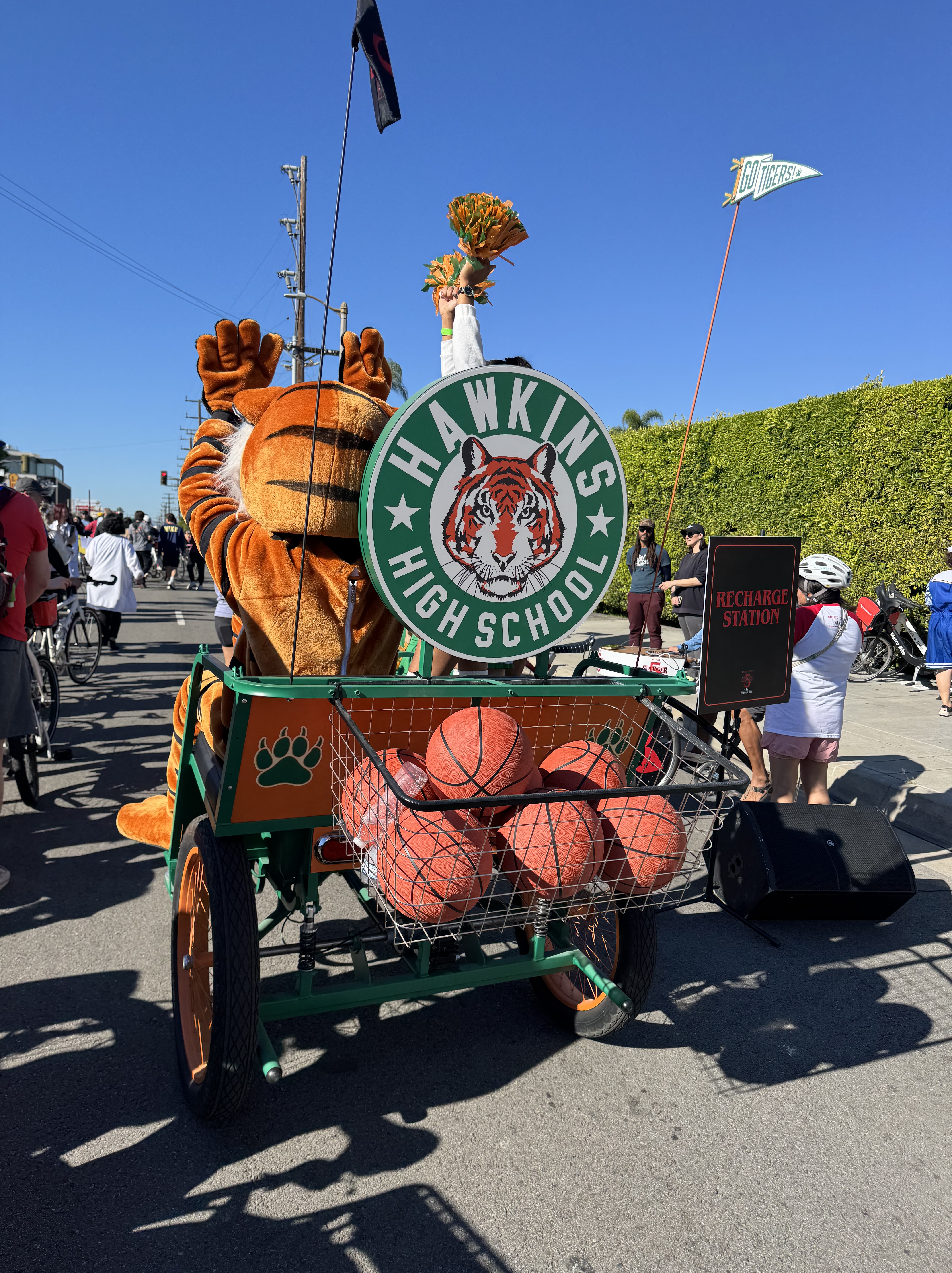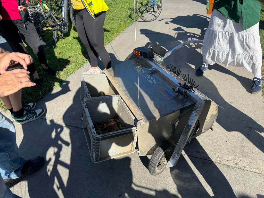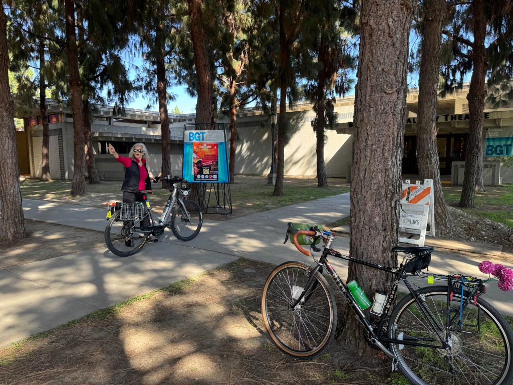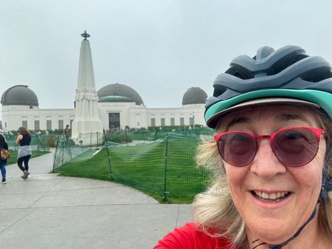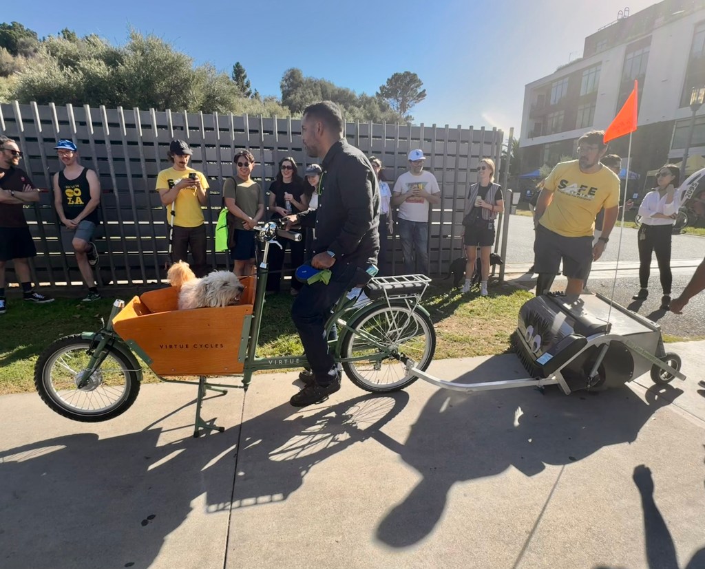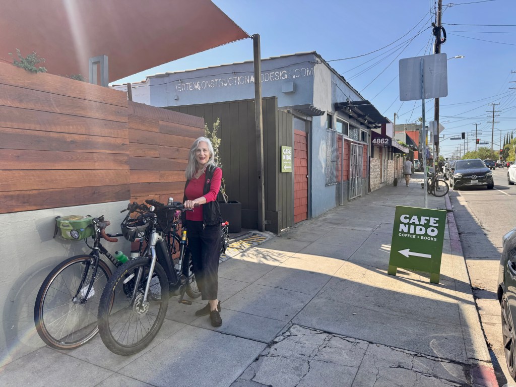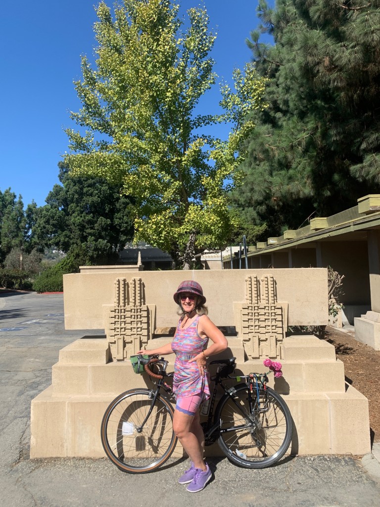 Opening day of the challenge began with a visit to Cafe Nido, which was featured on the Instagram list of most beautiful coffee shops in LA. My friend Jennifer agreed to join me for the experience. We were both planning to attend an event in East Hollywood that day, and Cafe Nido would be on the way. We rolled our bikes into the pretty patio area that is filled with lots of plants and books. I had a pumpkin mocha (delicious) and a chocolate croissant, while Jennifer had the most impressive yogurt cup I’ve ever seen. The patio area is indeed gorgeous and inviting. From there we rode on to nearby Barnsdall Park for the unveiling of a new bike lane cleaner dubbed Sweeping Beauty. In attendance, and honored for having supported this project, was L.A. City Councilmember Hugo Martinez, who has also been a strong supporter of the Hollywood Blvd bike lanes. Since we got to the park at little early, we had time to ride up the hill to take in the views and appreciate the beautiful Hollyhock House, a Frank Lloyd Wright gem that was his first Los Angeles commission and the highlight of Barnsdall Art Park.