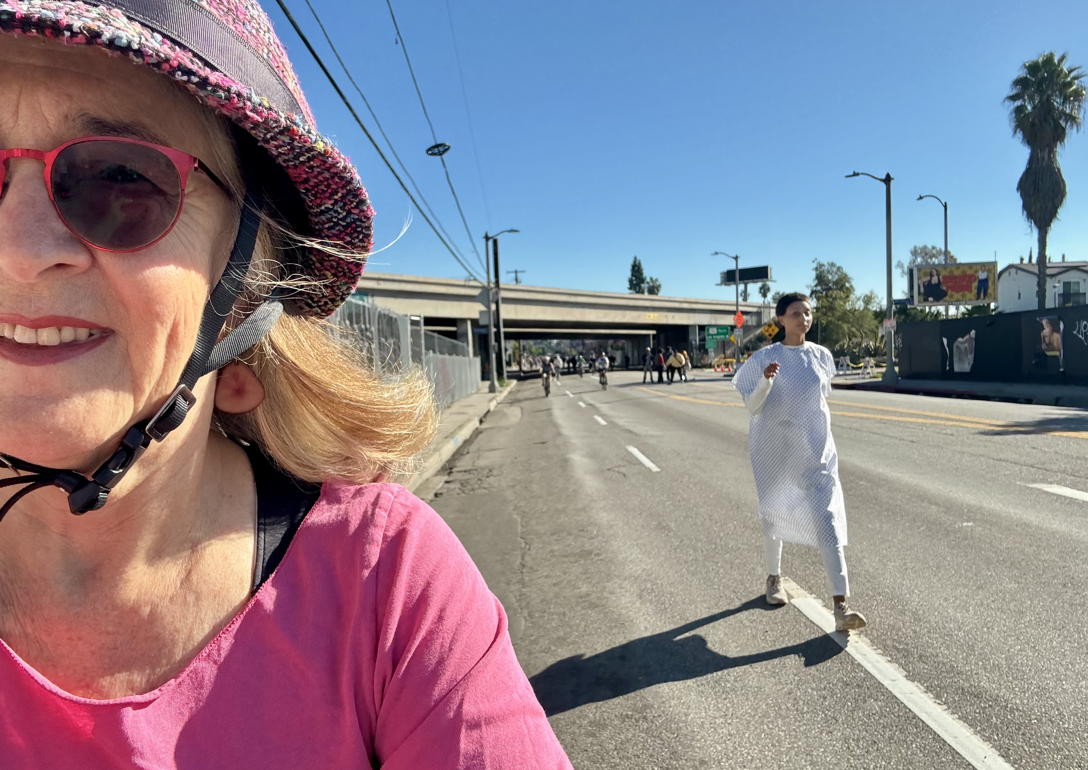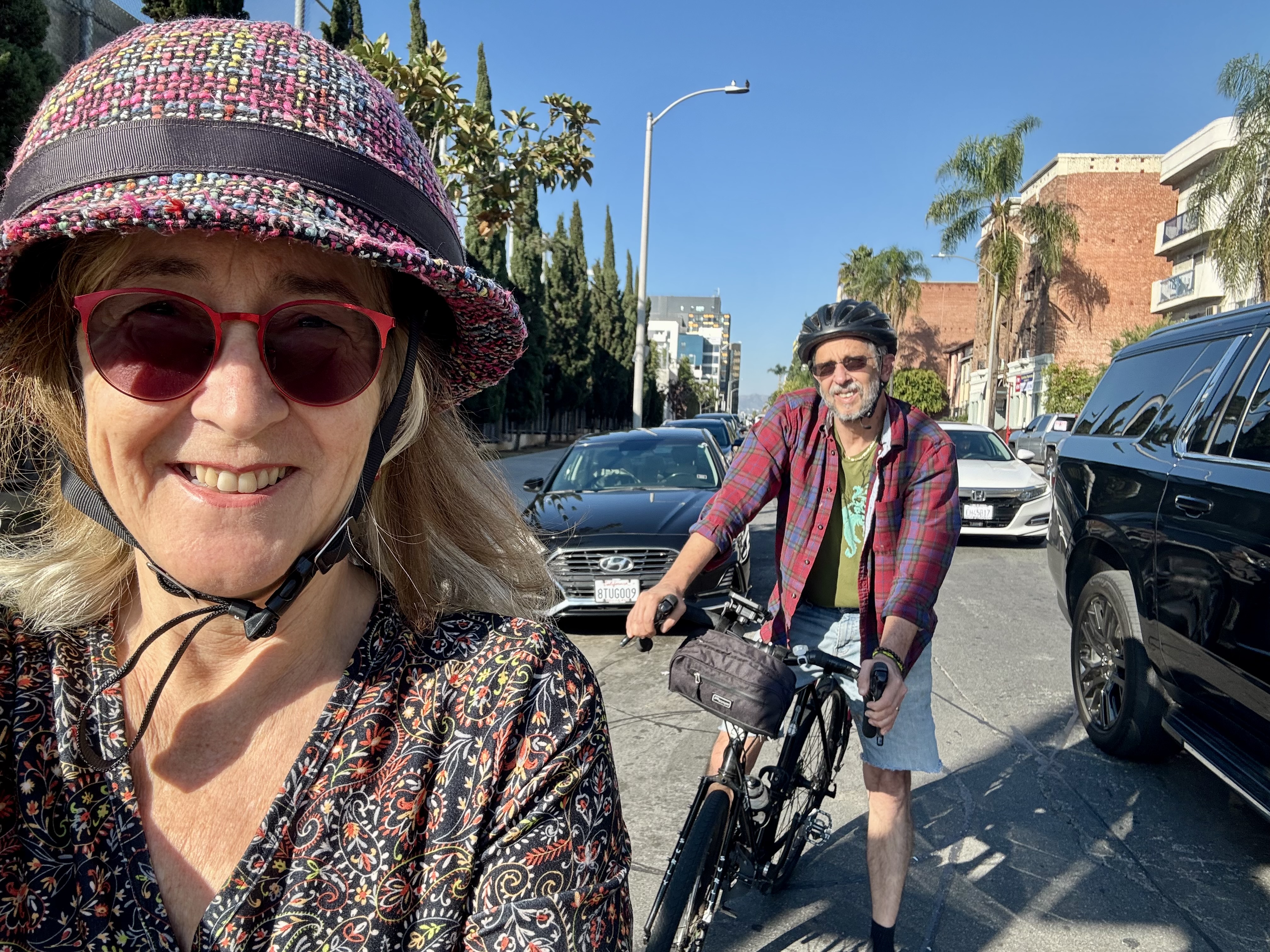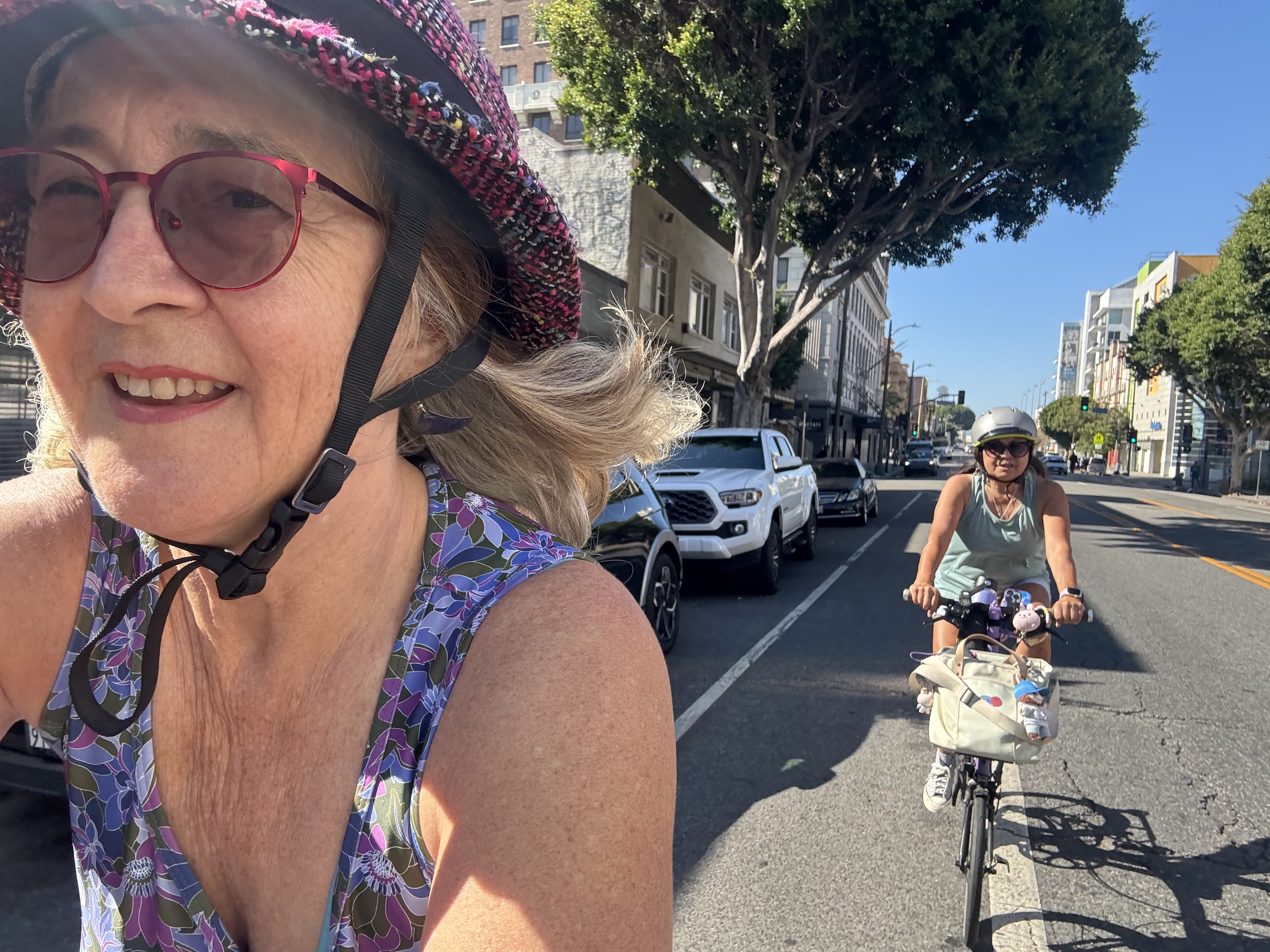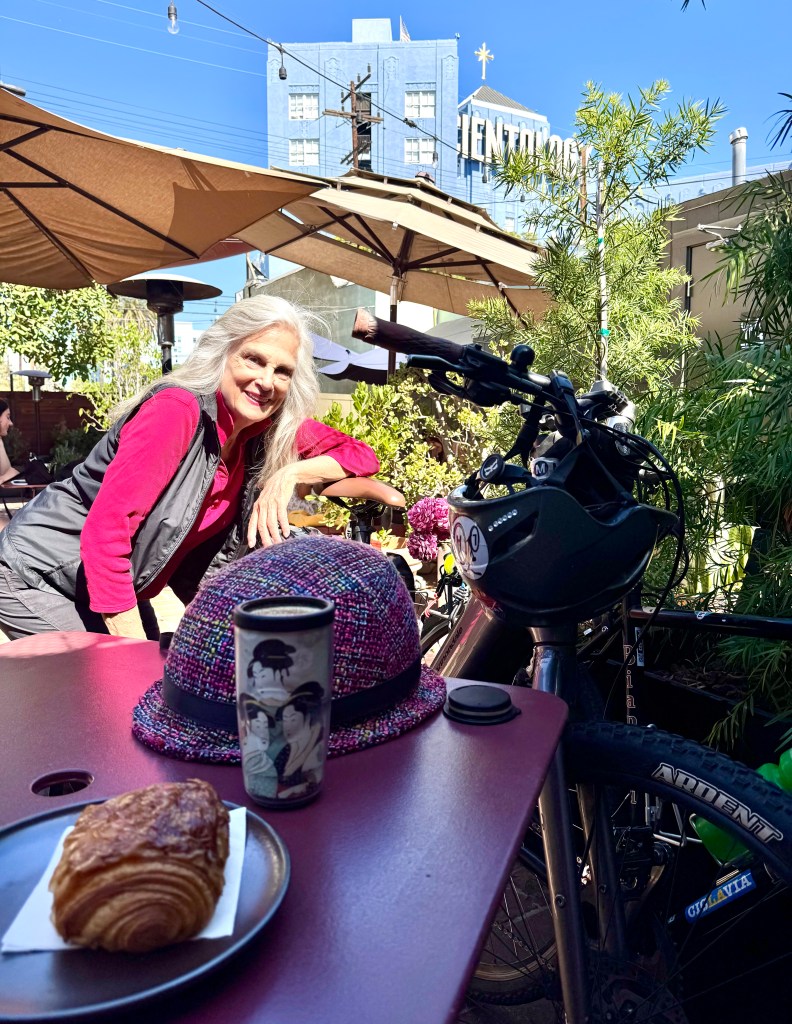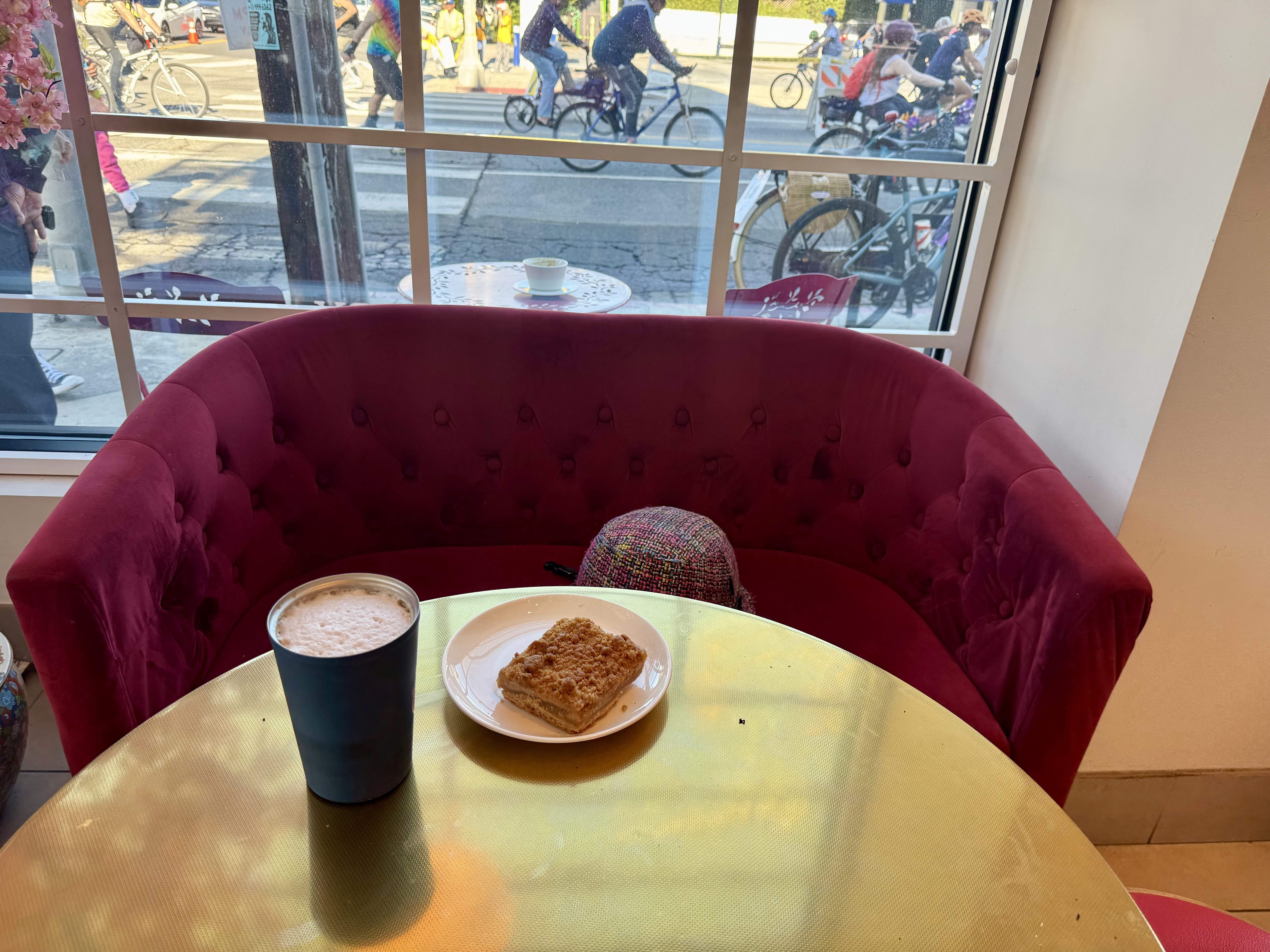 After lunch, we followed the Chinatown leg of the route. There we stopped at a bakery to pick out cake to celebrate Lynn’s birthday. And because I was wanting to visit Zinc Cafe and the Arts District (it was on the Instagram list of beautiful coffee places AND it was very close to the CicLAvia route), we had planned to meet (Joni, Jennifer, Lynn and me) there. Along the way, I rode alongside Carolin Kewer, the creative force behind the legendary Art Crash rides that used to happen from time to time in the pre-COVID era. She is one of my favorite examples of a woman who knows how to ride in style!