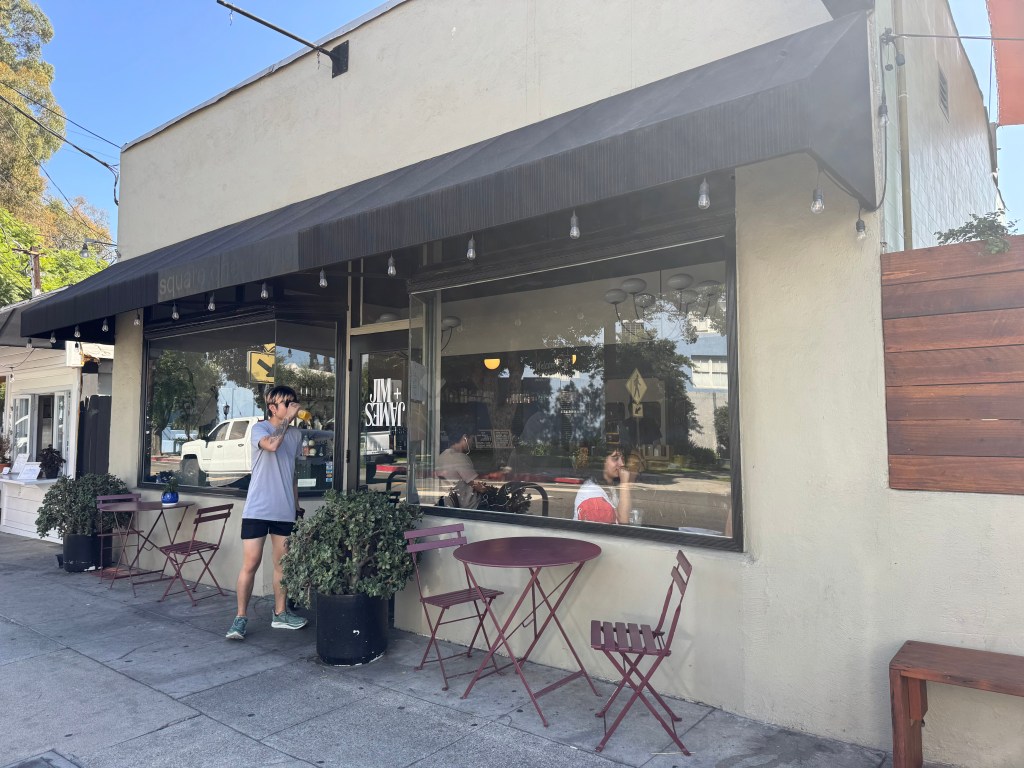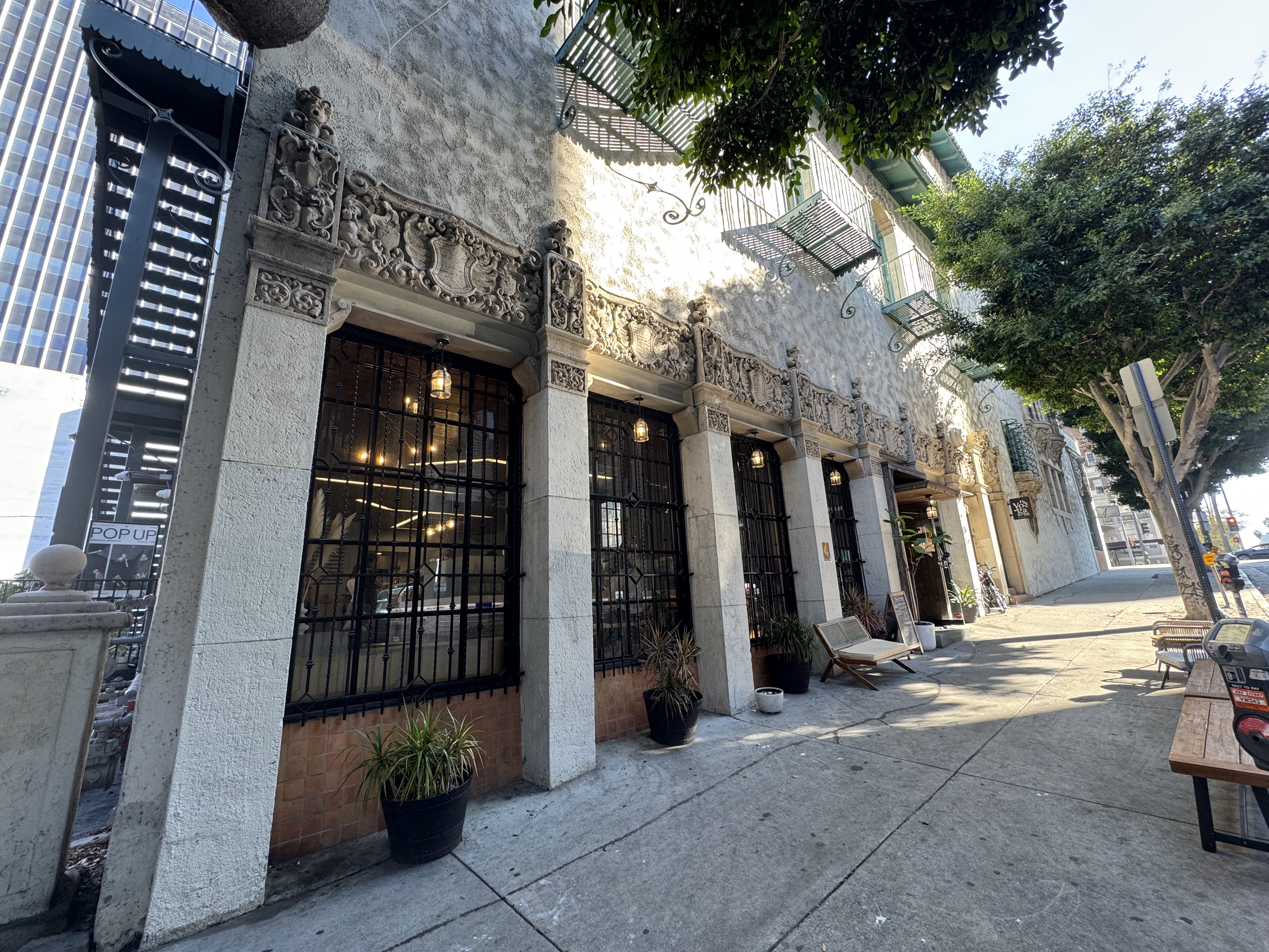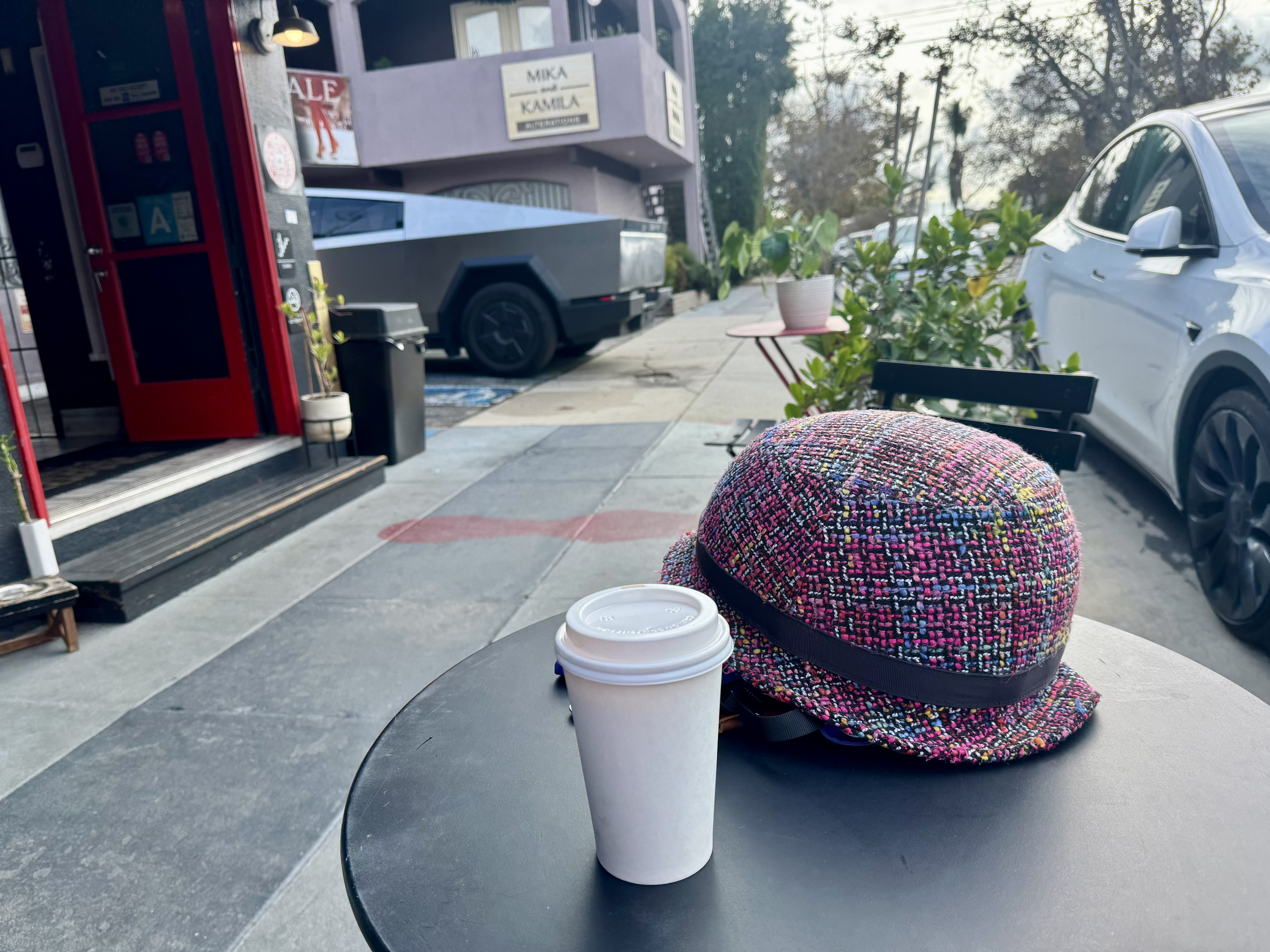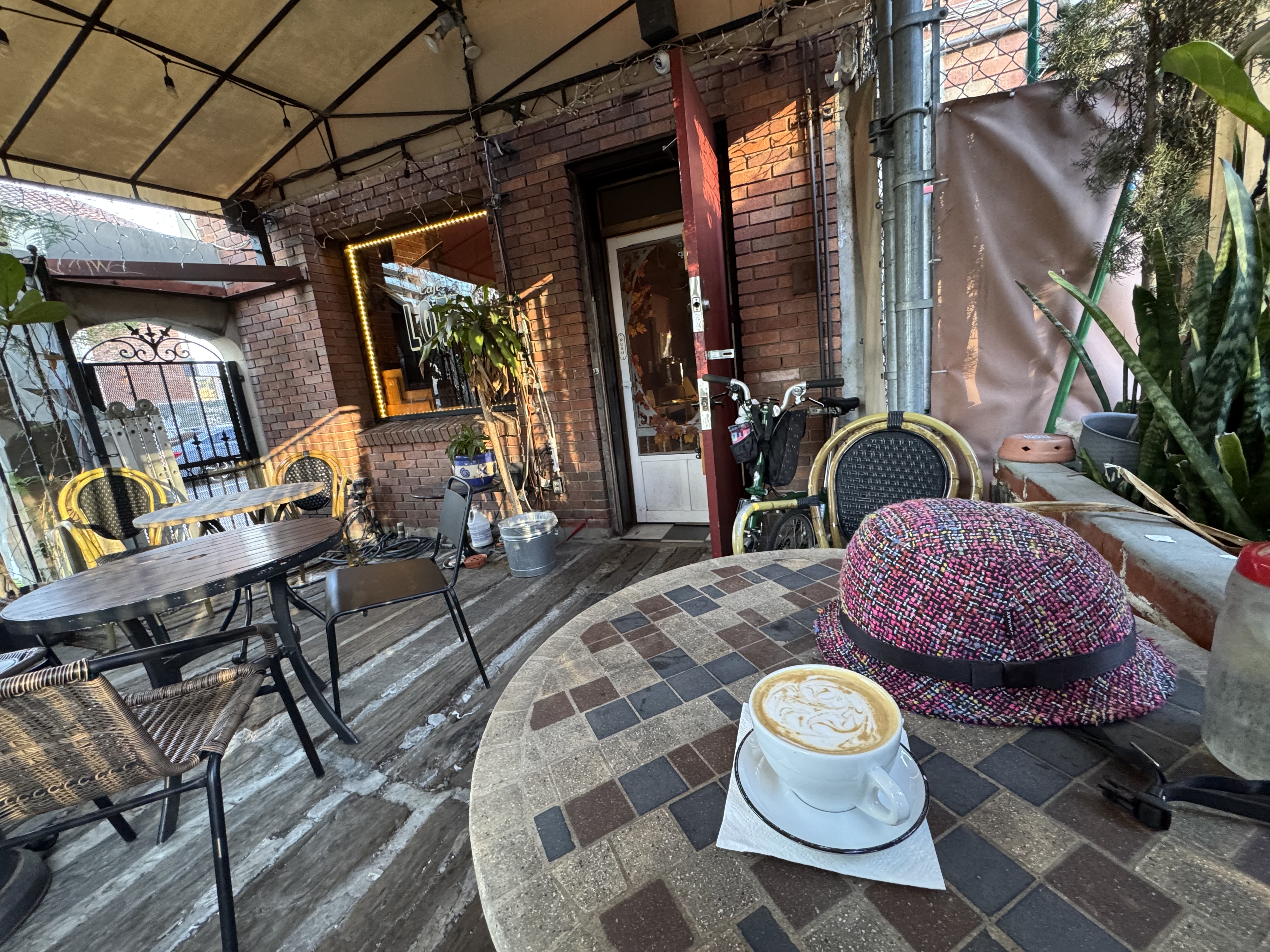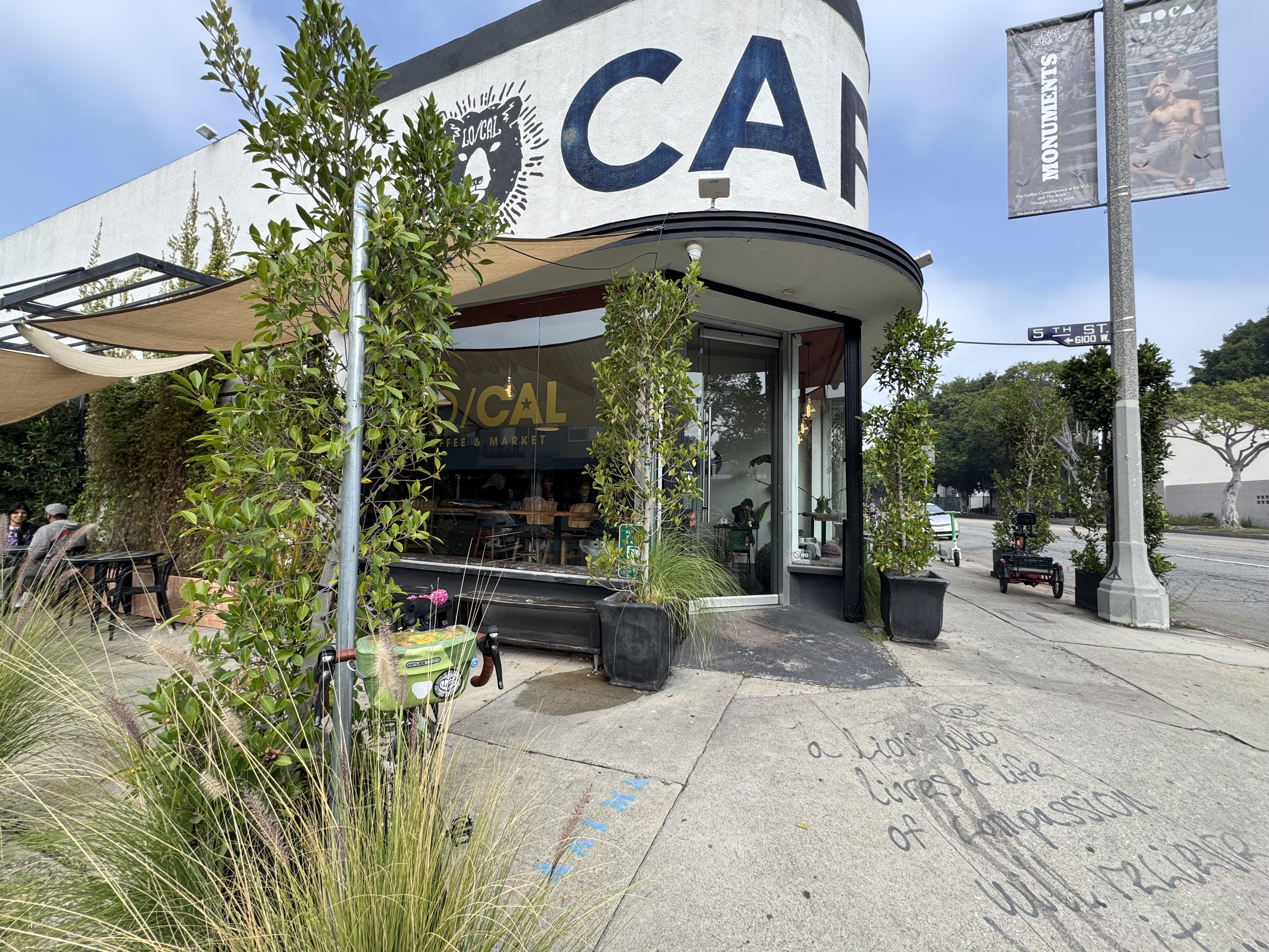From 2012 to 2022, I rented office space for my patent law practice in the Wilshire Colonnade, a building I loved that took up most of a large block on Wilshire Blvd, between Oxford Ave & Serrano Ave. The smaller portion of the block, along 6th Street, featured a row of cute brick-faced shops, in particular, one especially attractive coffee shop at the corner of 6th & Oxford. Oxford is one of the more bike-friendly streets in this busy part of town, and I use it a LOT, even when not commuting to that office. I often would say to myself, “I ought to check out this coffee shop next time I’m coffeeneuring.” And yet, year after year, I did not. At last, I have now rectified that situation.