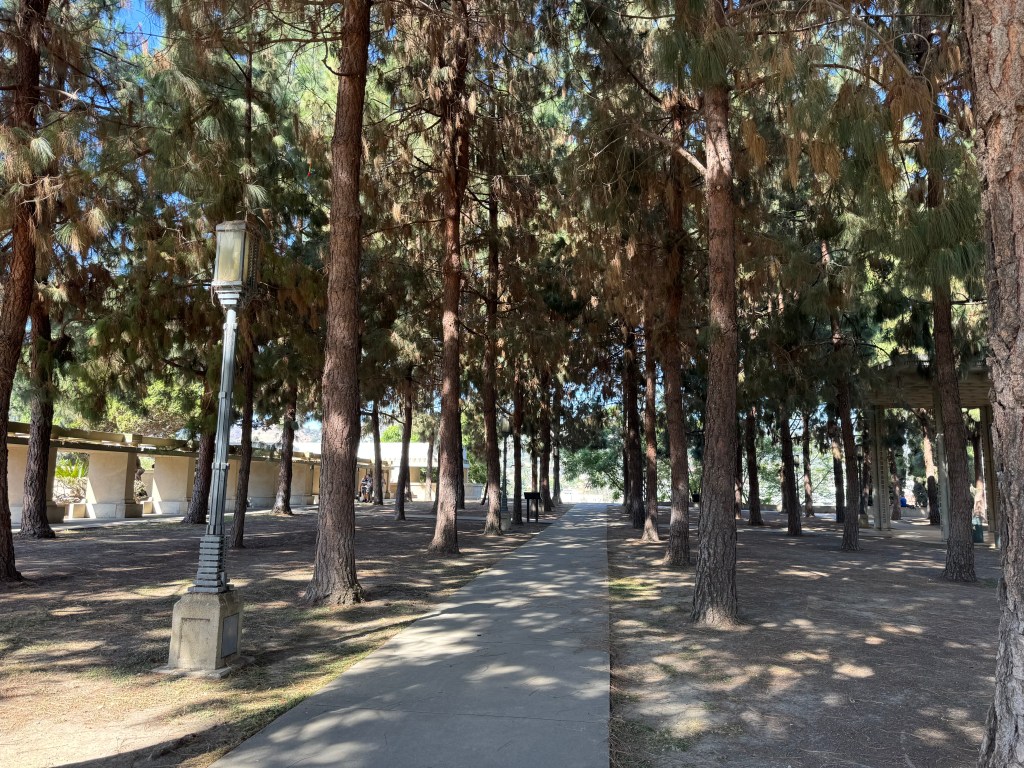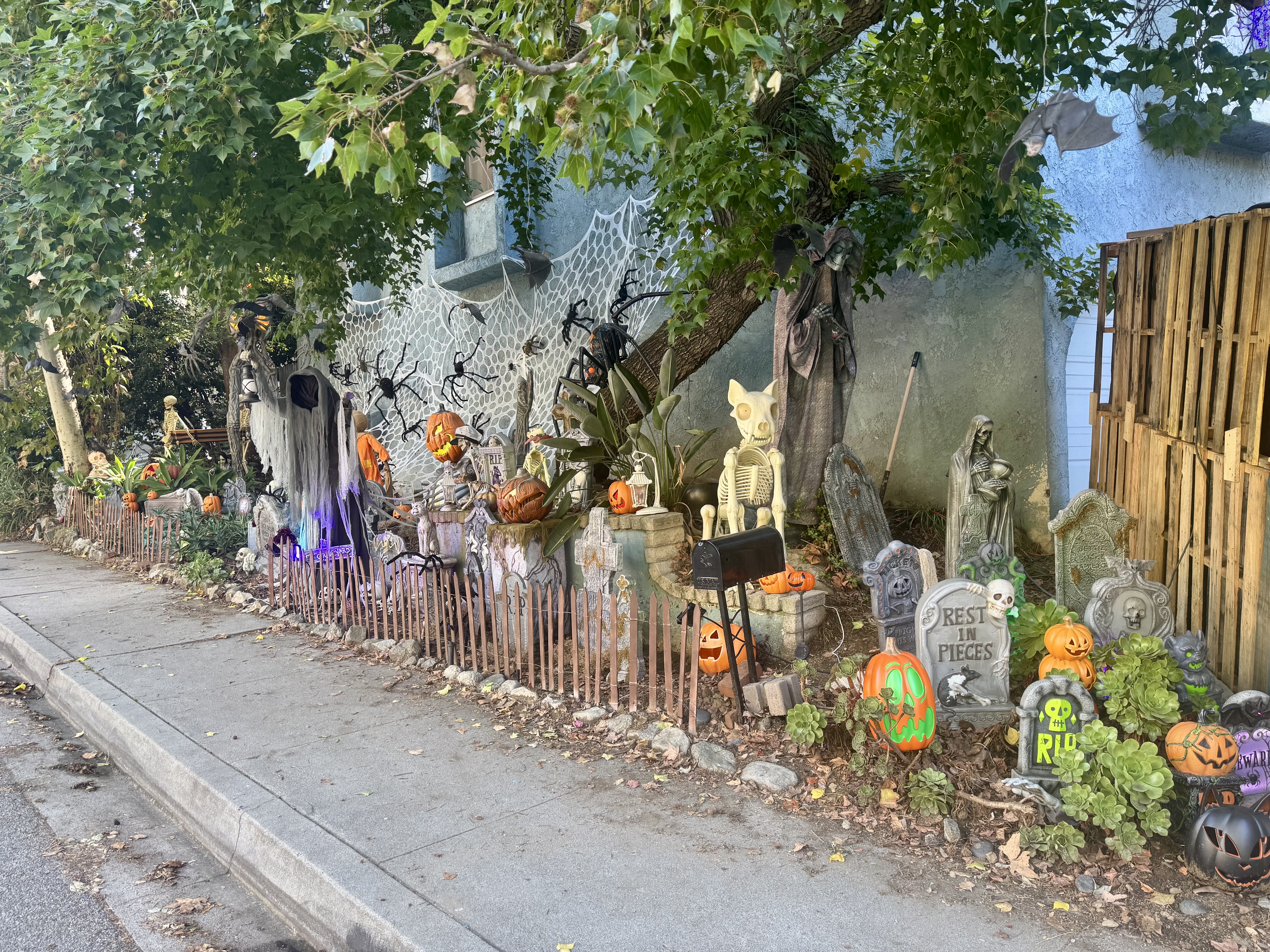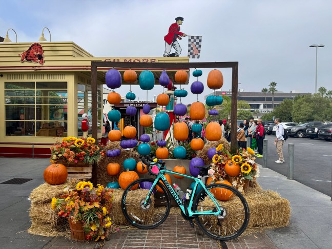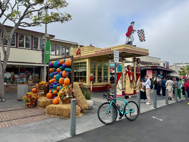 There’s something exciting about making plans to meet up with my husband somewhere. Once again, I was able to coordinate my morning bike ride with one of his meet-ups with his students. I felt a hankering to ride up to Griffith Observatory and get a quick little climb in while he met up with his students at the Original Farmer’s Market at 3rd & Fairfax. It’s a charming historic marketplace, and I love to get a cafe de olla at Coffee Corner, one of the many vendors in the market. So, after my ride up to Griffith Observatory, I headed for the Farmer’s Market via the bike lane on Hollywood Boulevard. Right in front of the entrance to the market, there was an Instagram-worthy stack of hay bales decorated for Halloween.