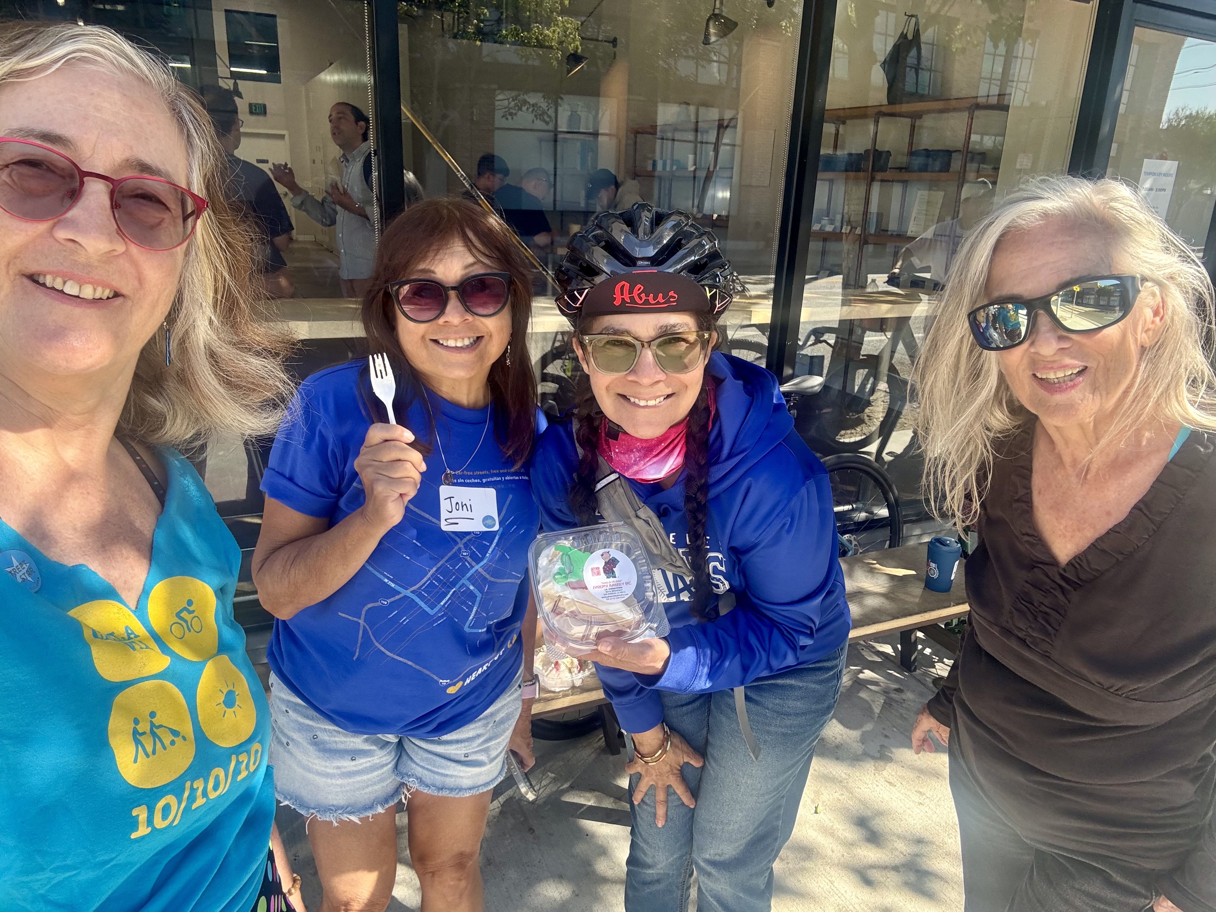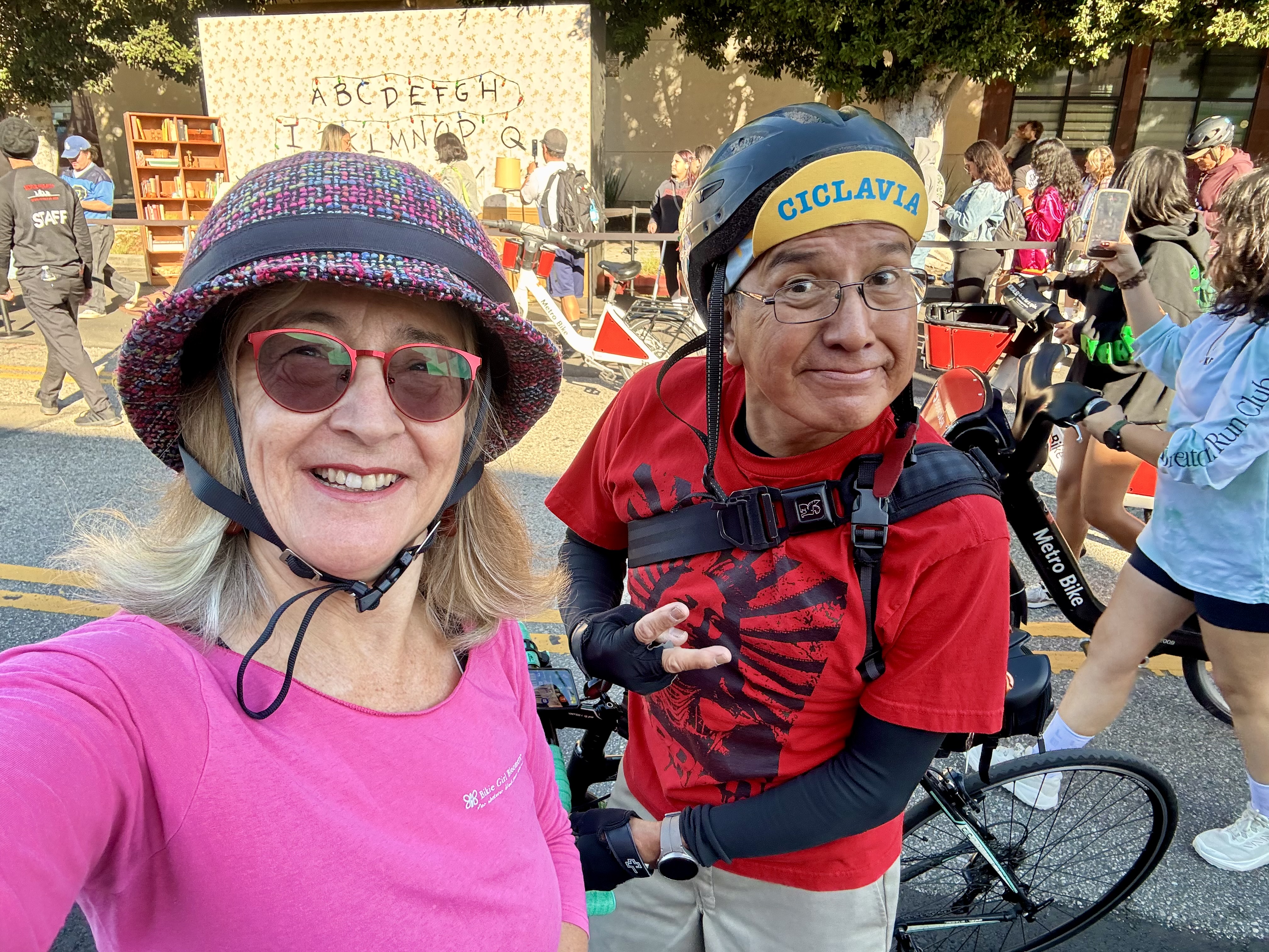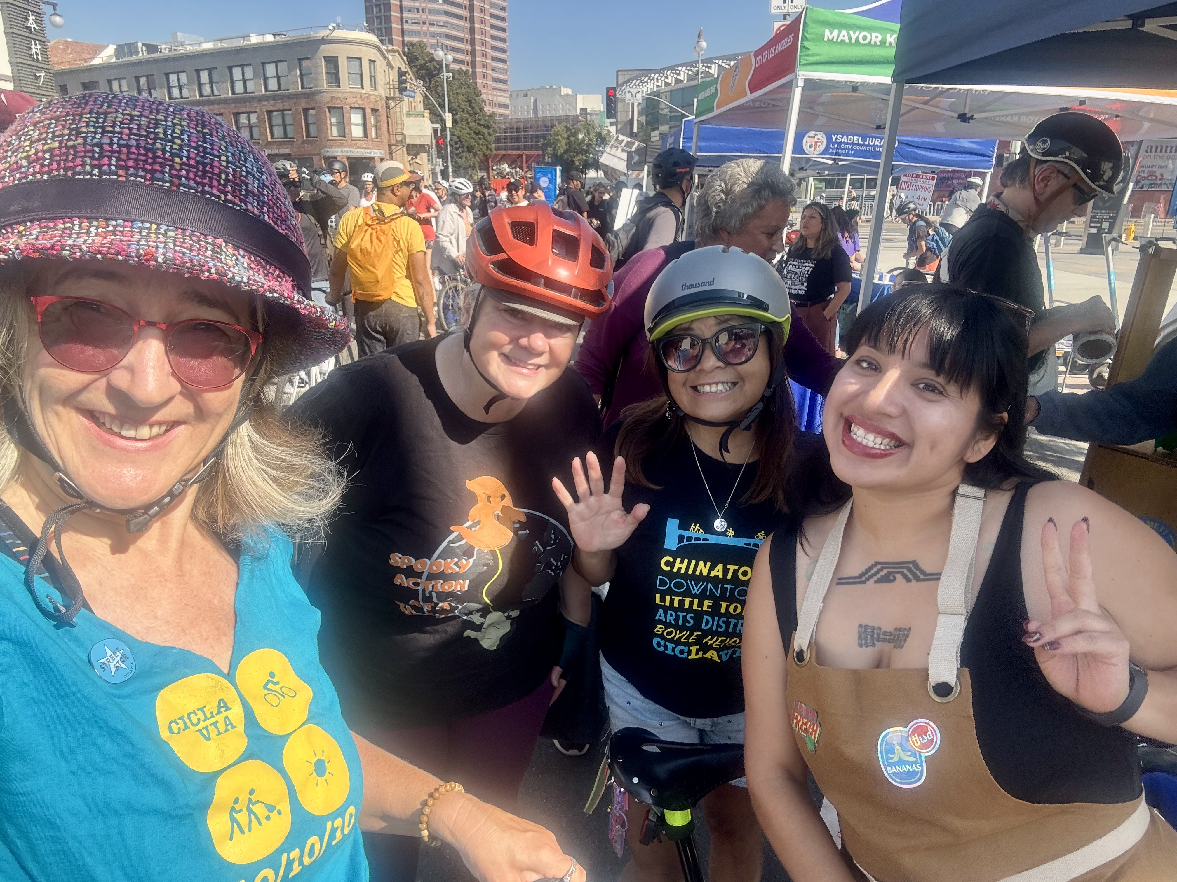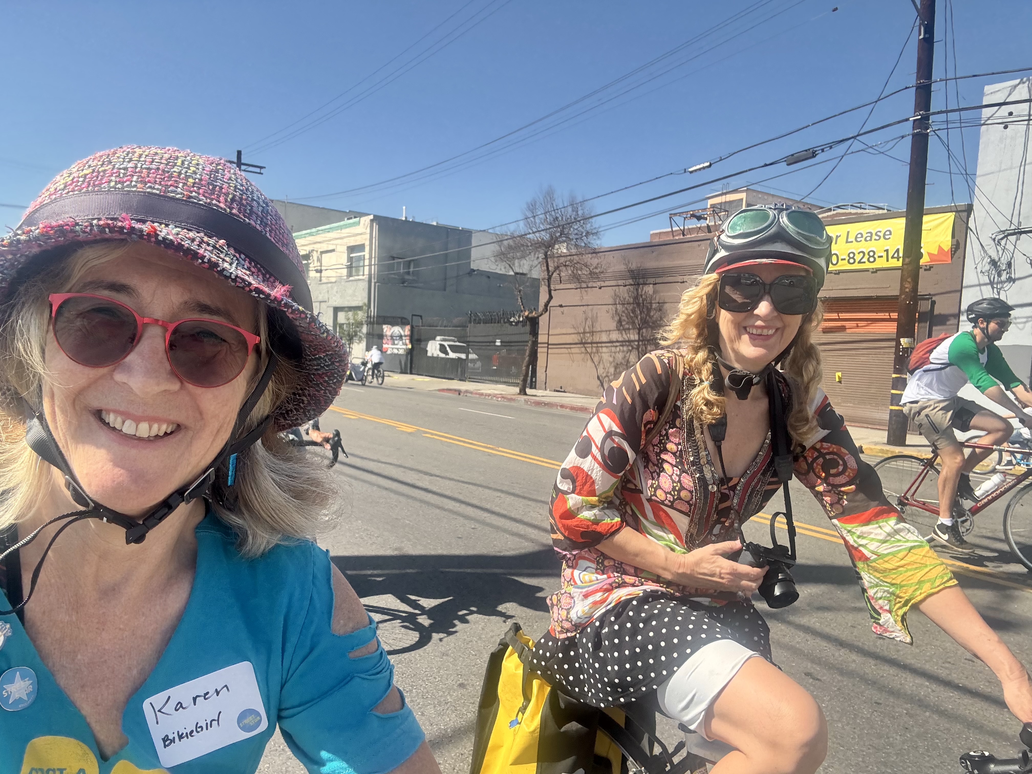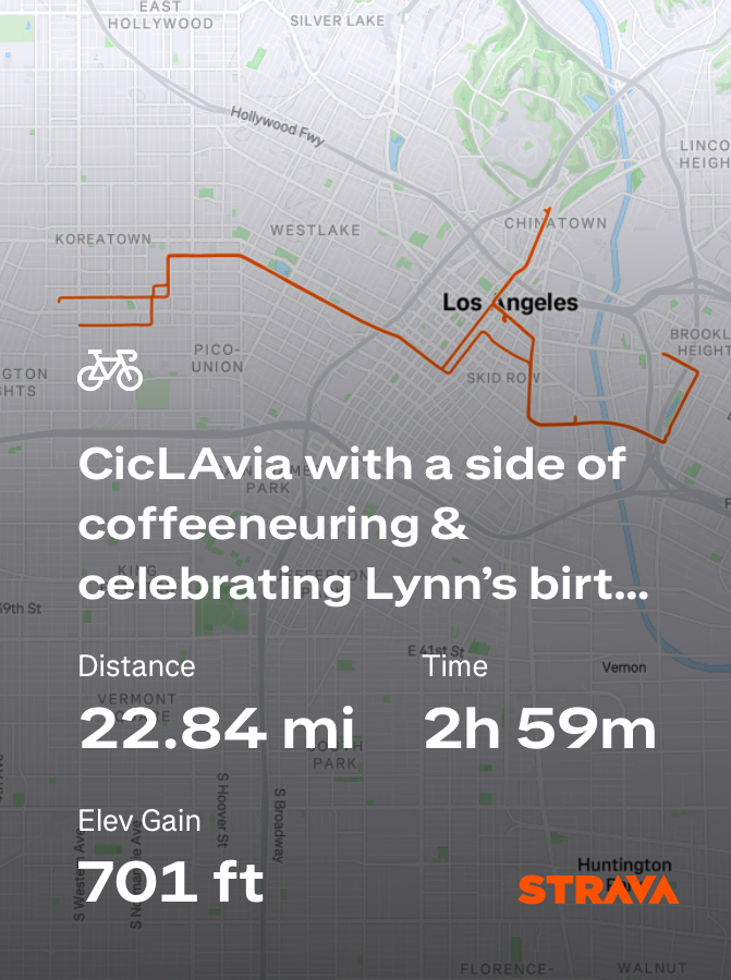 The very next day was another one of L.A.’s iconic open streets events: CicLAvia. Two of my favorite things, CicLAvia and Coffeeneuring are both celebrating 15 years! What an auspicious kickoff weekend for the coffeeneuring season. I celebrated by wearing my Party Pants Bloomers with the tee shirt I have from the very first CicLAvia held on 10/10/10. CicLAvia always means running into my bike friends, and today we got to celebrate a birthday for Lynn. Today’s CicLAvia route (they change to different parts of the city and different routes each time) honored the route of the first CicLAvia, in what is referred to as the Heart of LA route, which centers on downtown, with legs extending out to MacArthur Park to the west, Chinatown to the north, and Boyle Heights to the East.