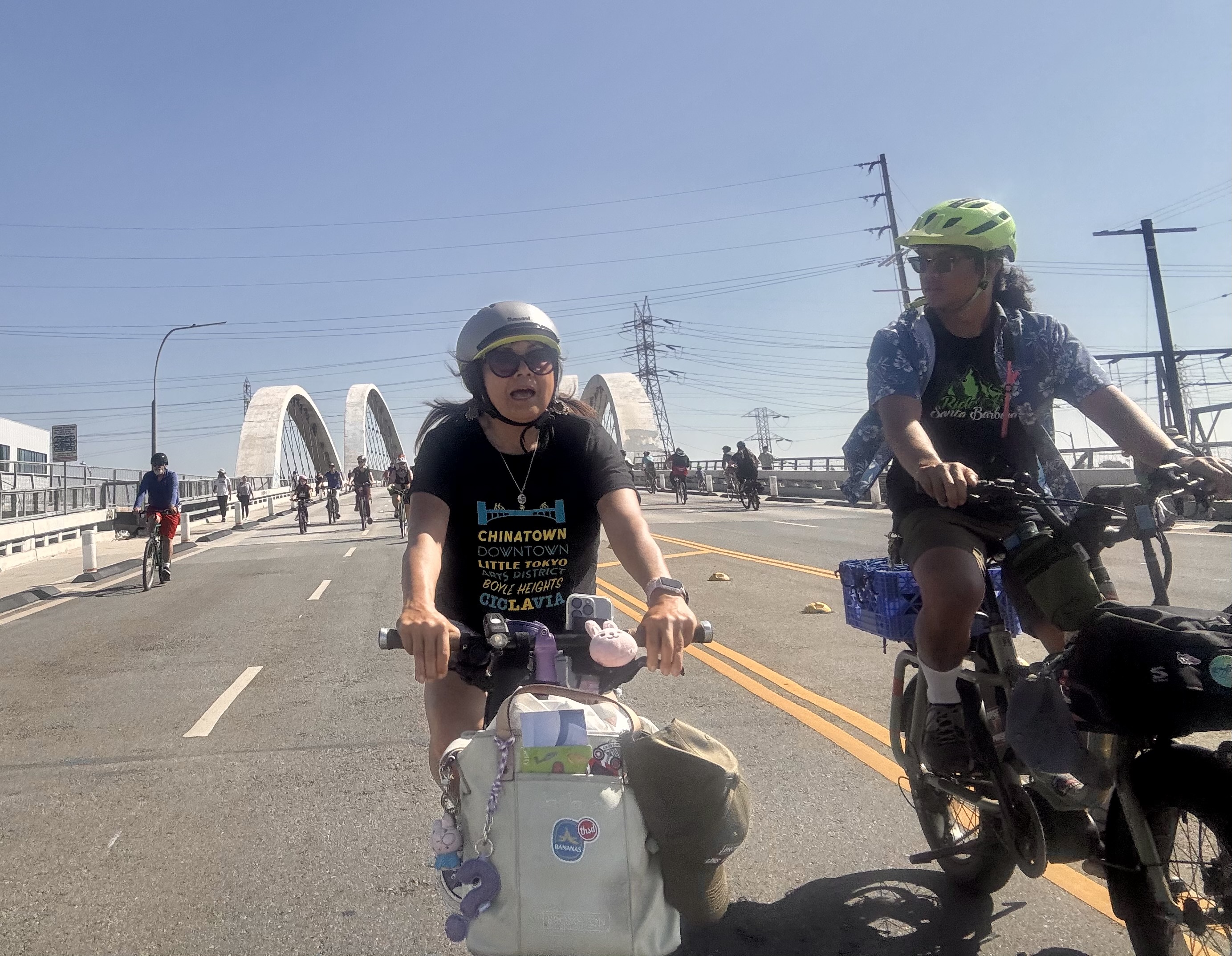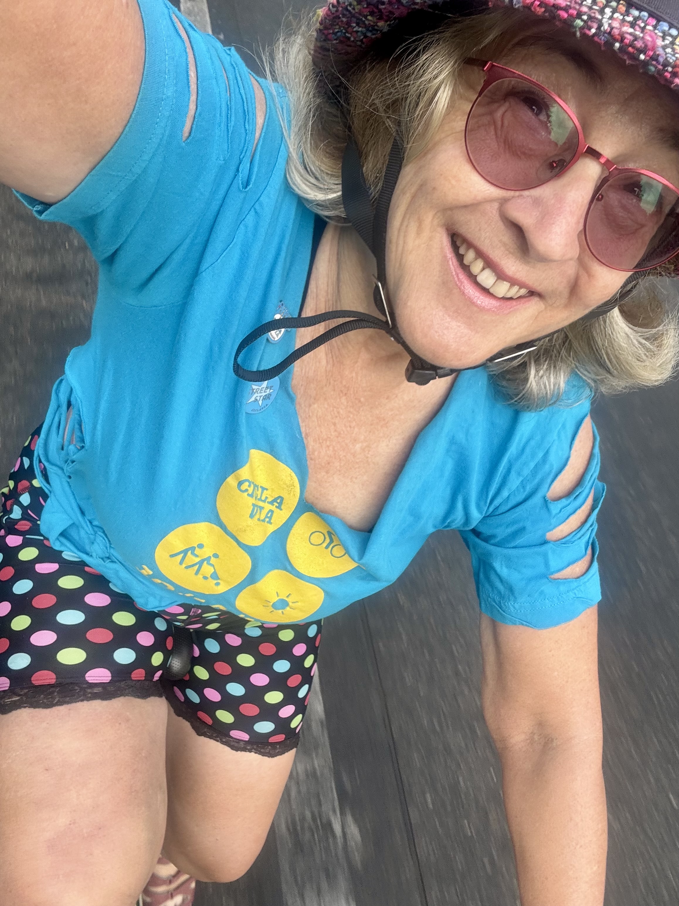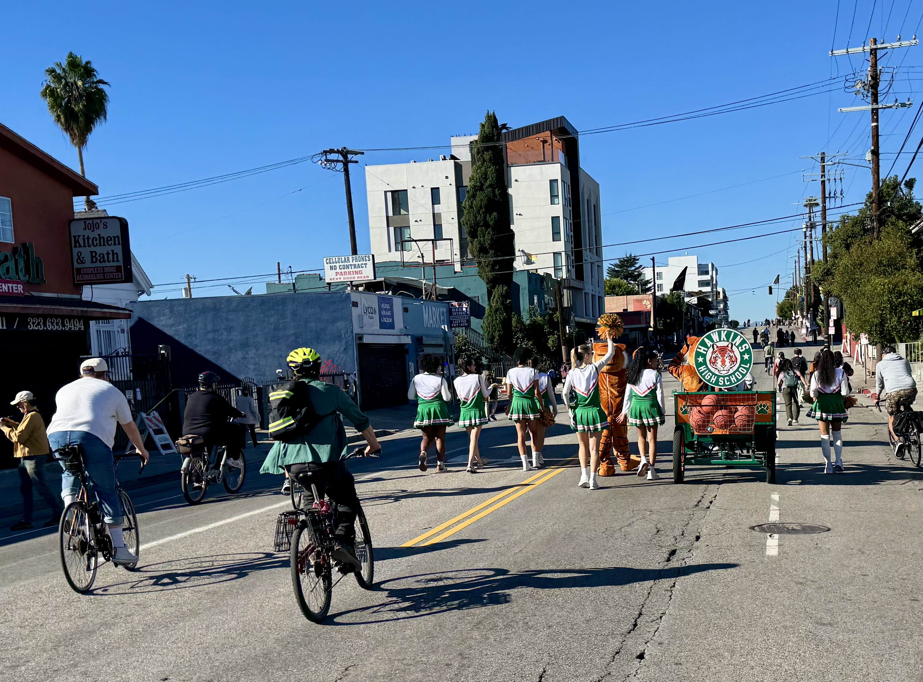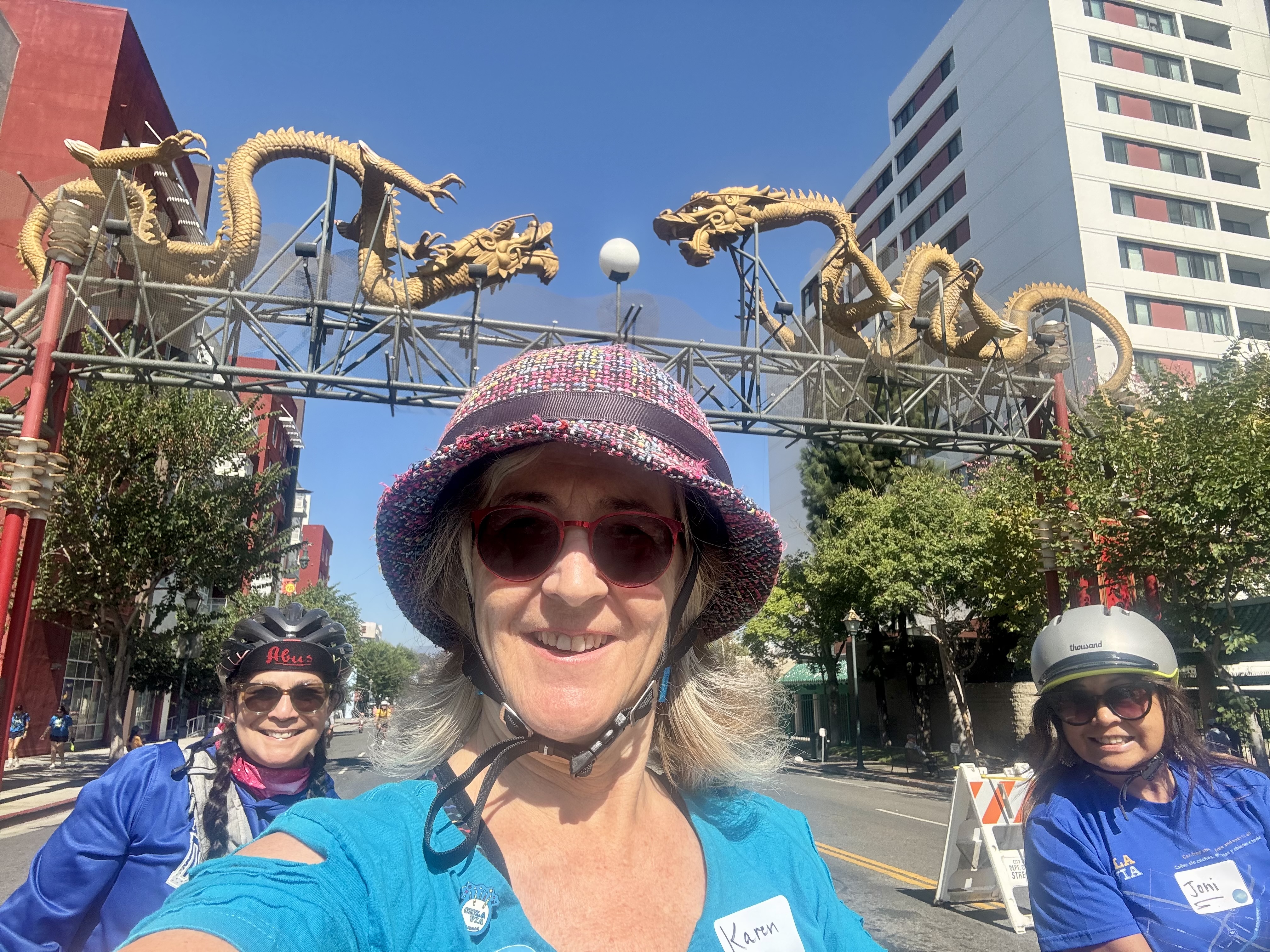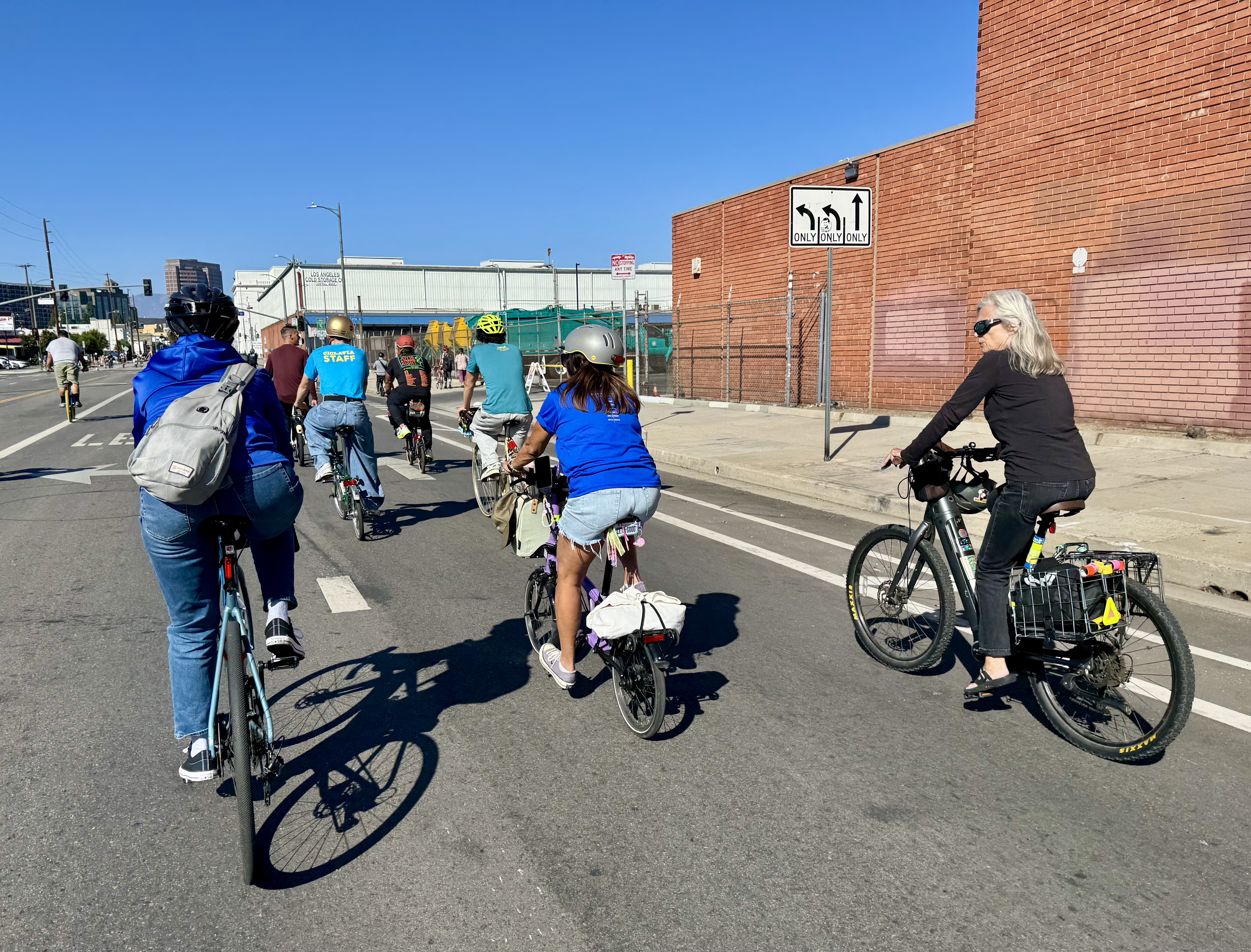 The very next day was another one of L.A.’s iconic open streets events: CicLAvia. Two of my favorite things, CicLAvia and Coffeeneuring are both celebrating 15 years! What an auspicious kickoff weekend for the coffeeneuring season. I celebrated by wearing my Party Pants Bloomers with the tee shirt I have from the very first CicLAvia held on 10/10/10. CicLAvia always means running into my bike friends, and today we got to celebrate a birthday for Lynn. Today’s CicLAvia route (they change to different parts of the city and different routes each time) honored the route of the first CicLAvia, in what is referred to as the Heart of LA route, which centers on downtown, with legs extending out to MacArthur Park to the west, Chinatown to the north, and Boyle Heights to the East.