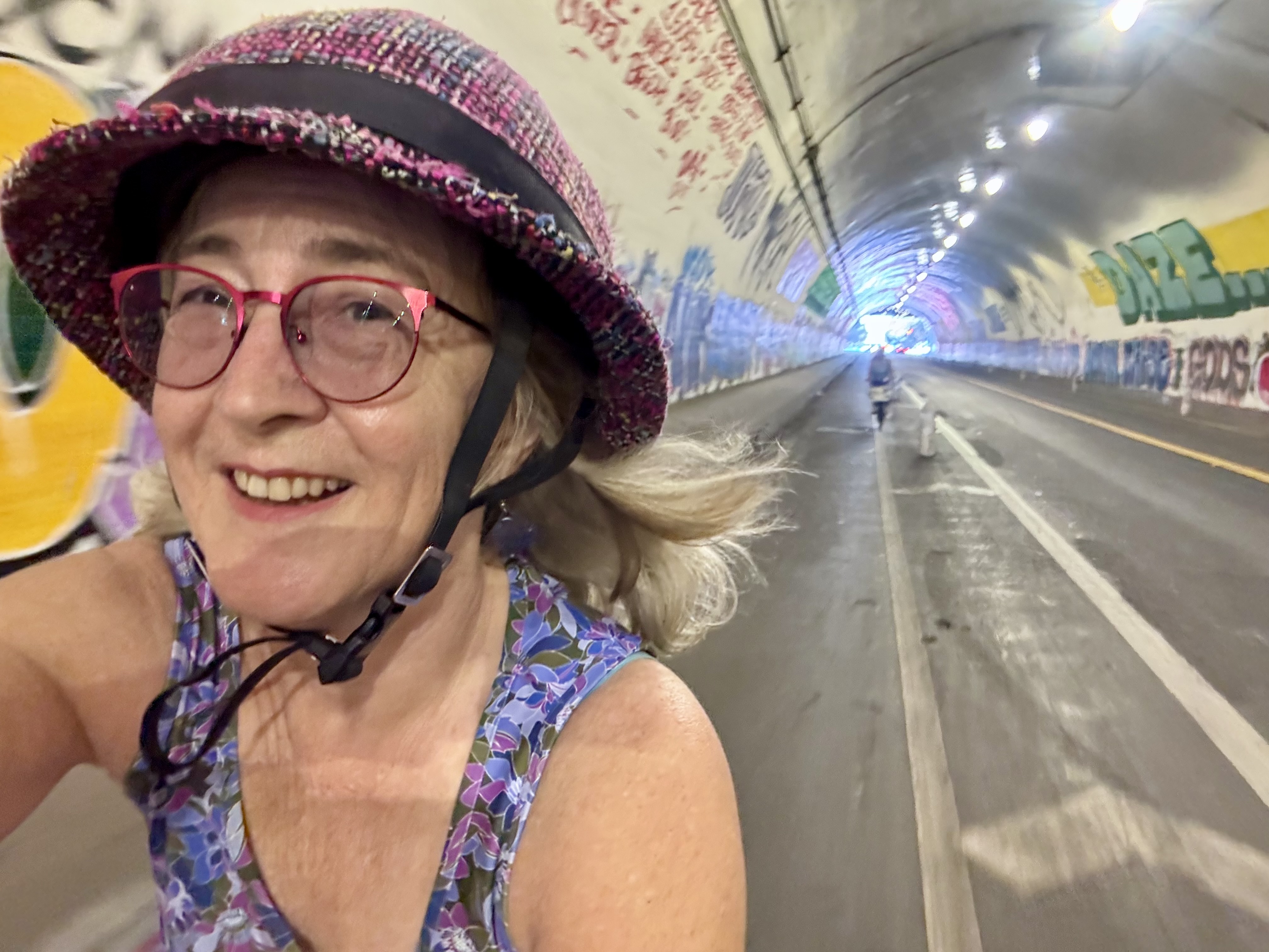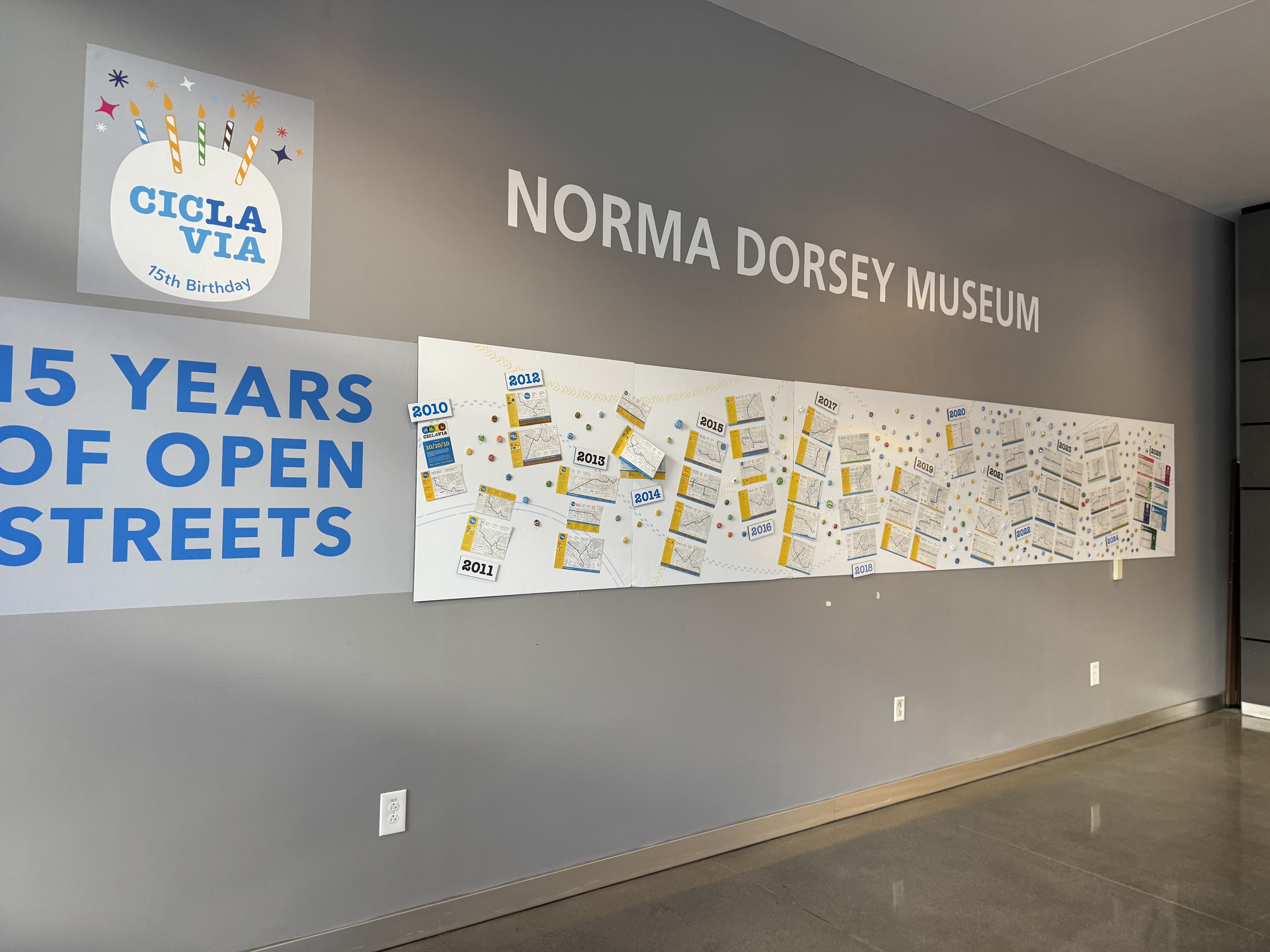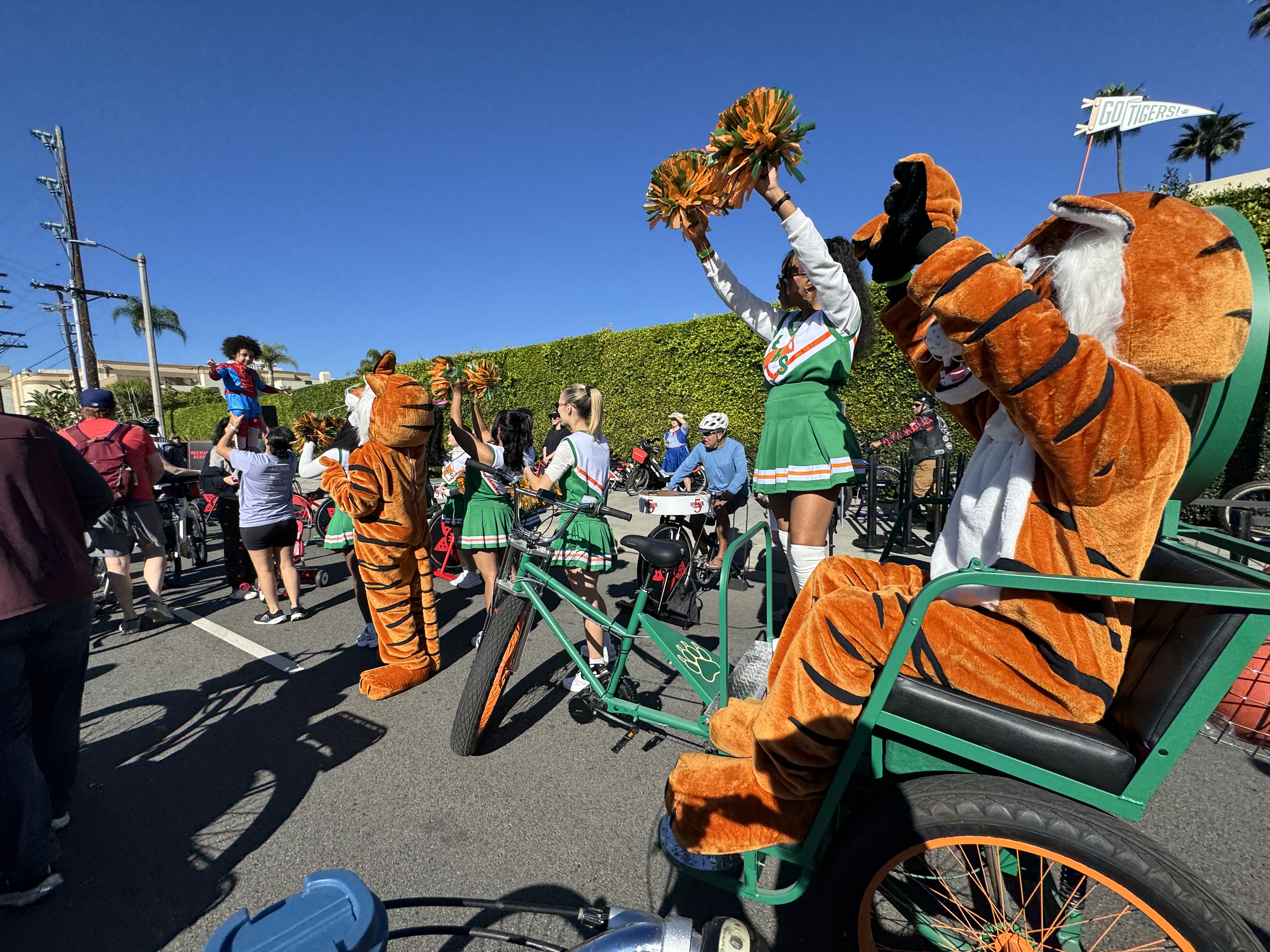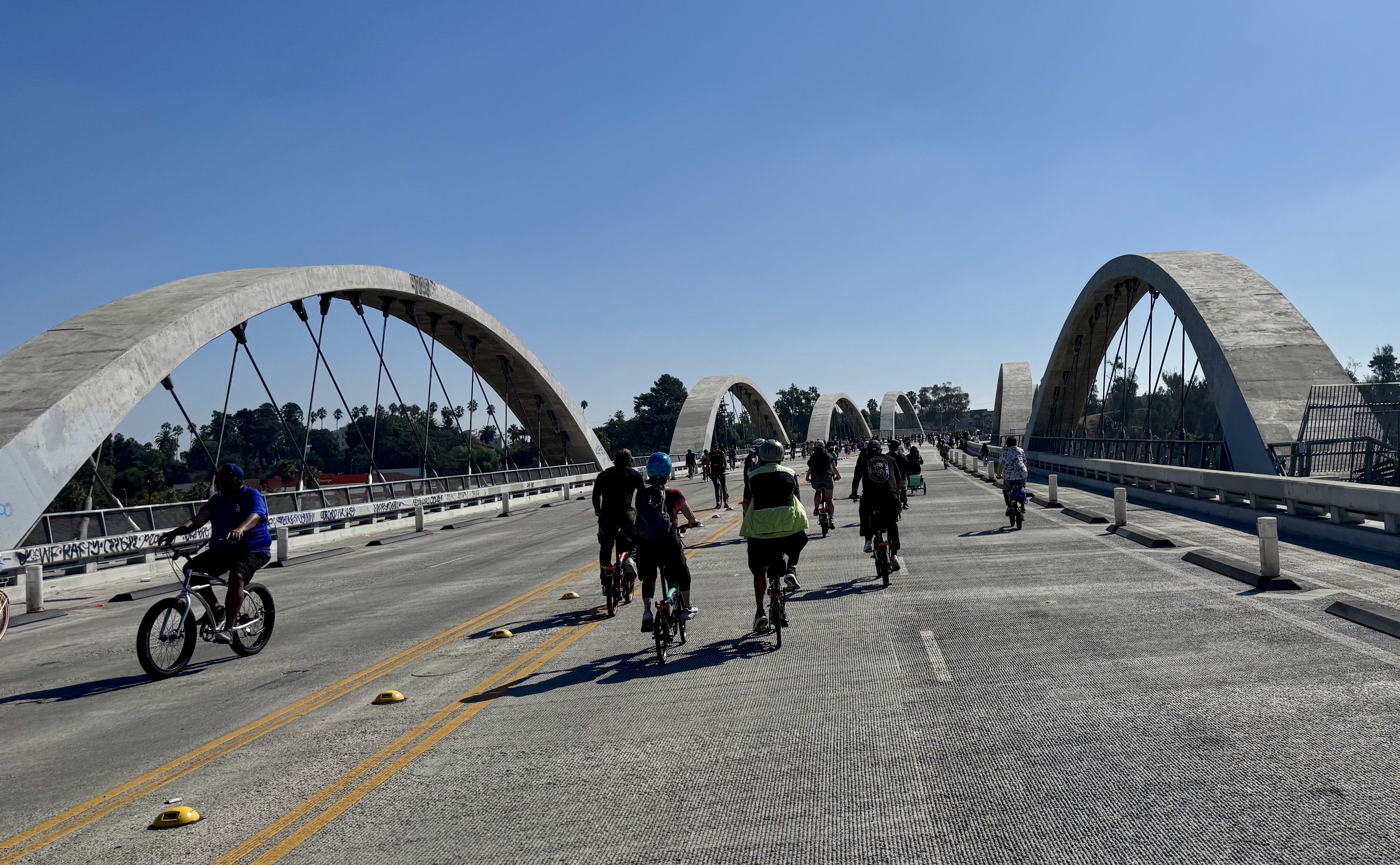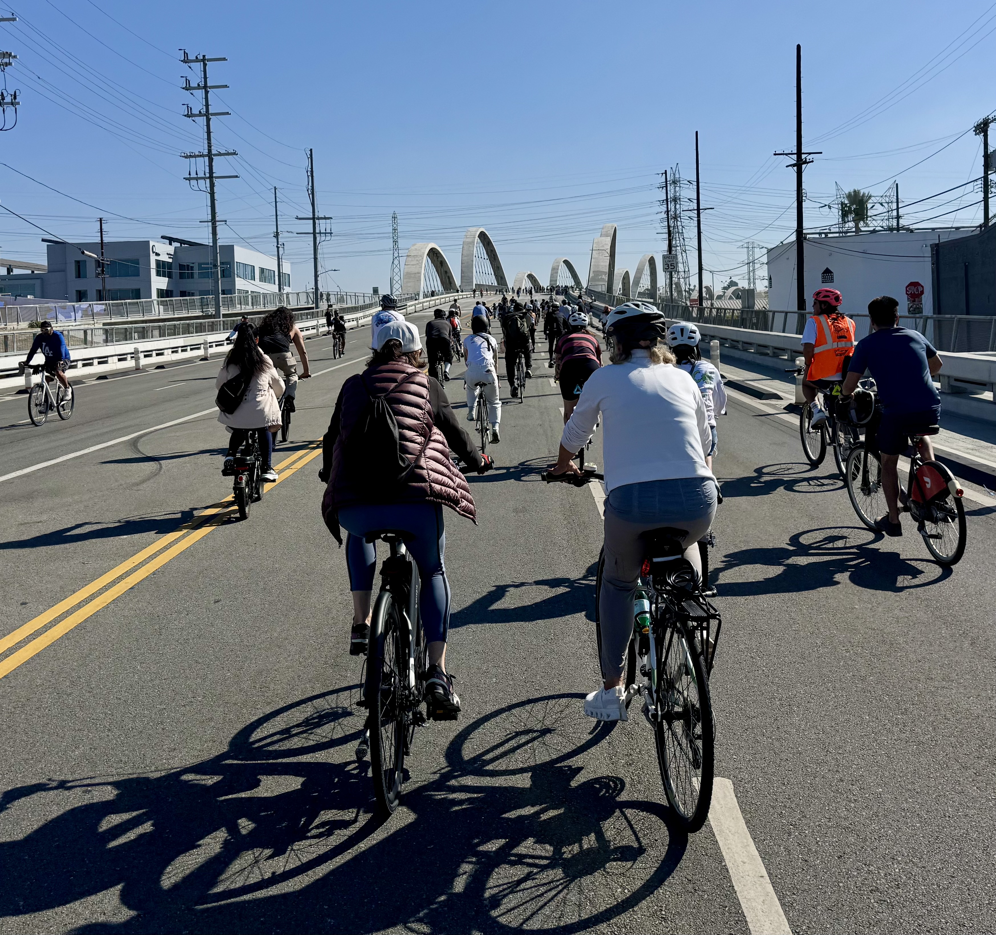 The very next day was another one of L.A.’s iconic open streets events: CicLAvia. Two of my favorite things, CicLAvia and Coffeeneuring are both celebrating 15 years! What an auspicious kickoff weekend for the coffeeneuring season. I celebrated by wearing my Party Pants Bloomers with the tee shirt I have from the very first CicLAvia held on 10/10/10. CicLAvia always means running into my bike friends, and today we got to celebrate a birthday for Lynn. Today’s CicLAvia route (they change to different parts of the city and different routes each time) honored the route of the first CicLAvia, in what is referred to as the Heart of LA route, which centers on downtown, with legs extending out to MacArthur Park to the west, Chinatown to the north, and Boyle Heights to the East.