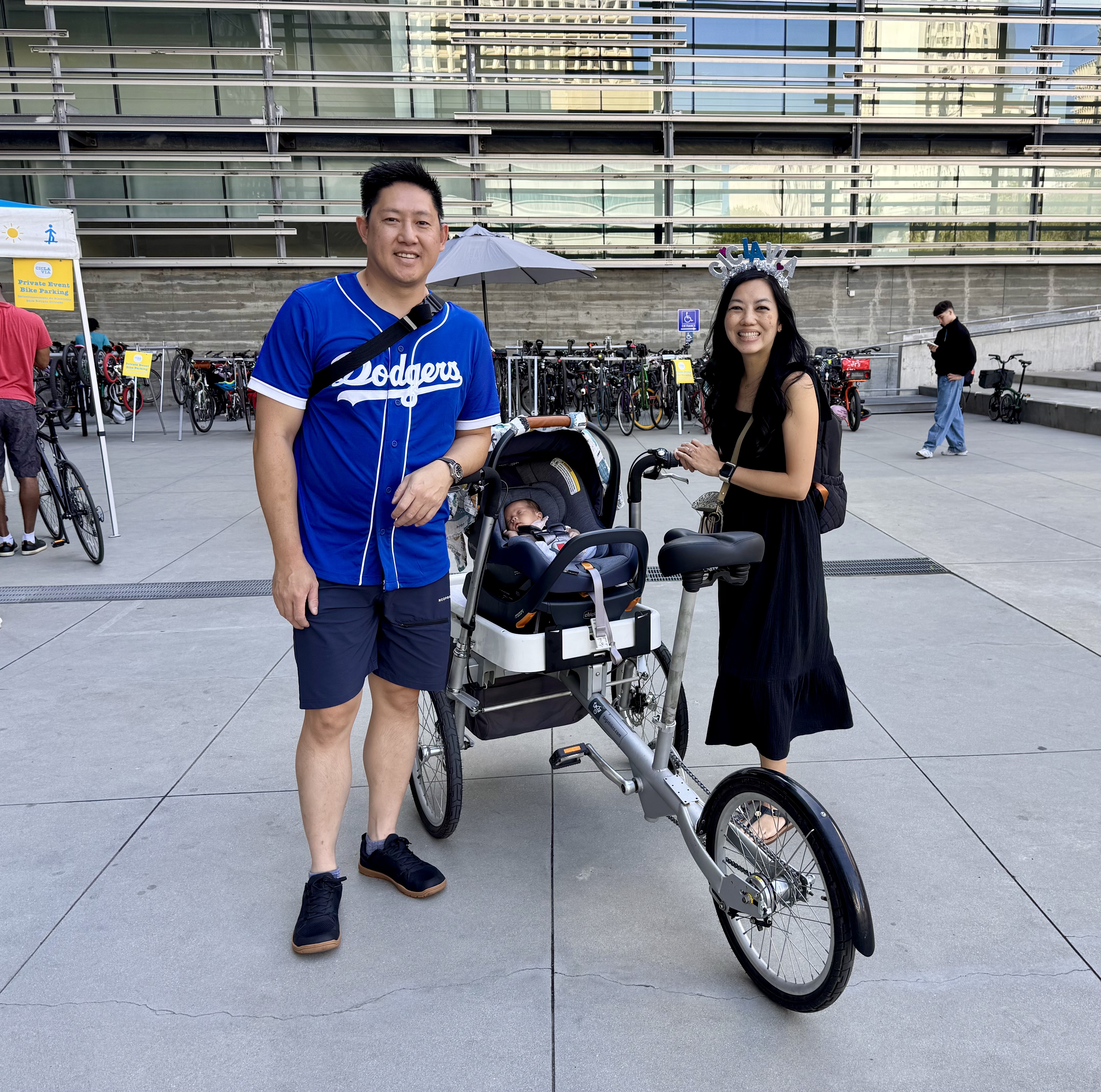 From there, we rode on into Boyle Heights and then doubled back through downtown and joined the CicLAvia “Street Stars” (what they call their monthly donors) for a special celebratory lunch in the courtyard of the CalTrans building. The building has a small museum space off the courtyard that was displaying memoribilia from the 15 year history of CicLAvia events. It’s always fun to hang with bike friends at the Street Stars lunches, but it was especially sweet this time to meet the newest BikieGirl, the baby daughter of one of the most elegant cyclists I know, Serena Liu, a transportation planner with CalTrans. It was also cool to see the cargo bike set up her husband had created for carrying their baby.