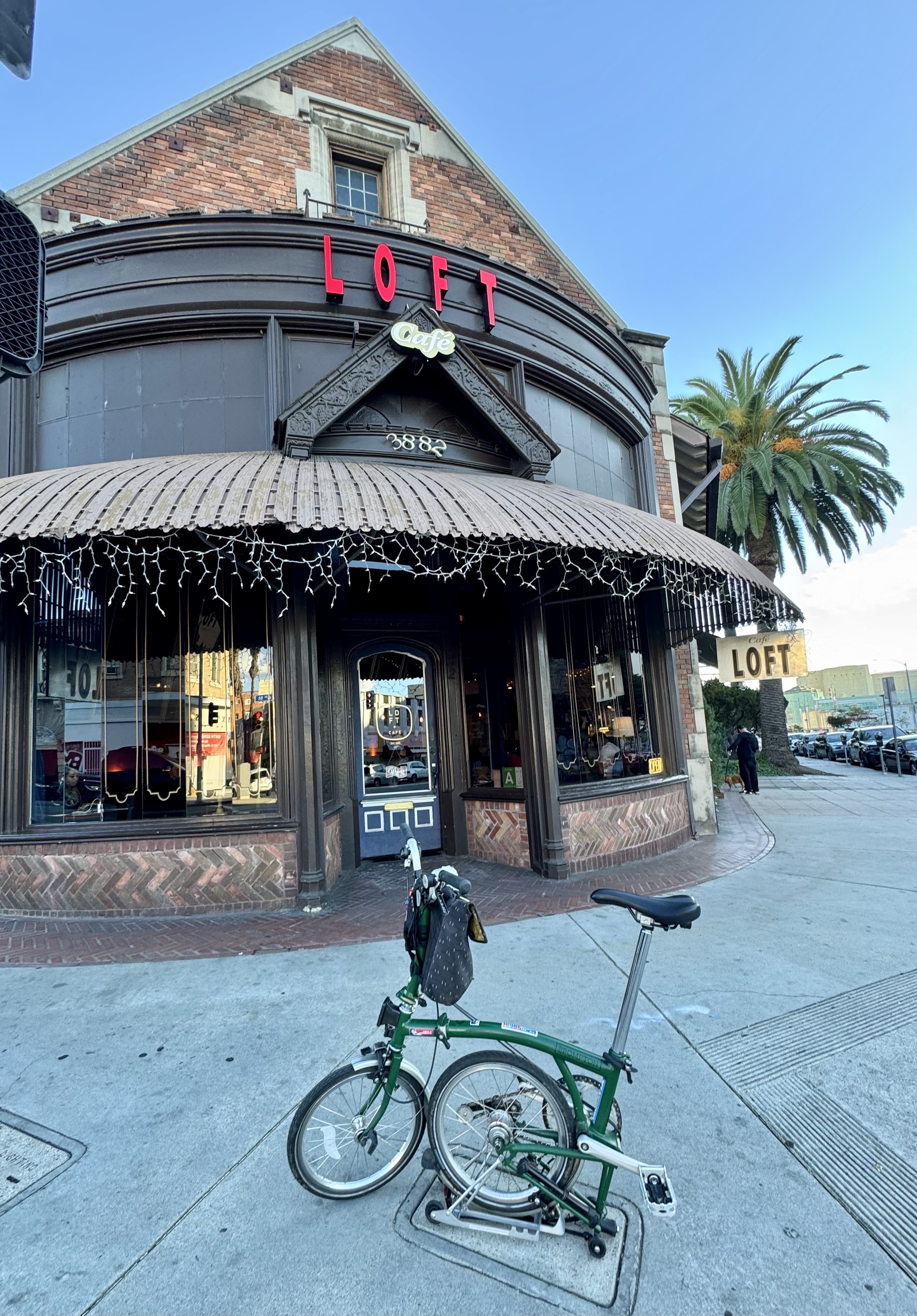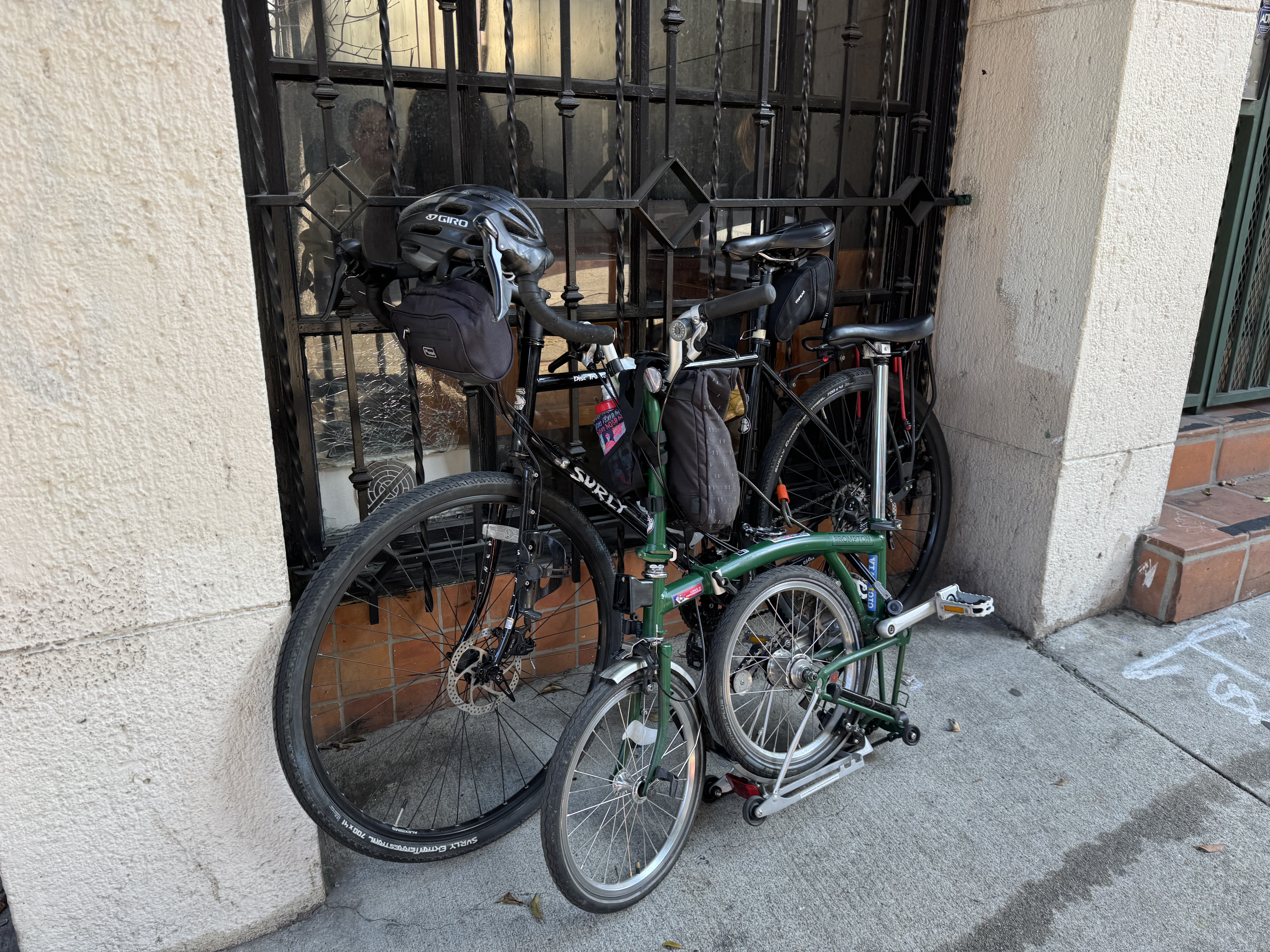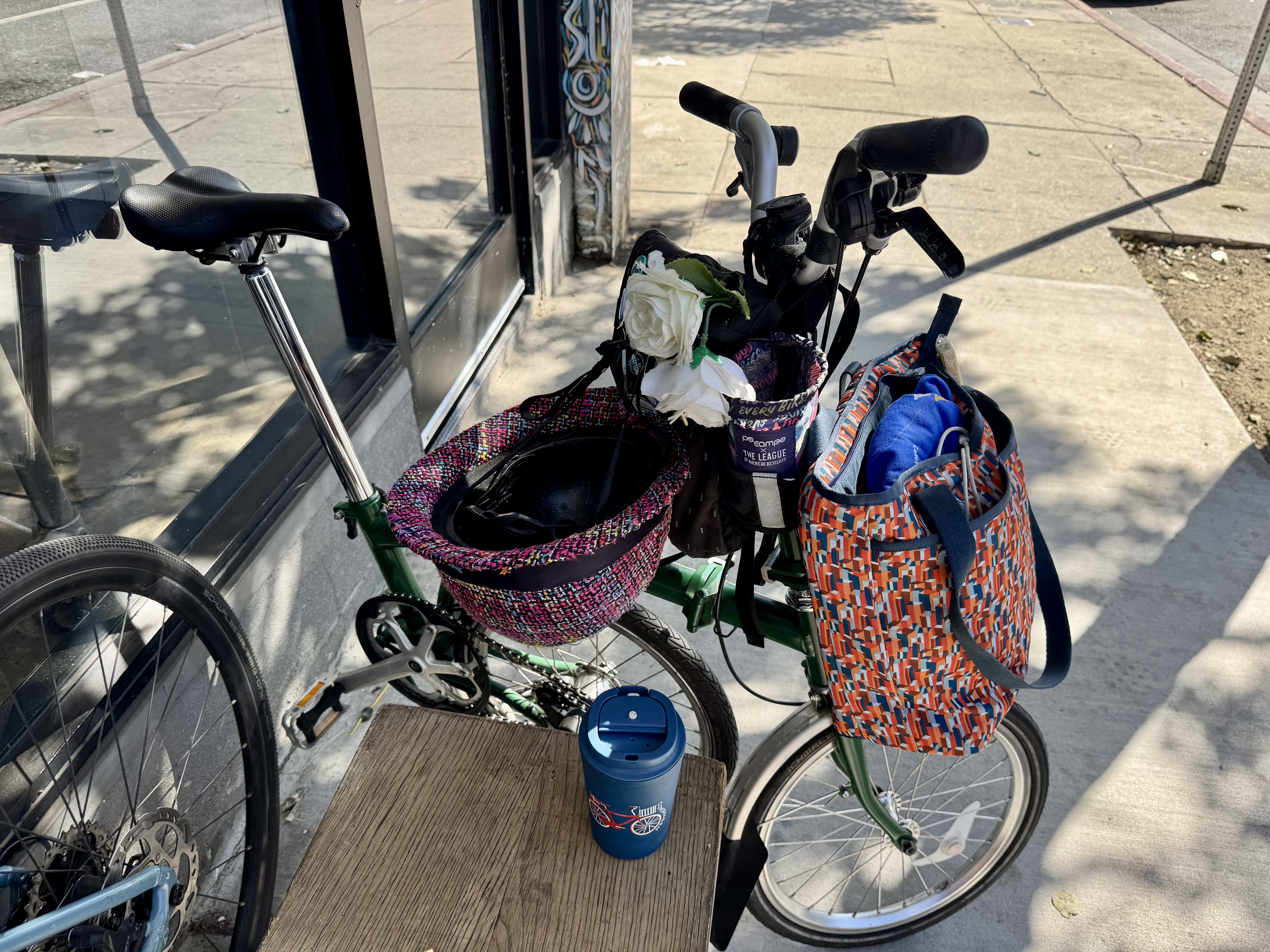 I hopped on the Brompton, hoping that I’d be able to roll my bike inside since Koreatown is known as a hotbed of bike theft and I did not know what the bike parking situation would be. That worked out nicely, as no one complained when I rolled it inside and on out to the back patio. There was even a nice little space near the back door and near an open table where I could park it while I enjoyed my beverage. I had a honey latte that was a nice sweet reward after a day of tackling a dusty room full of junk.