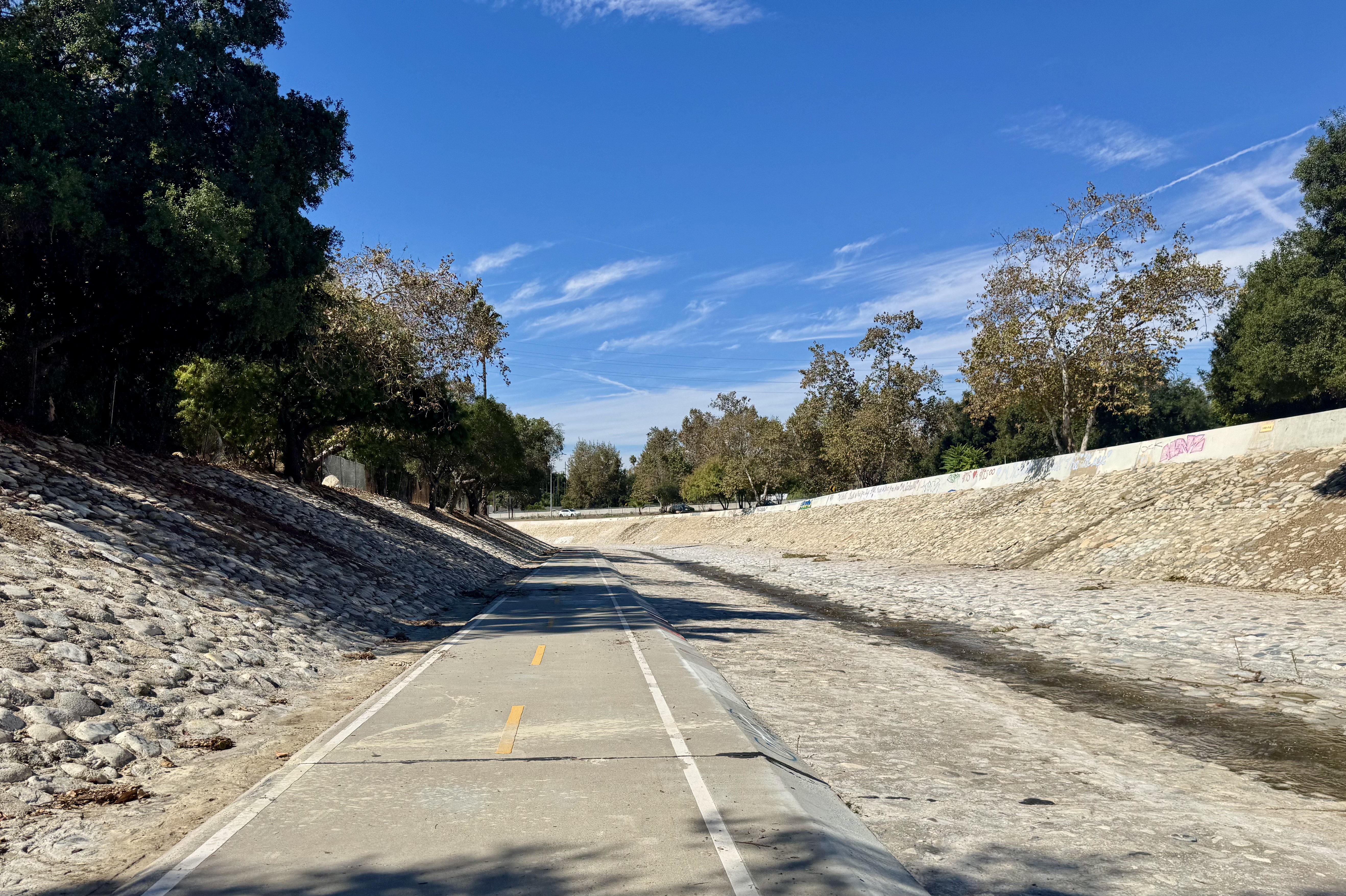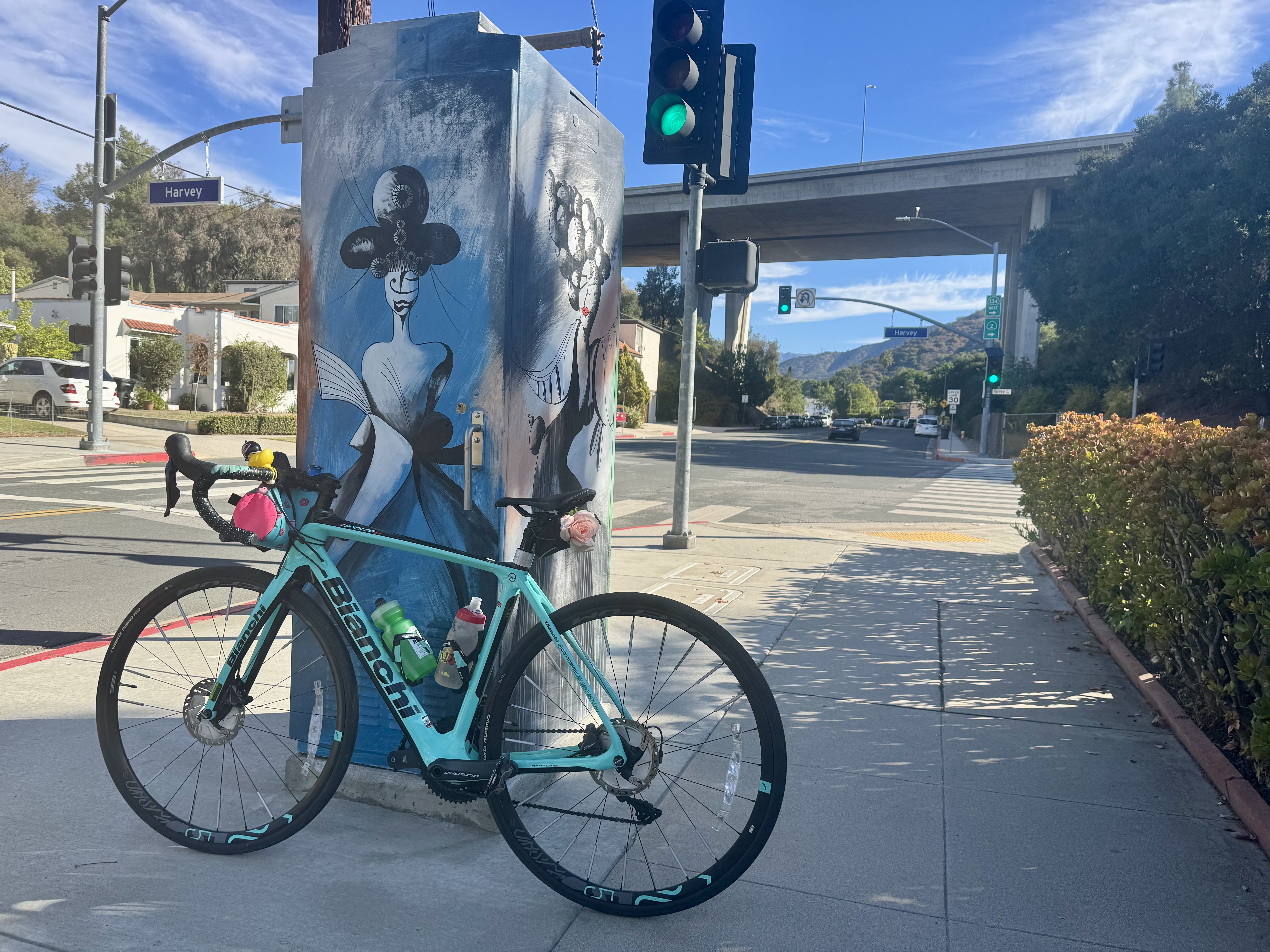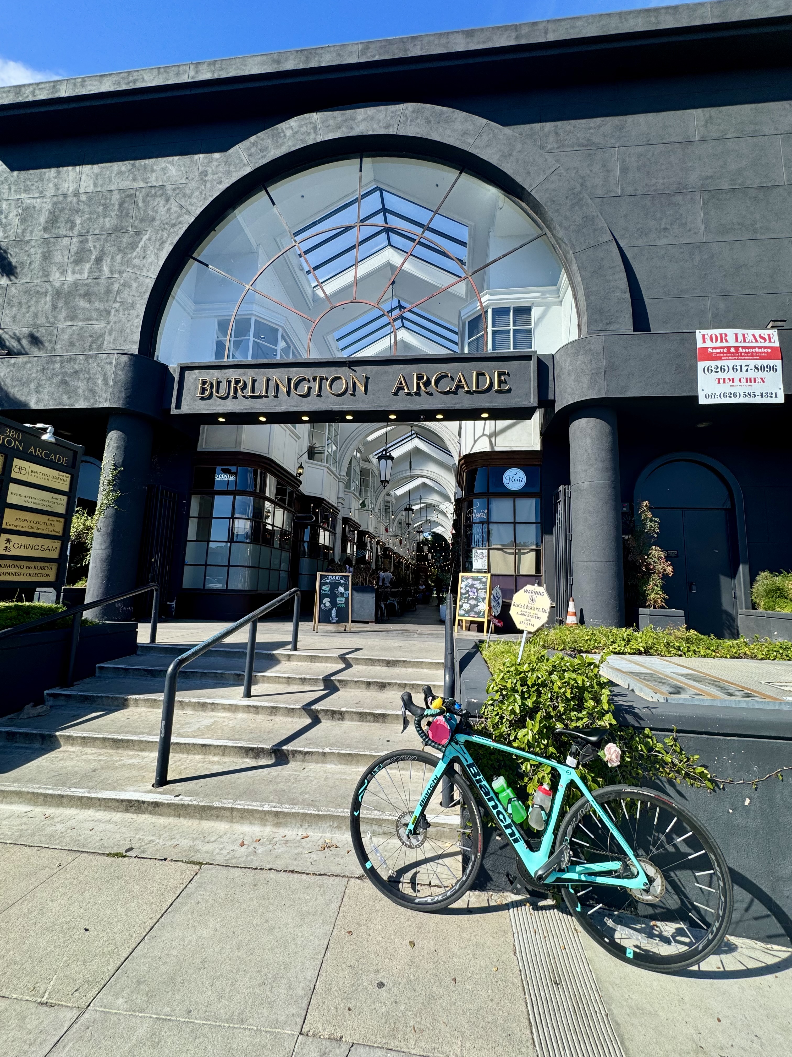 Another find from that Instagram post I’d seen listing beautiful coffee shops was Float, located in the Burlington Arcade in Pasadena. That one called to me. I love biking to Pasadena, as there are some beautiful streets to bike on out that way, and I had a hankering for a longer ride that day. And to stop in an old-timey looking coffee shop in an old-timey looking arcade? How is it I’d never heard of this place before? So off I went, and not in the most direct route, no. I embraced the opportunity to plan my route by first hopping on the L.A. River bike path so I could cross the “witch’s finger” bridge, more properly known as the North Atwater Bridge or the La Kretz Crossing, and then taking what I think of as the reverse Chevy Chase route. You see, Chevy Chase Drive winds through the hills between the Rose Bowl and Glendale. I had ridden that route multiple times going west from Pasadena to Glendale and found it quite enjoyable. But one day, we rode it from Glendale to Pasadena and discovered some beauty we had rolled through to quickly when going downhill on the Glendale side. I wanted to ride it going east again and savor that scenery.