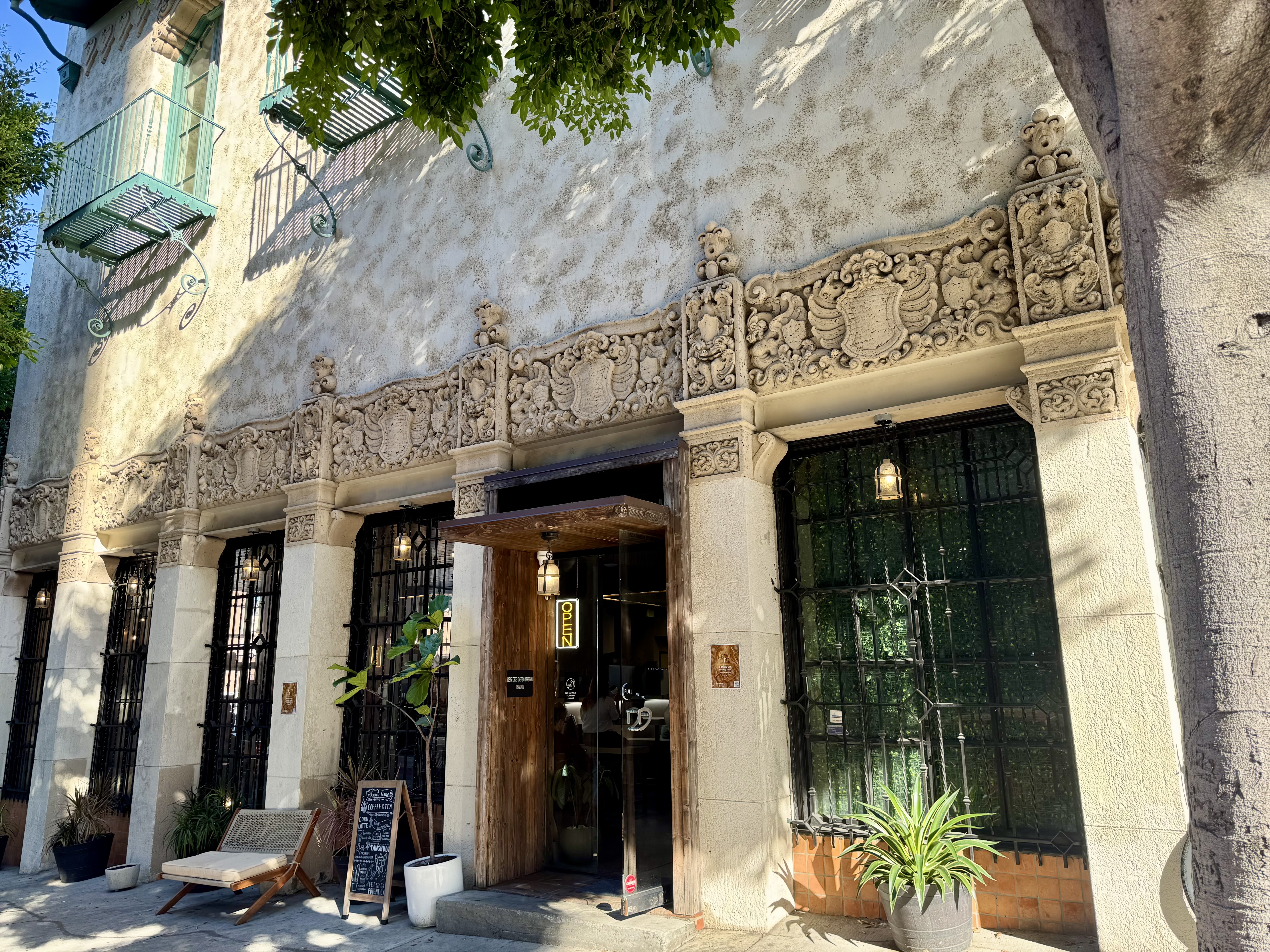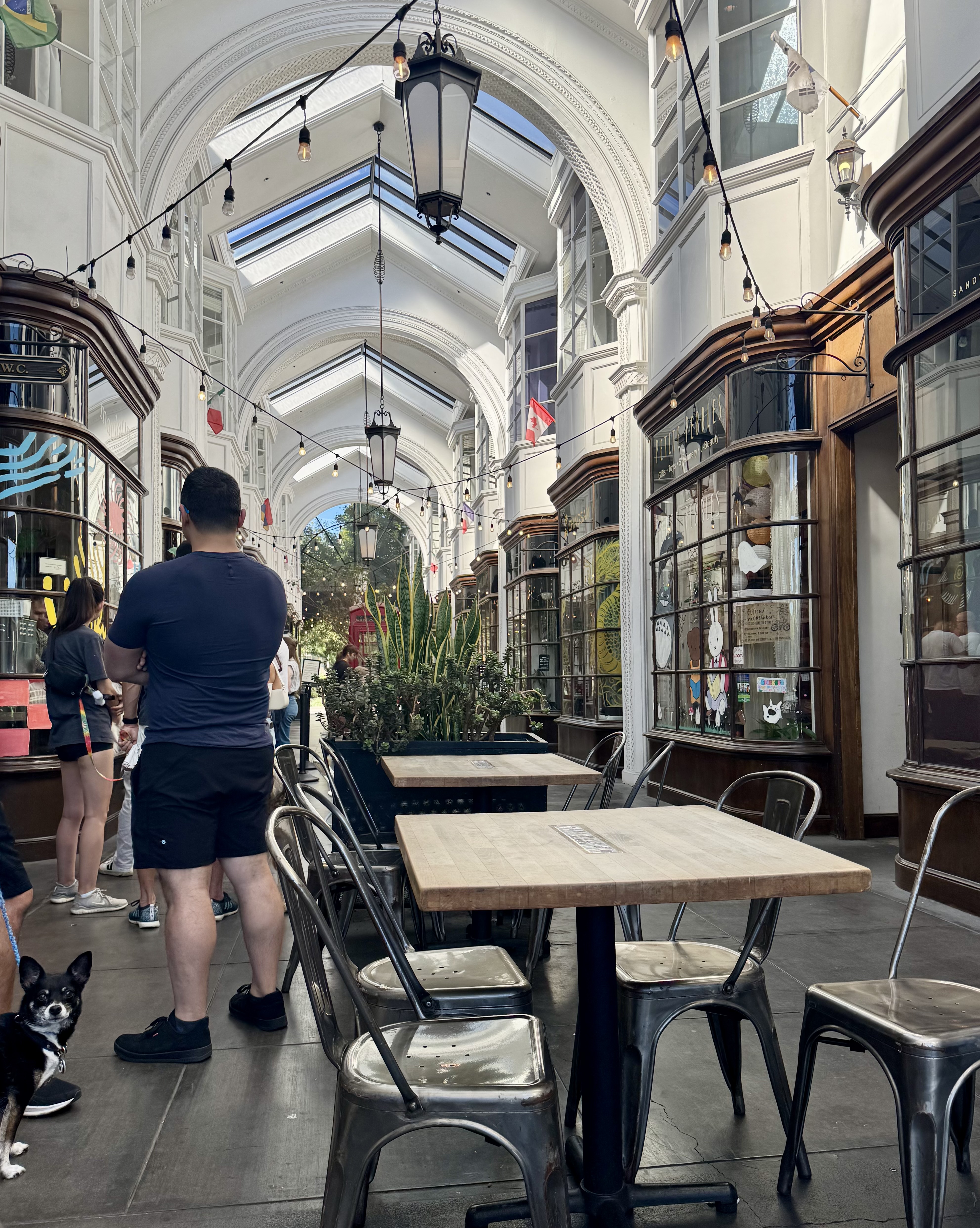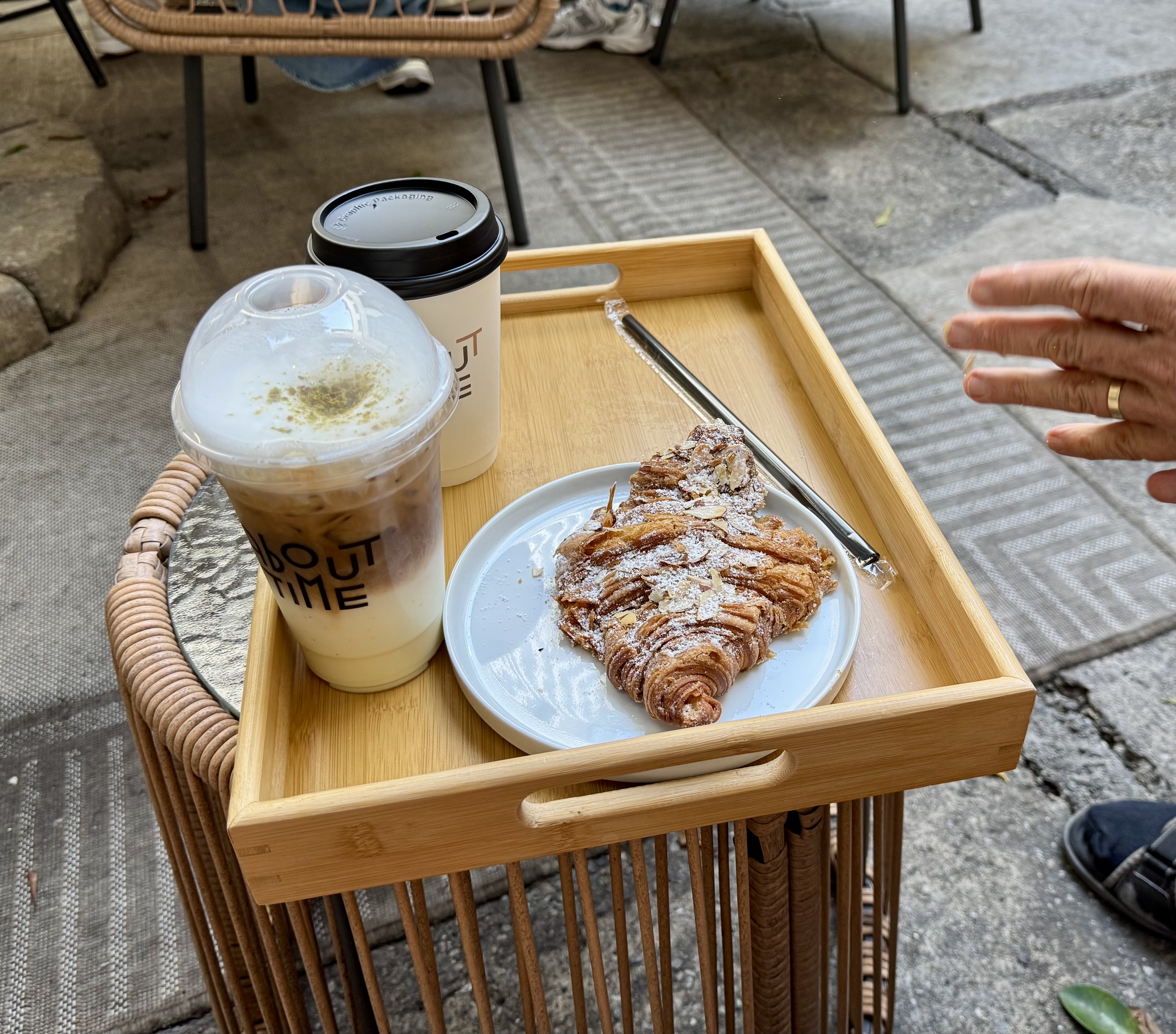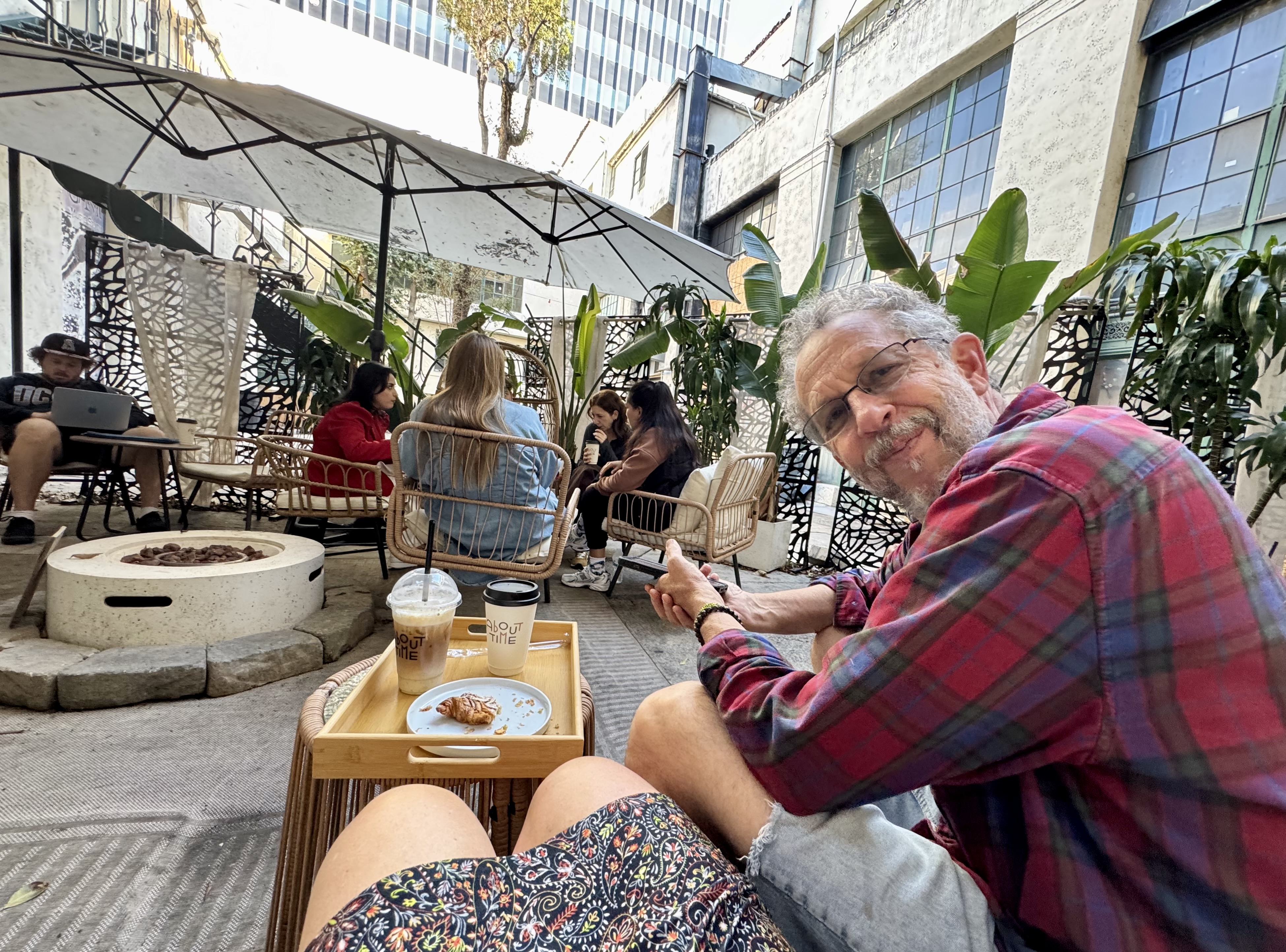It’s an extraordinary place, both inside and out. The exterior features an ornate, historical facade. The interior is spacious and filled with chic, modern decor. There is a lot of indoor seating, although much of it appears to be taken up by folks who set up their laptops and spend the day there. The menu is a bit overwhelming and rather pricey. I treated myself to a pistachio latte ($9) and El Cochinito had a mocha ($8), and we shared an almond croissant. We found a place to sit on the patio that takes up a portion of the buildings courtyard. Most of the courtyard looks rather industrial and sadly neglected, but the portion About Time uses is set up rather attractively with umbrellas and bamboo furniture.