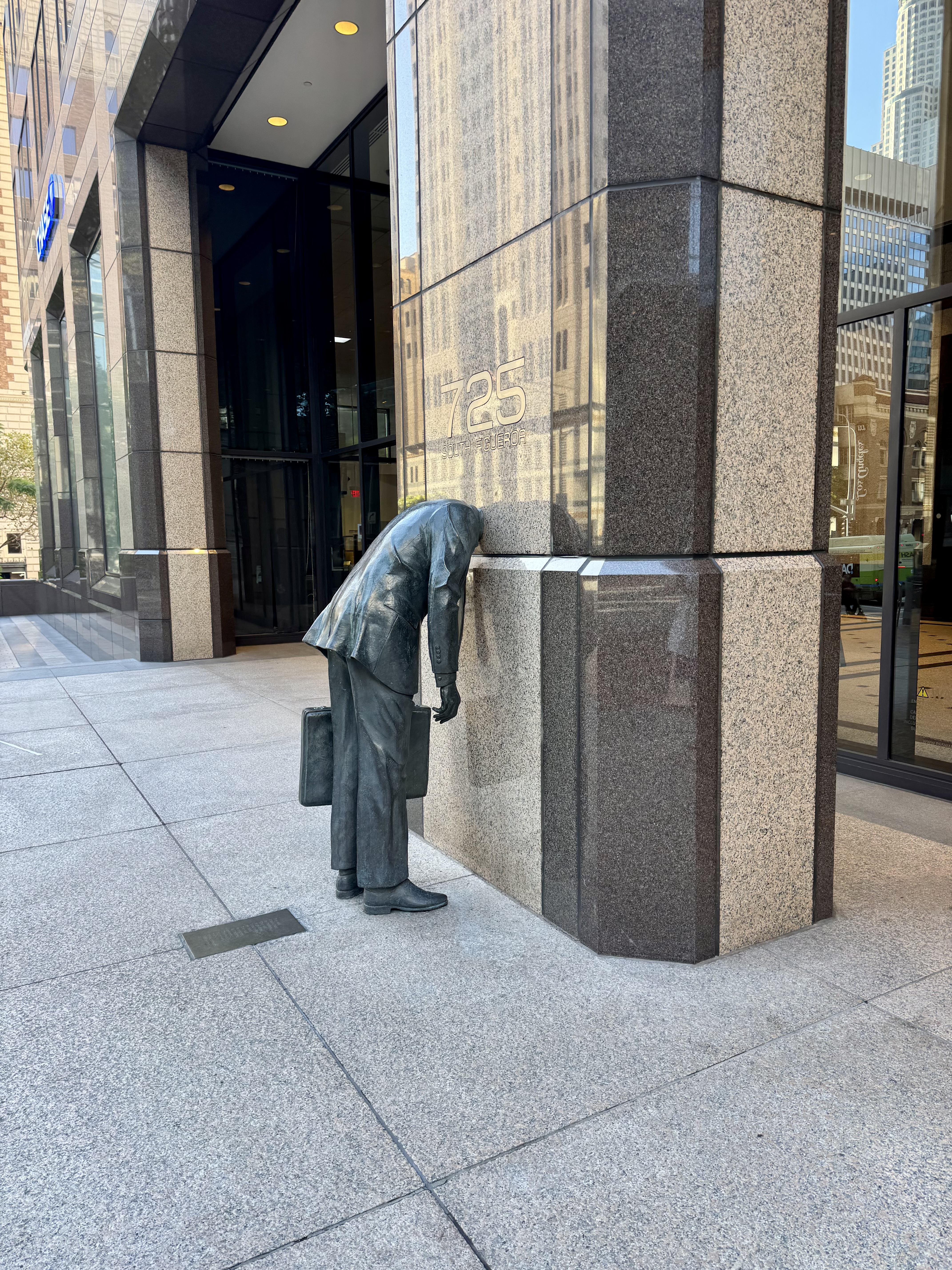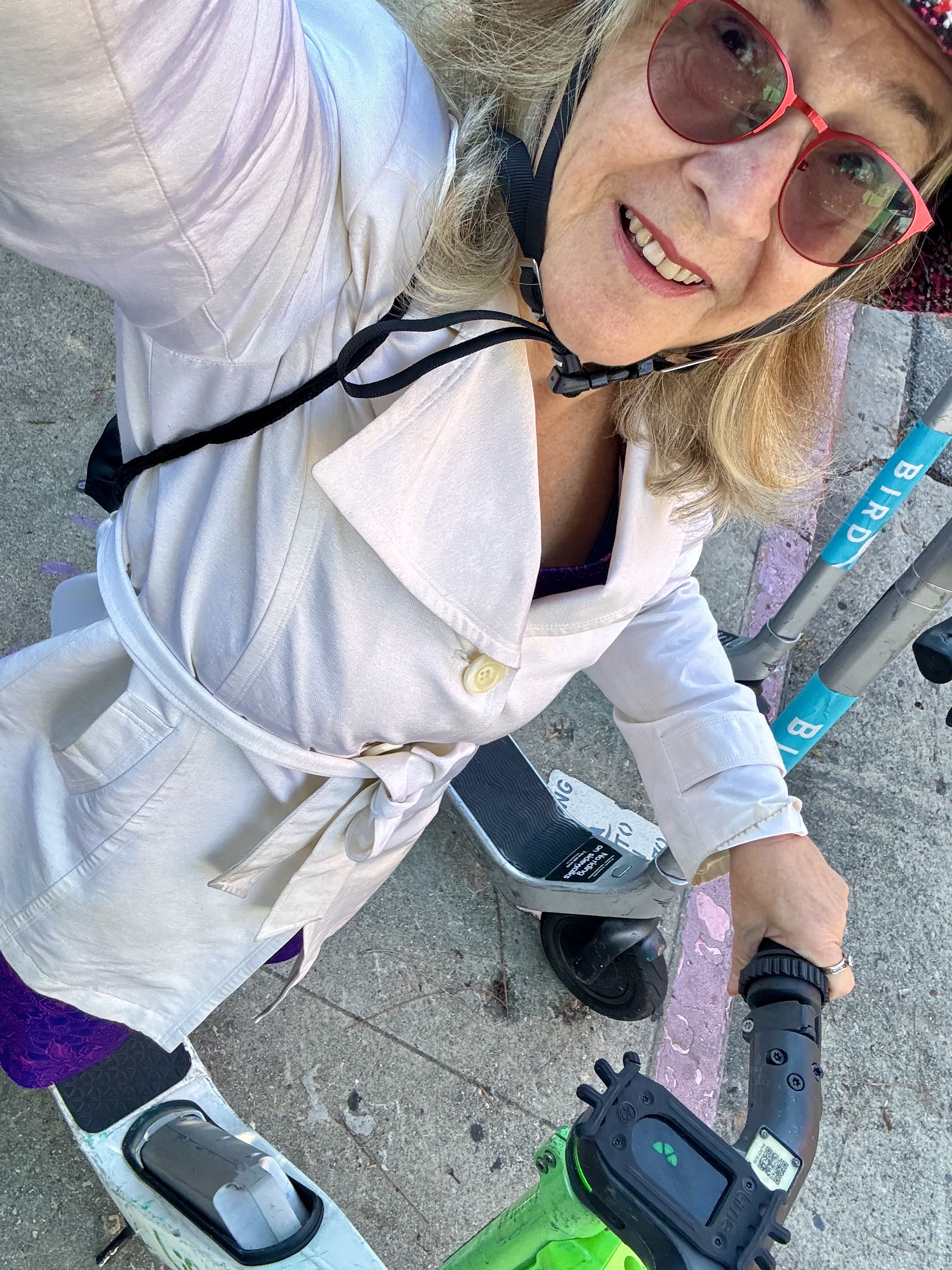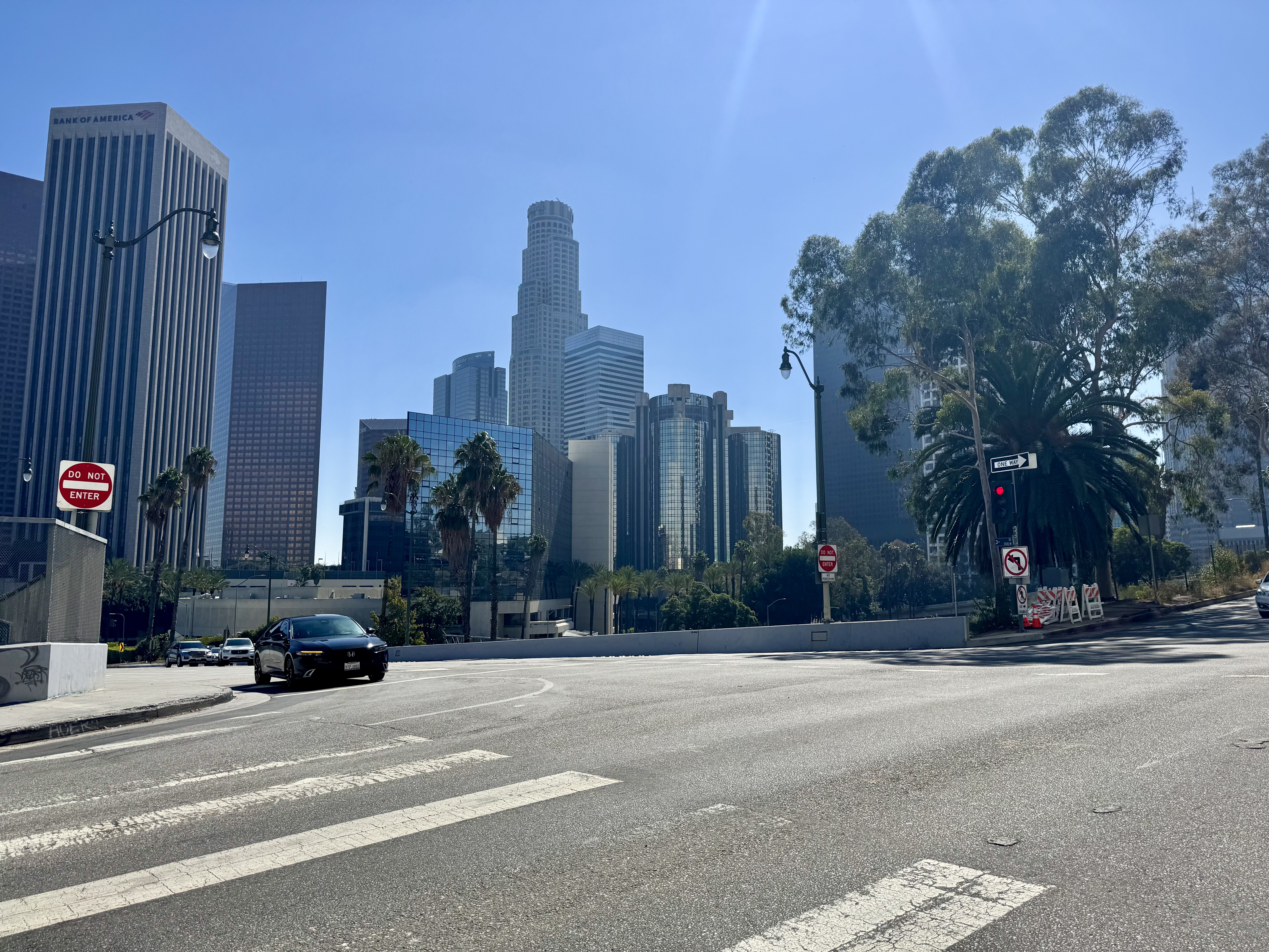 First I walked a quarter of a mile to get to the bike share station closest to my house. As I was riding into downtown, it occurred to me that I might not make it all the way to Quest before the allotted 30 minutes of free riding expired, so I decided to stop as I passed a docking station just before downtown to “re-charge” my rental. Unfortunately, I didn’t stop to consider the warning message I had seen in the app that some stations would be unavailable that day. So when I docked the bike, I discovered that the docking station was out of service, and that I could not check out my bike, or any other bike, due to the non-functioning dock. Oops. So I started walking briskly, but after a block or so, I realized I was never going to make my 8:30 appointment if I just walked the rest of the way. As I approached 7th & Figueroa, I felt a kinship with the statue there of a man in a suit carrying a briefcase with his head lodged inside the exterior of the office building. But at that corner, I also saw some Lime scooters, and figured that would be the way to get myself over to Quest in time. I’m not real confident and comfortable on those e-scooters, but at least I had my helmet and access to bike lanes for the entire 1.2 mile journey.