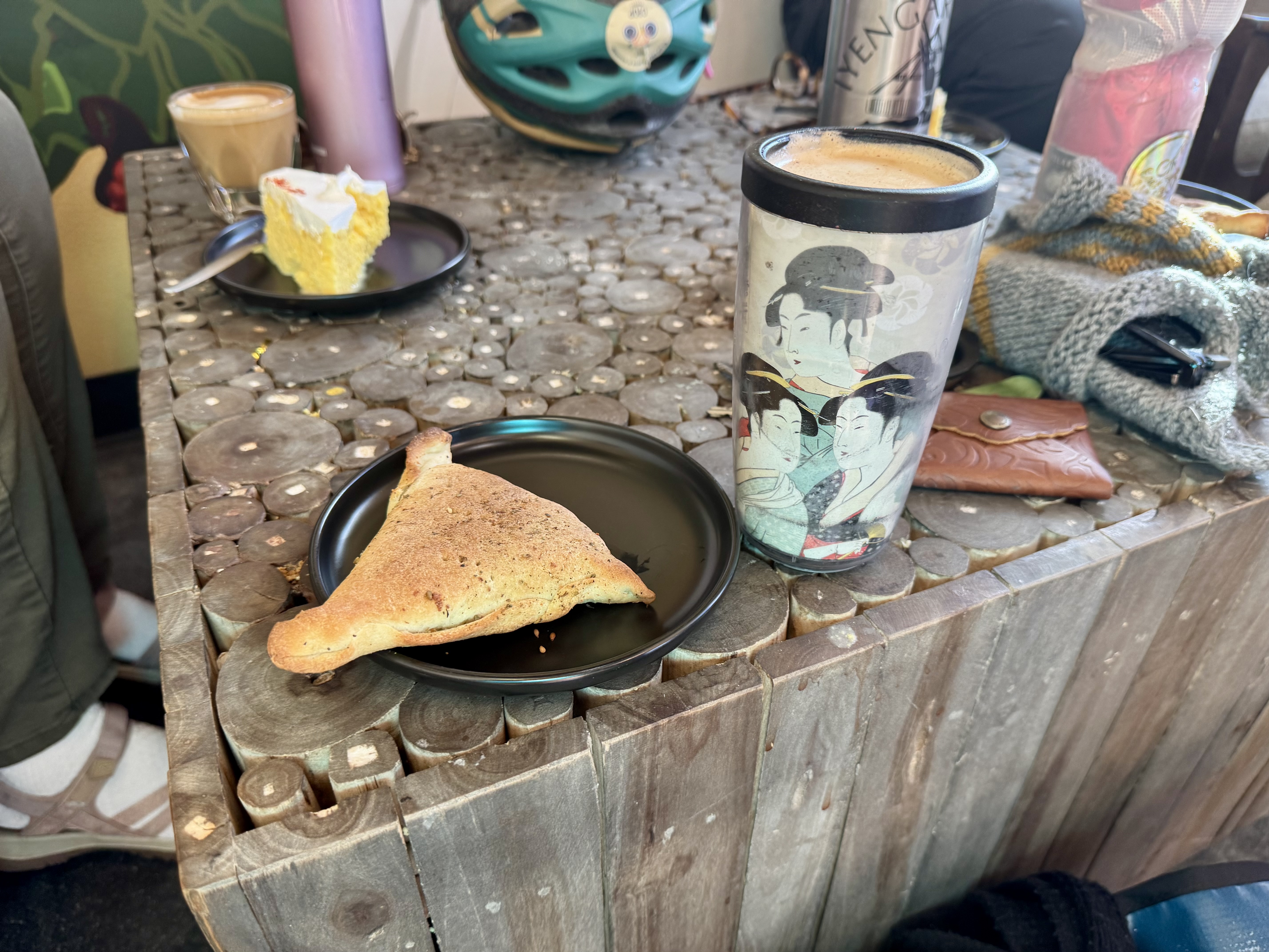 This was a social ride organized by Women on Bikes Culver City, one of their twice-monthly group rides to a coffee shop. I was so happy to discover this new-to-me coffee shop that is worthy of inclusion in a list of beautiful places to drink coffee. The space is unusual: a large, open space with a very high ceiling and contemporary decor. We sat in an attractive seating area in the main “lobby” near the coffee & pastry bar, but the place has additional seating in an upstairs area, as well as on the opposite side of the coffee & pastry bar. Qamaria Yemeni Coffee Co. offers some tasty treats. I loved my Qamaria Latte, spiced with cardamom and cinnamon, and zaatar fatayer (a savory hand pie).