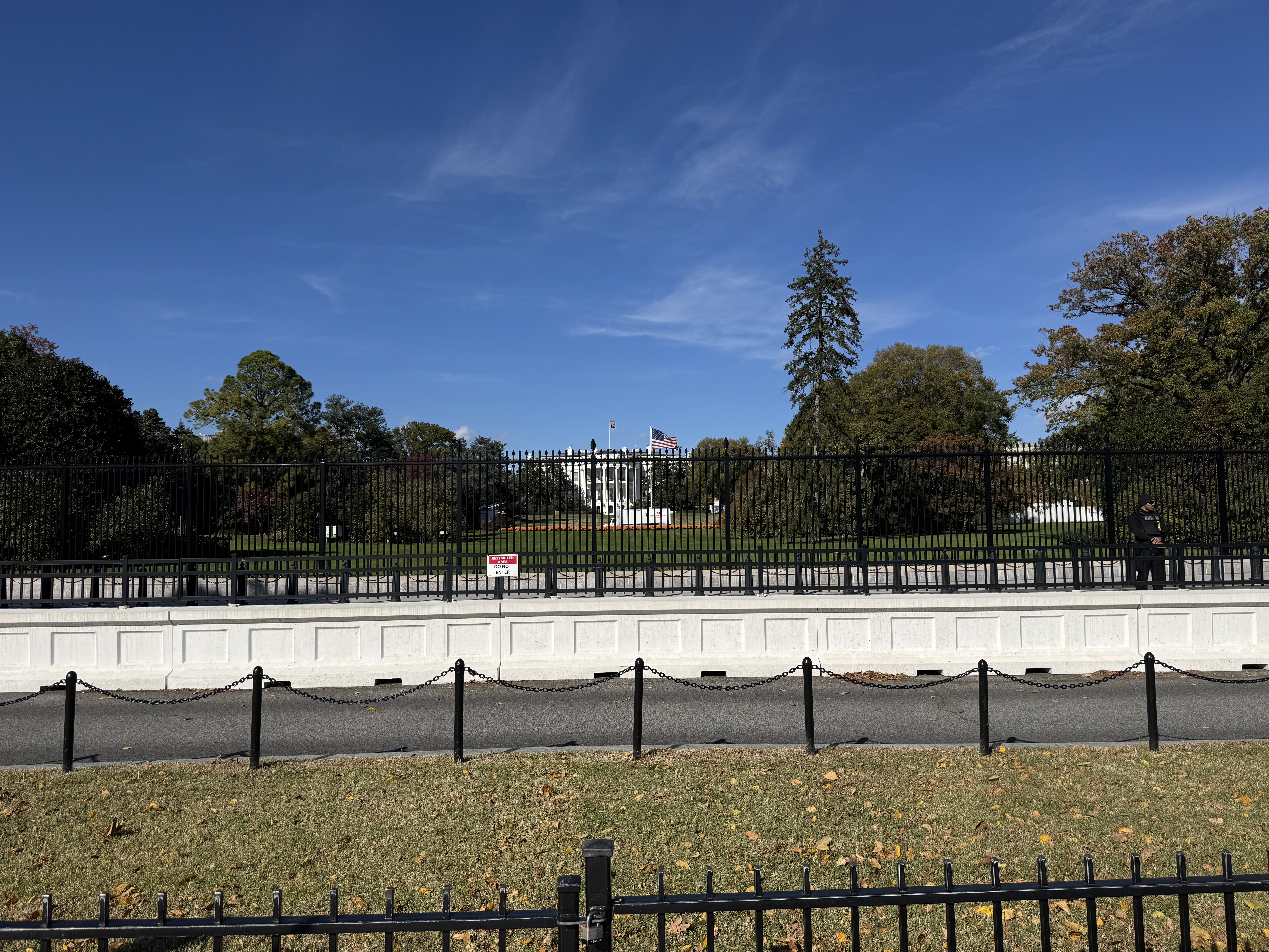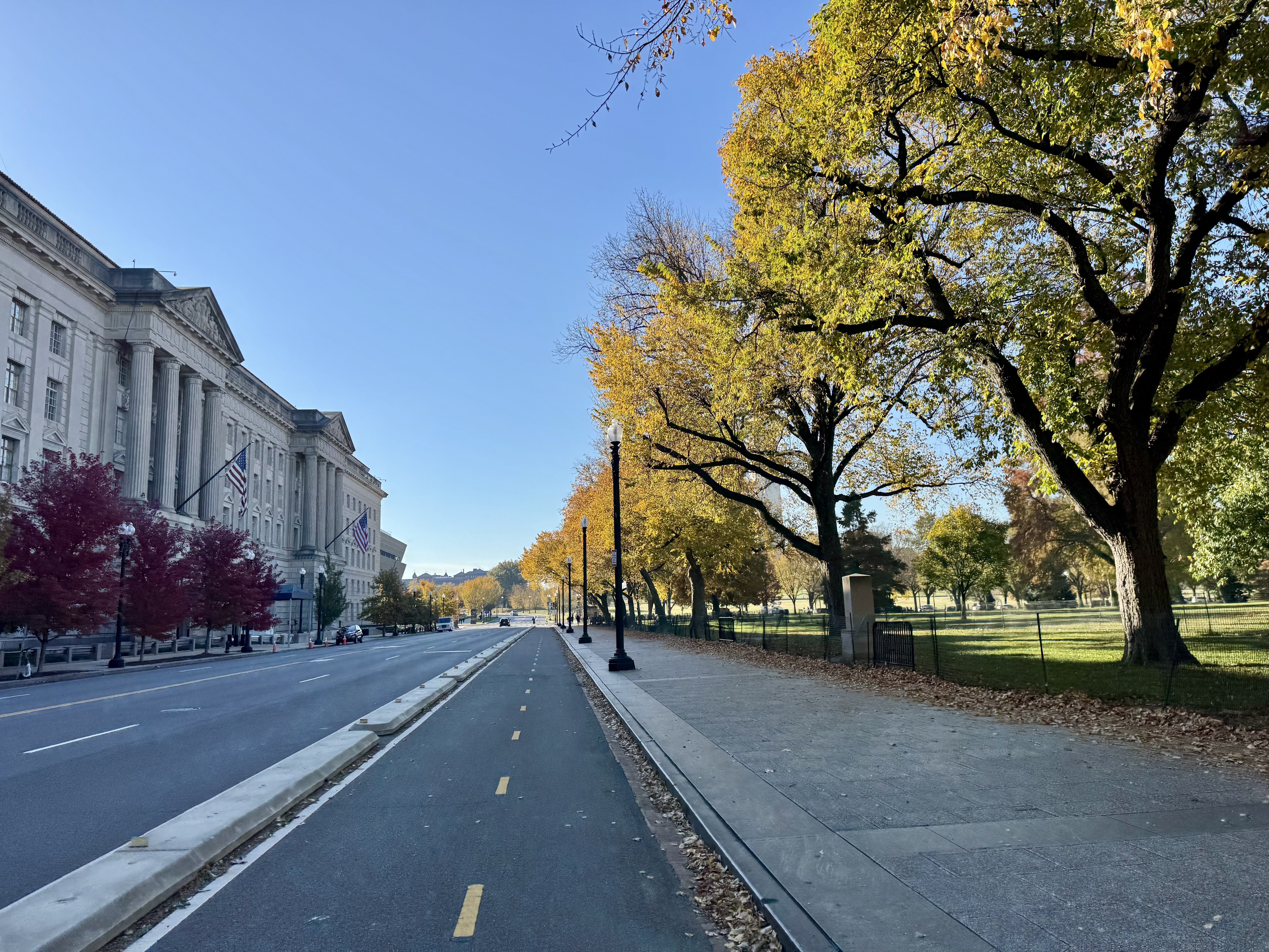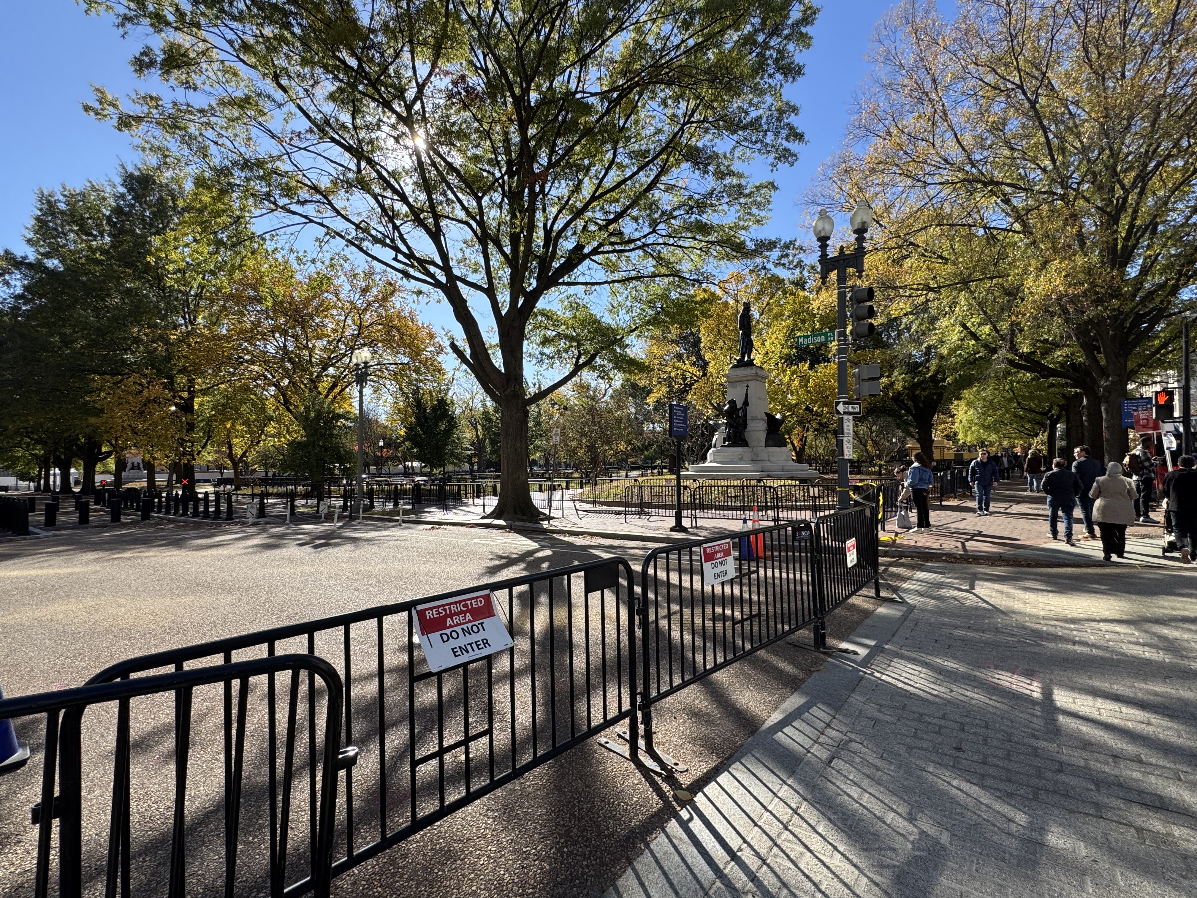 Afterward, Emilia was ready to just walk the few blocks back to our hotel, while I was eager to complete my intended route and biking mileage. So we parted ways and I walked over to a different bike dock alone and found me a fresh ride. From there, I rode through Chinatown and then along the Mall toward the White House. This allowed me to snap selfies in front of key landmarks as part of a game set up by the meeting organizers to get us out and seeing the sights of our nation’s Capitol. I wanted to roll by the White House because a hot topic in the news at the time was the demolition of the East Wing, and I was curious to see what was going on. Of course, the entire east end of the White House grounds was walled off and nothing could be seen other than some cranes that were taller than the walls. I was also saddened to see that the access to the street that runs in front of the White House was completely blocked off from the east side, as was Lafayette Square Park.