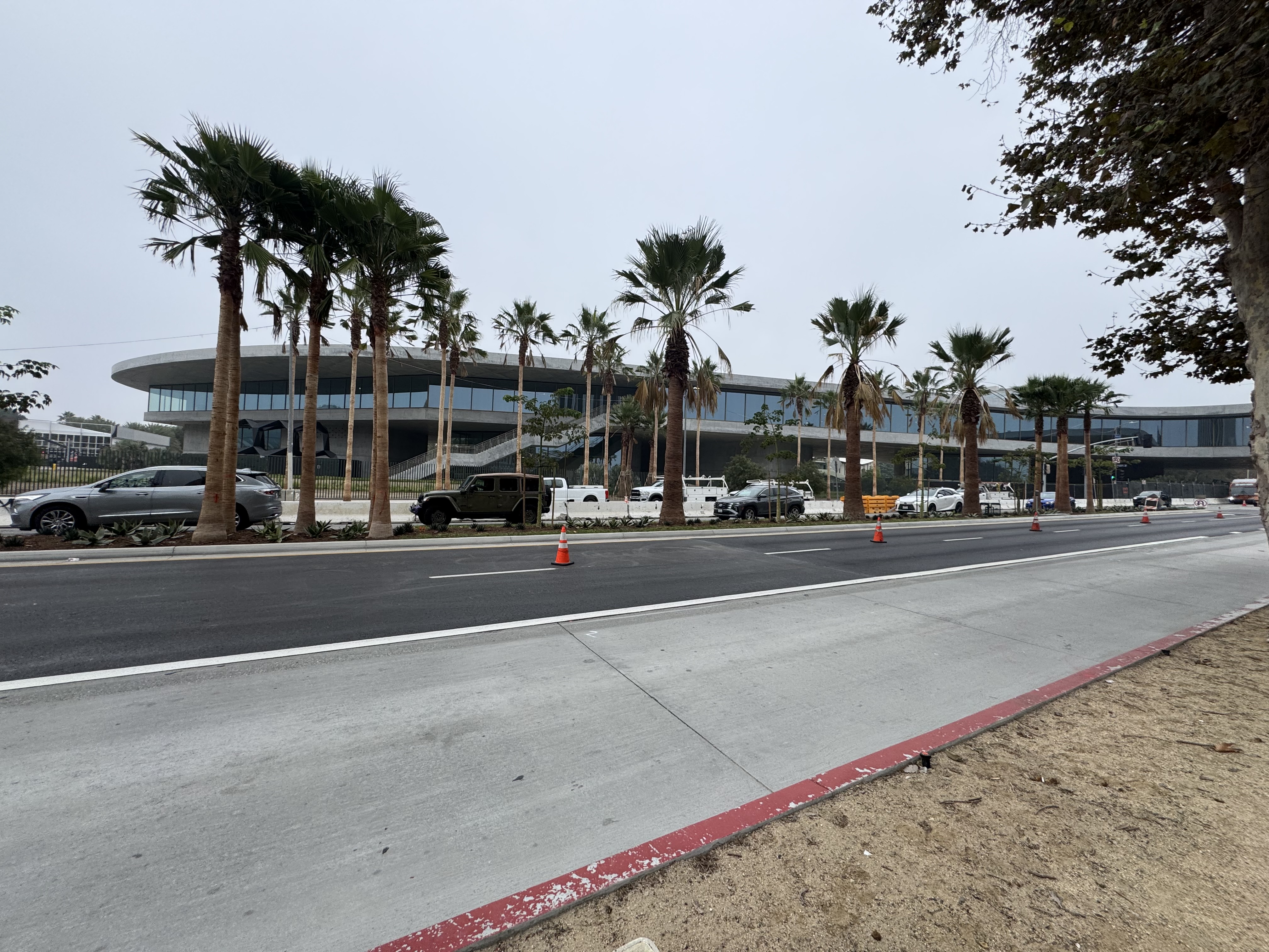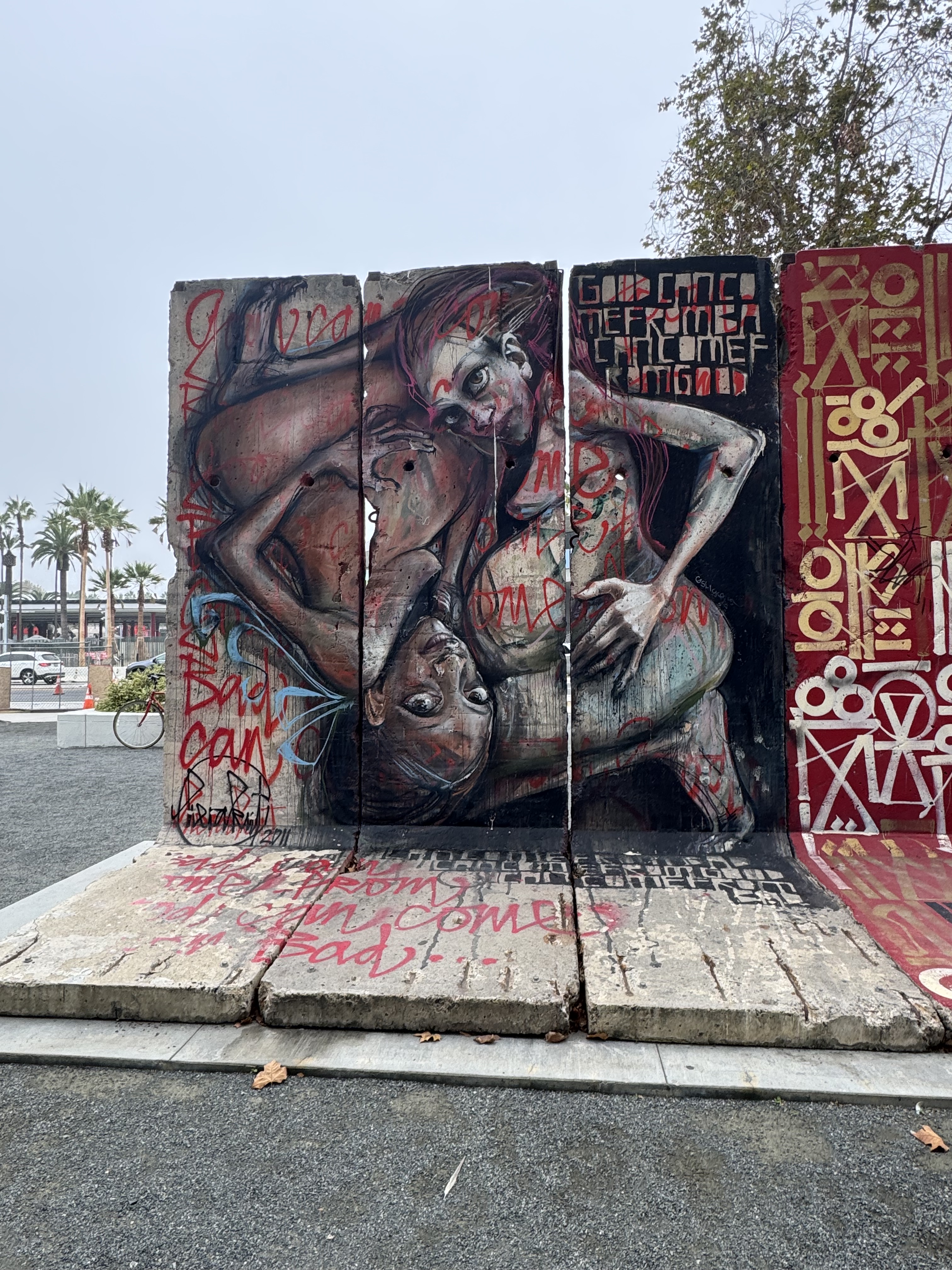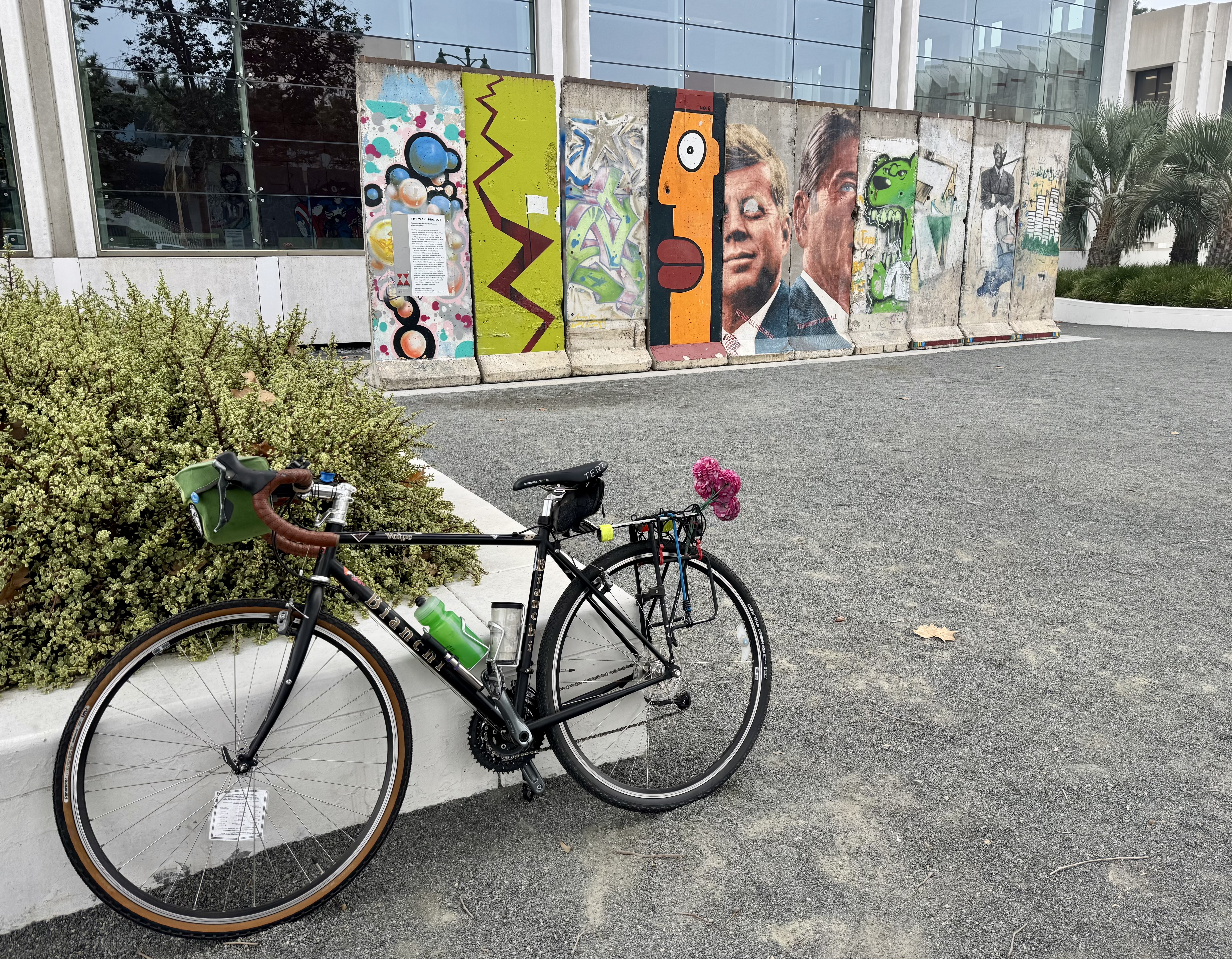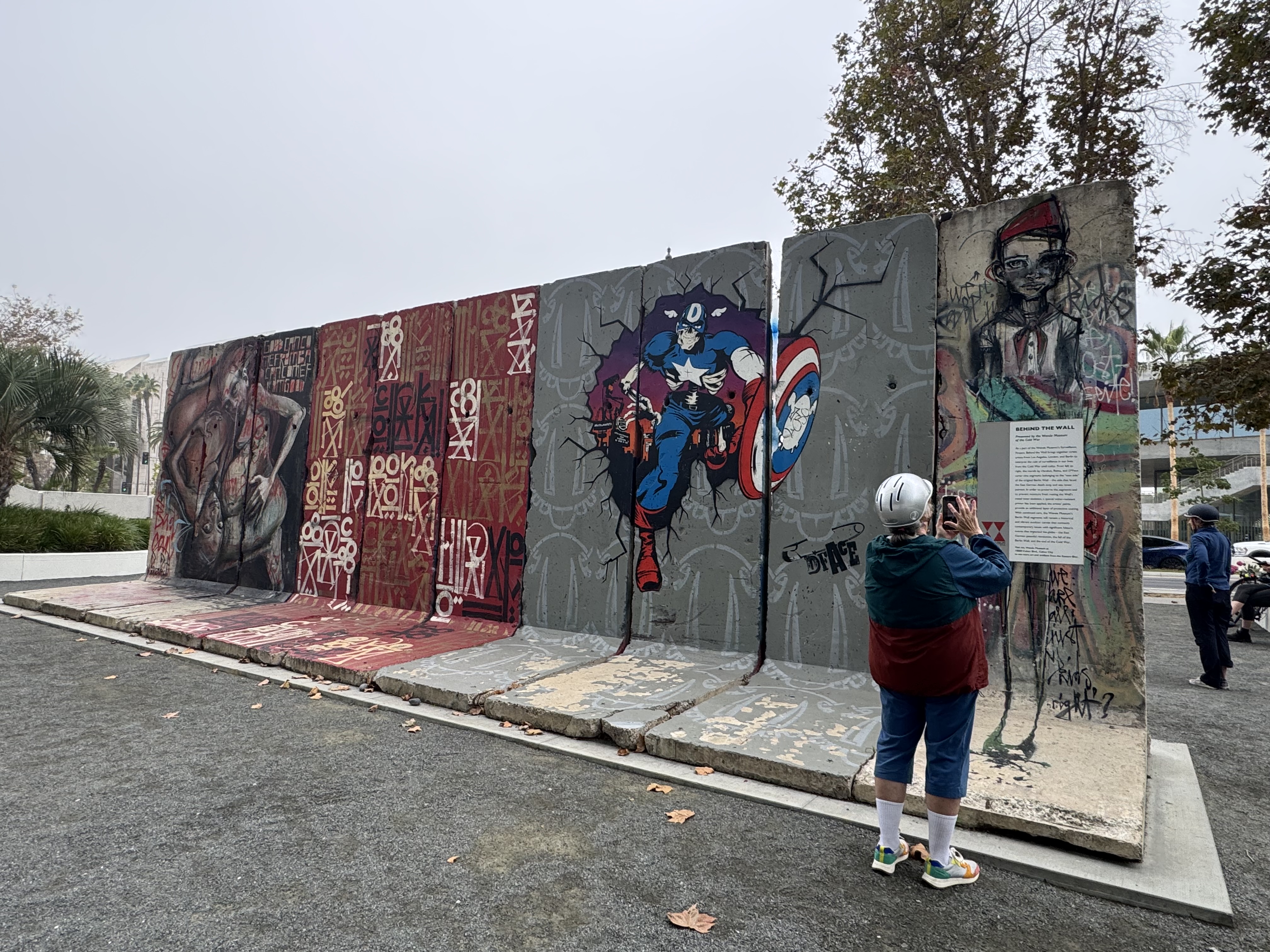 The very next morning after returning from our nation’s capital, the Women on Bikes Culver City group had a ride planned to swing by the pieces of the Berlin Wall on Wilshire Boulevard just across the street from the Los Angeles County Museum of Art (LACMA). I did not want to miss this outing, as I was curious to see the Berlin Wall pieces after having seen the East Side Gallery in Berlin the previous Summer. I was also interested in getting a glimpse of the ongoing construction of a fascinating addition to LACMA, which sweeps along and across Wilshire Boulevard, literally over the street. From there, the group rode over to Lo/Cal, a coffee shop with a very warm and inviting interior. I had a cafe au lait (again, but this time with chocolate added in) and a scrumptious sugar bun.