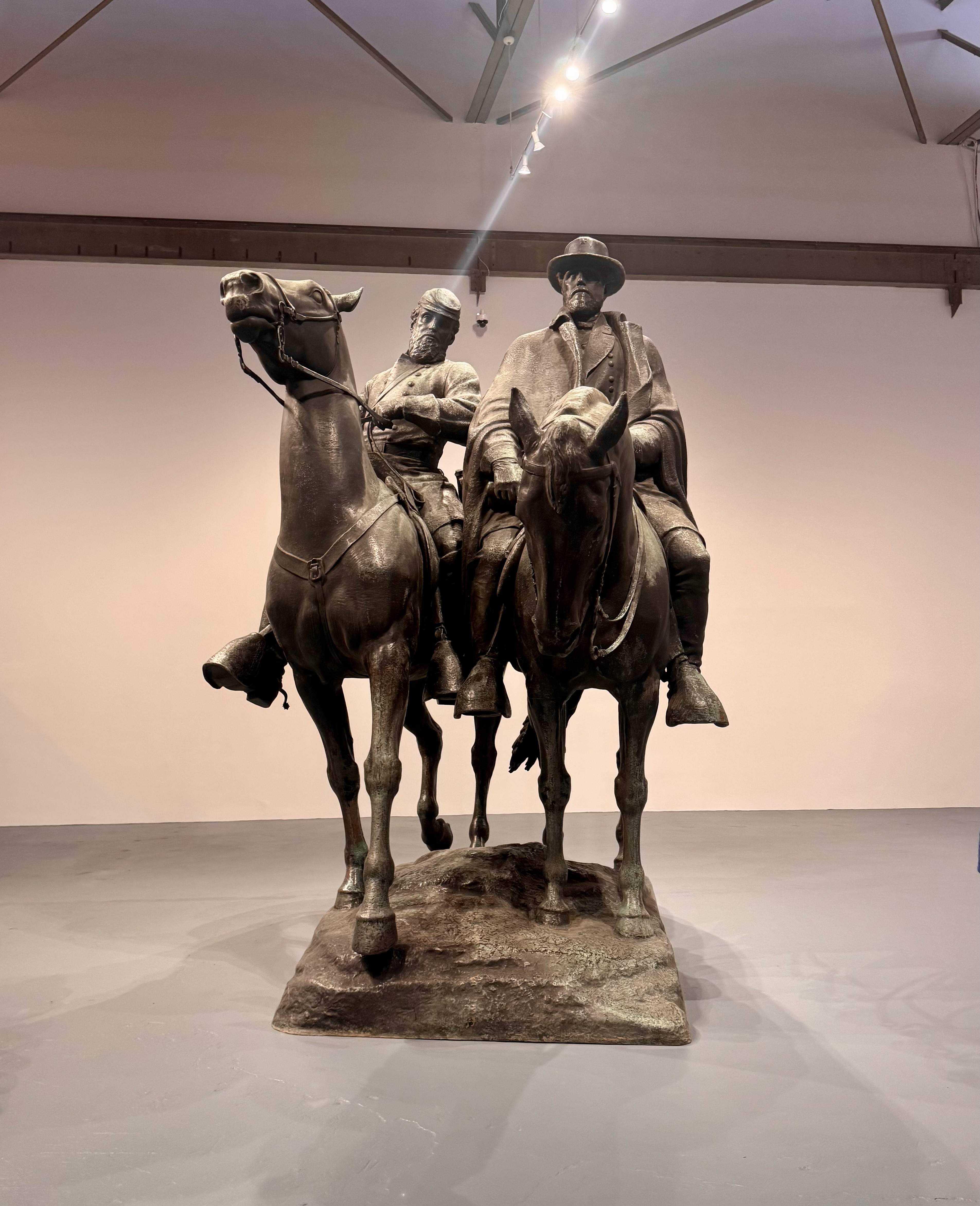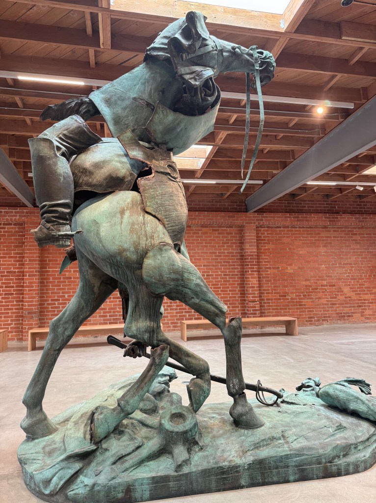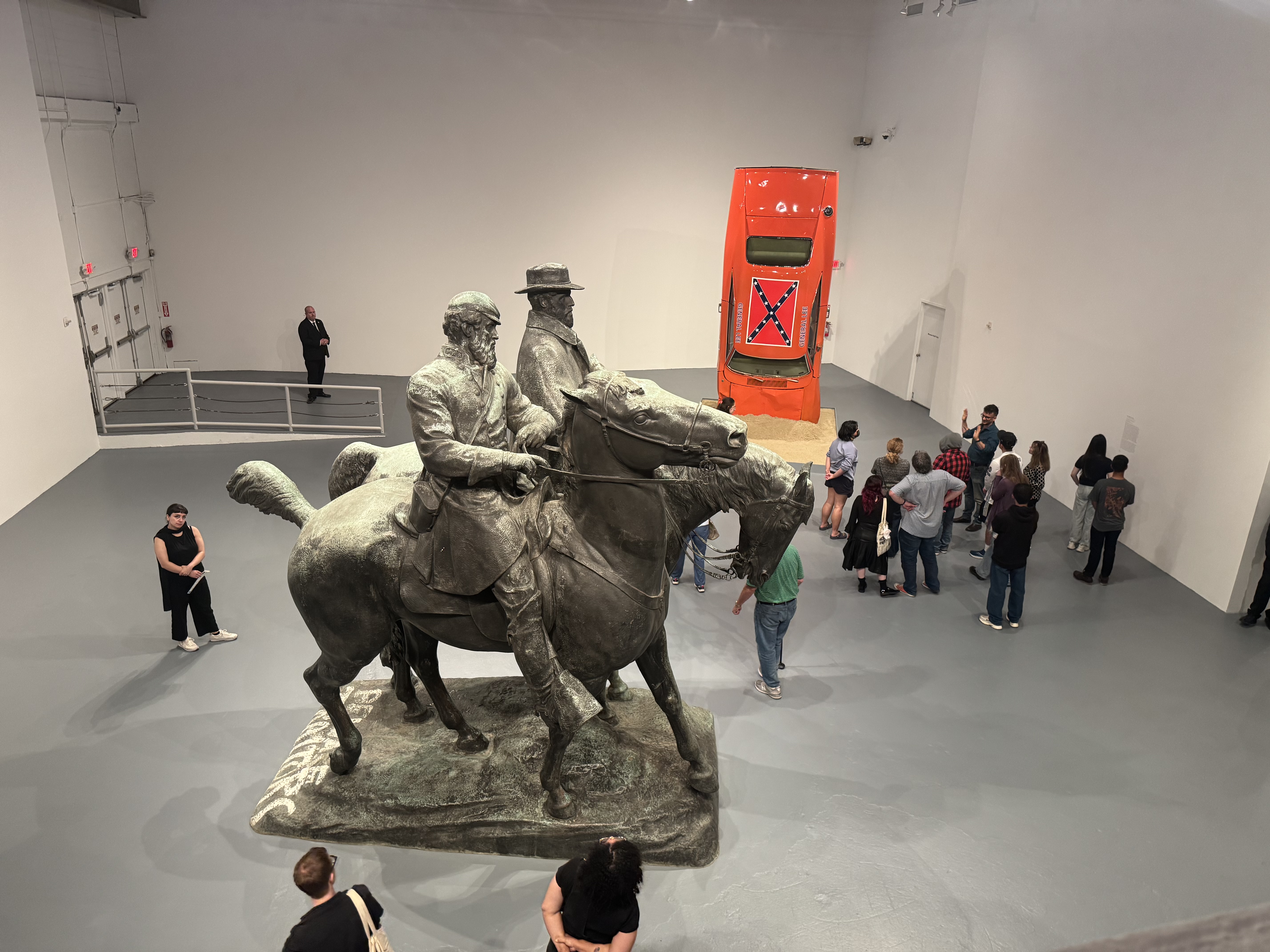The following Friday was free day at the Museum of Contemporary Art (MOCA), and my friend Joni had alerted me that she had reserved a spot to see the new MONUMENTS exhibit showing at two locations, one of which is not far from where I live. So I reserved a spot to join her. The first stop was a smaller museum, The Brick, whose exhibit features the Charles Keck’s 1921 sculpture of Stonewall Jackson riding his mount Little Sorel. The piece is titled “Unmanned Drone” by Kara Walker, who took the statue apart and reimagined it in a rather gruesome spectacle. The large, powerful piece is appropriately given nearly the entire exhibit area. Just a few related pieces are on display in an adjacent patio area.