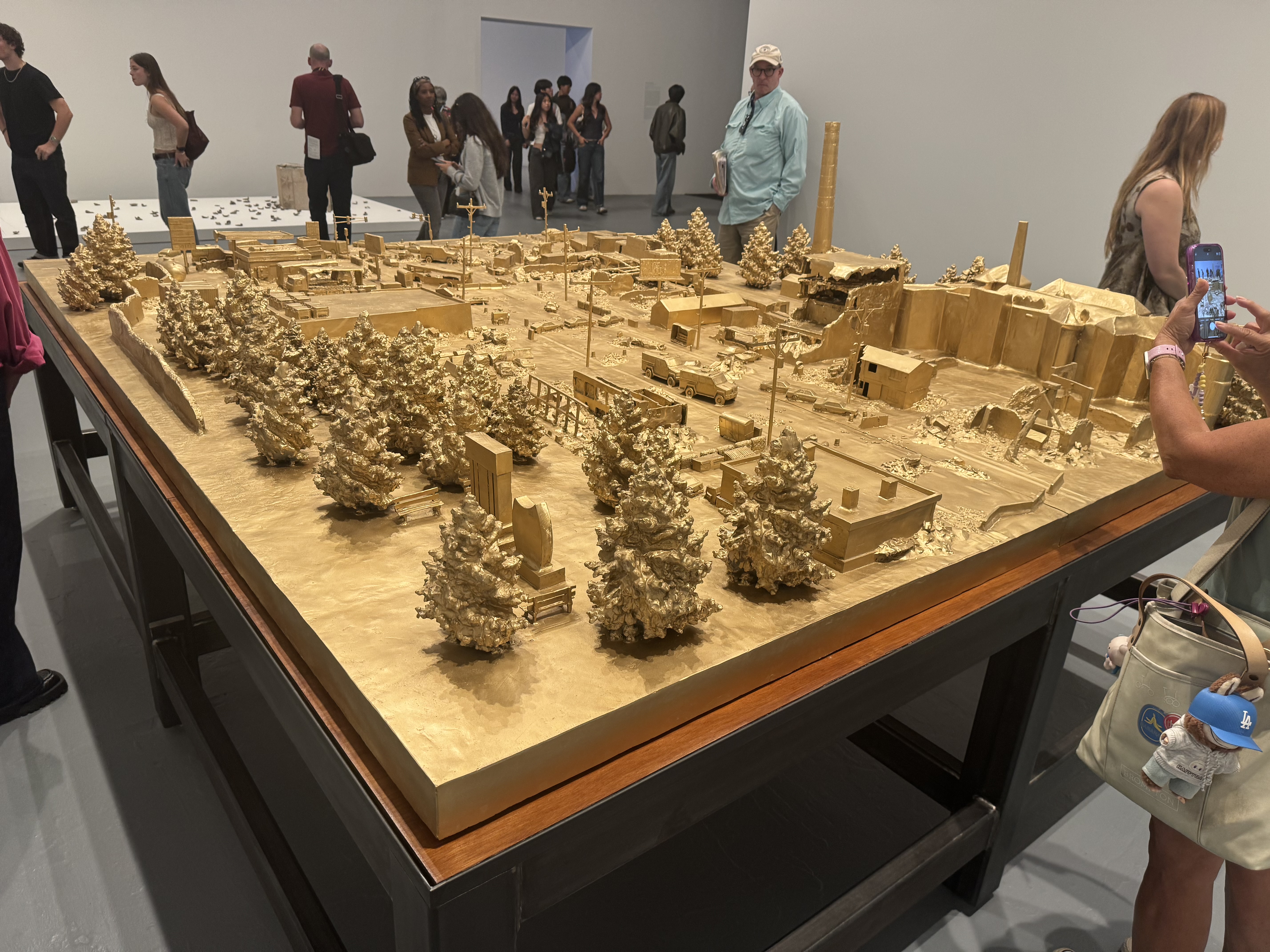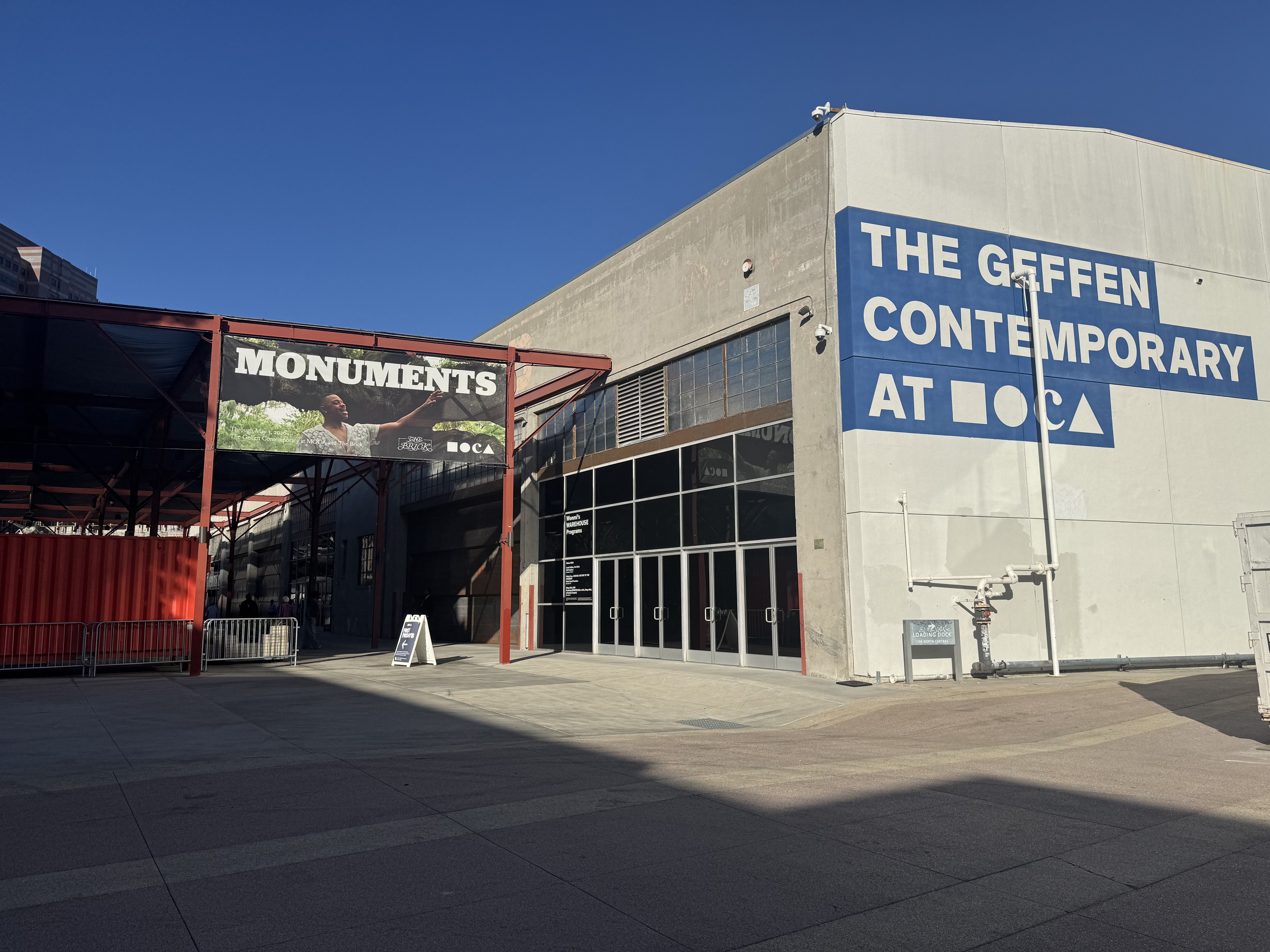 On we went into downtown to the main MOCA location, where a very friendly and helpful security guard guided us to the best place to lock up our bikes. We then walked over to the entrance, where another friendly and helpful person explained to us that the MONUMENTS exhibit was at the MOCA Geffen Contemporary in Little Tokyo. So we retrieved our bikes and rode to Little Tokyo. There, we did feel the outdoor bike parking was not sufficiently secure, so we rolled our Bromptons into the museum where we were allowed to fold them up and leave them with the coat and bag check. The folks at the security desk where we scanned our bags as we entered insisted that I leave my 3-way allen wrench at the security desk, as it was apparently considered a dangerous object. I was nervous that I might forget it when we went to leave, but during the retrieval of our bikes, it was easy to remember to go get the wrench.