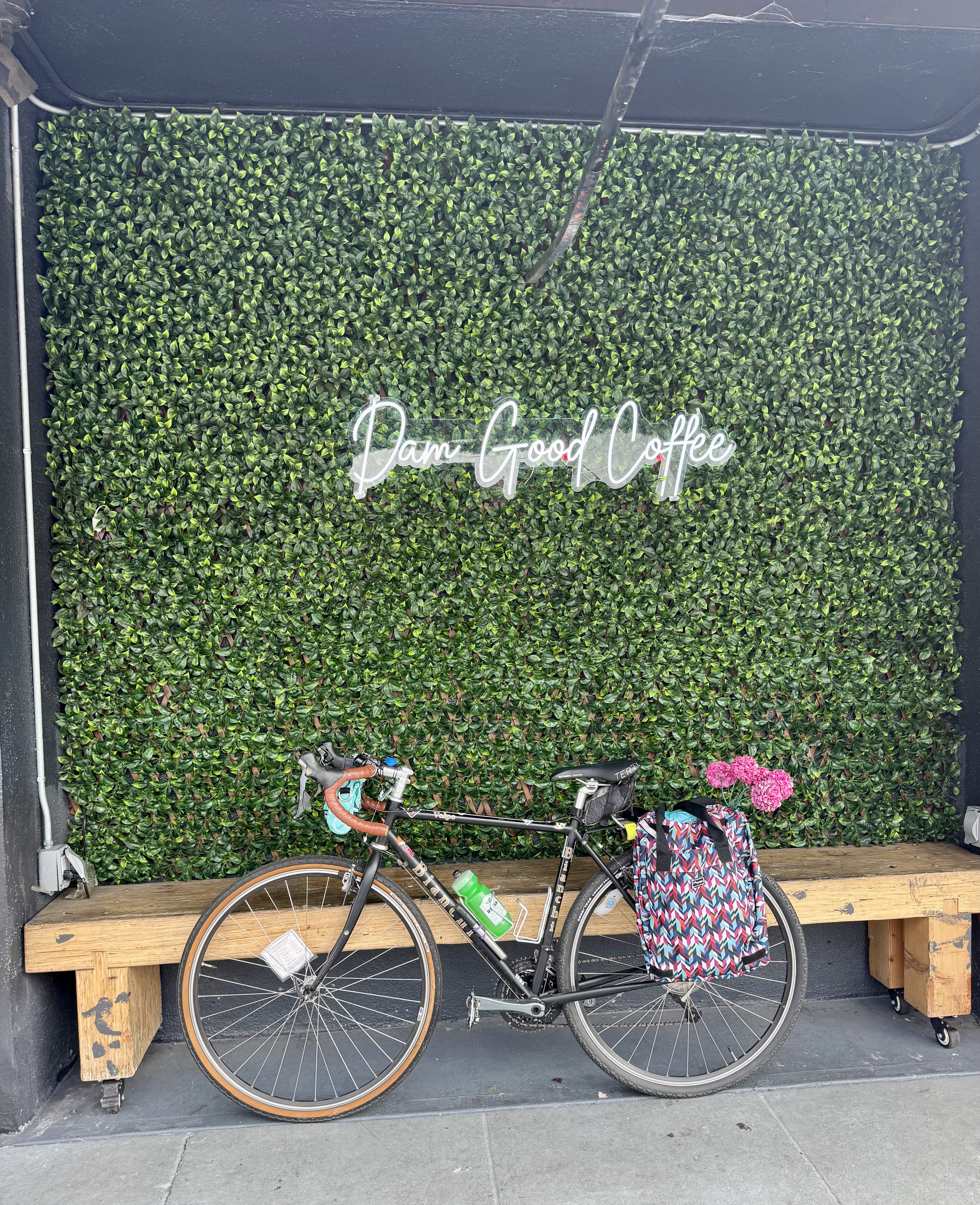 So I got to go inside, and the owner explained to me the little crisis he’d just had that took him away shortly before my arrival. And then I told him how I like to try different coffee drinks, and that I tend to like the liquid dessert variety. He recommended the Honey Vanilla Latte, and it was indeed the kind of sweet, comforting drink I enjoy. The shop is interesting, as it features some merch (sweatshirts, hats & T-shirts), plus some hints of humor, such as a sign that reads: PARENTAL ADVISORY EXPLICIT COFFEE. I liked the fun touches on the outside best. There’s a bright red old-timey pay phone mounted near the front door, and a couple of Instagram-worthy wall spaces. One is a wall of plastic greenery with neon script reading: “Dam Good Coffee”. The other is a red heart painted on a black background that reads, in script reminiscent of the “I Love Lucy” show, “I Love Coffee”. The latter had always caught me eye from the bike lane when riding by. So I enjoyed my sweet latte at one of the cute tables out by the sidewalk, and then took a few moments before leaving to snap pics of my bike in front of the cool wall art. Afterward, I rolled on to stop and get some groceries at the nearby Sprouts before rolling on home via one of my usual routes.