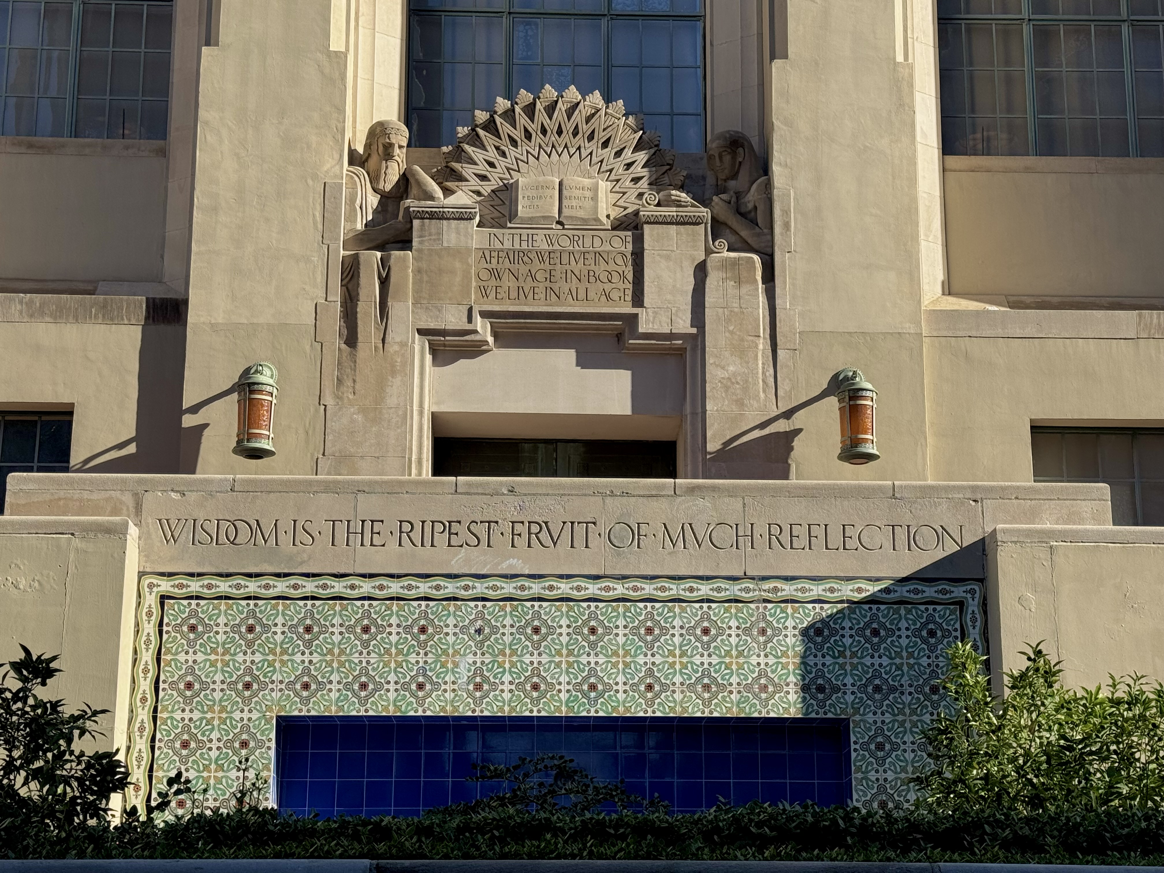 By the time I finished my blood draw, the support team at Metro Bike had responded to my support request and I was able to check out a bike again. At first I couldn’t see the docking station that I had expected to see just across the street, but then I realized it was hidden behind a very large tractor/trailer combination that was parked in the street and obscuring the dock. The station was in service (yay!) and I was able to get rolling by bike again. From there, I rode over to the CalEdison building, or actually to a bike share station on the other side of the Public Library, as the docking station closest to the CalEdison building was another one that was out of service that day. I did not mind, though, as the downtown library is a beautiful building, and I enjoyed walking around it.