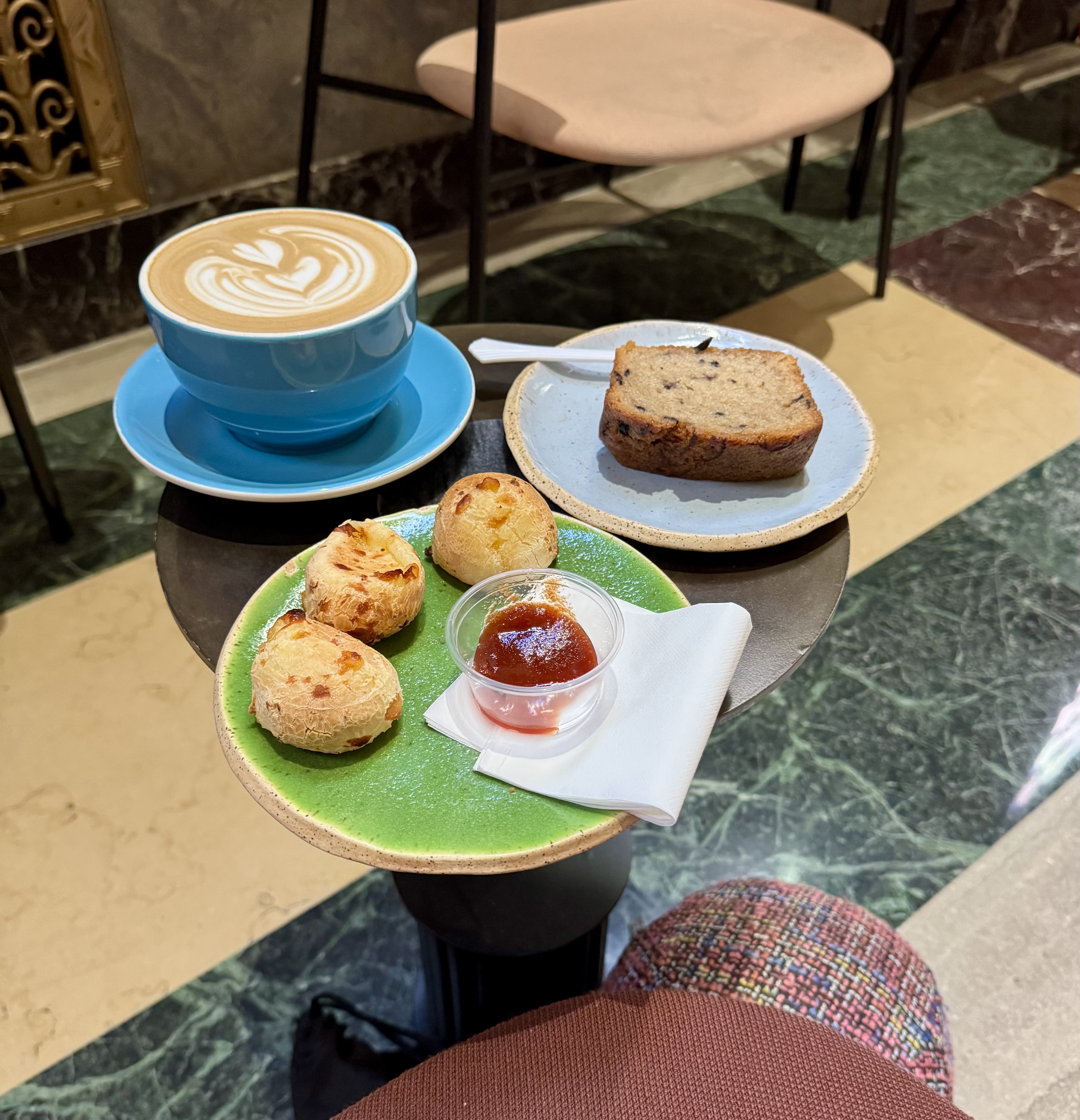 The lobby of the CalEdison building is truly stunning. The beauty and architectural detail that went into that lobby is a treasure. After taking a moment to gawk at the lobby, it was easy to spot Aquarela. I walked up and was greeted by a friendly women who gave me the run-down on their offerings, which include some special Brazilian treats and coffee drinks. I opted for the Sabotage Latte, which features both chocolate and spices. Since I was hungry, I also tried both the blueberry cake and the Brazilian cheese balls, Pão de Queijo, that are served with a red sauce. Everything was scrumptious and tasty!