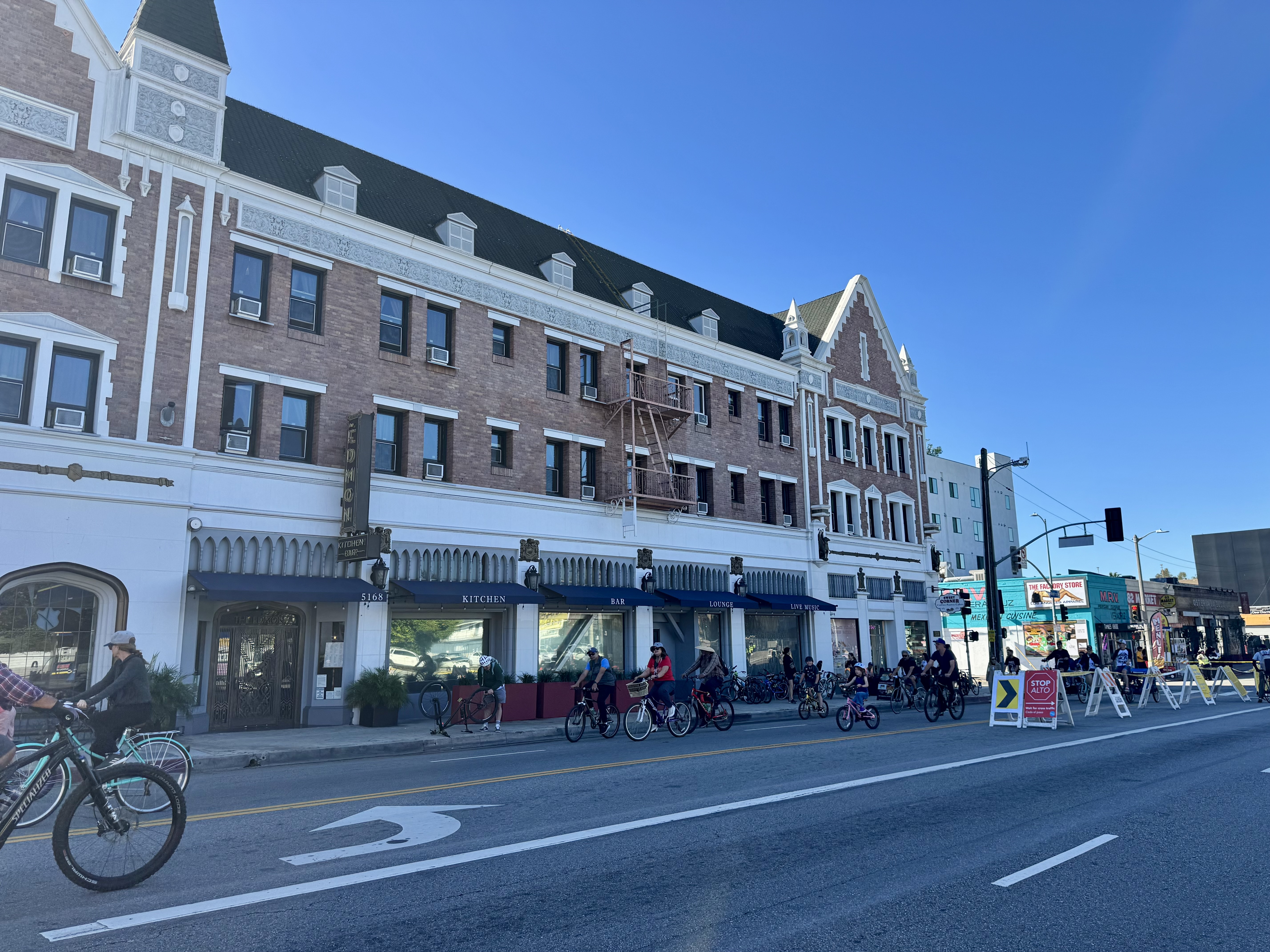 Continuing west on Melrose Ave on this same CicLAvia ride, I rode to the route’s other end at Fairfax, where I was trying to position myself to snap a selfie by the big overhead sign reading “One Last Ride”. Just then, someone was teasing me, and I realized it was my friend Lynn. So we snapped our selfie together, and then rode back toward the east end of the route. I told Lynn that I had long wanted to try the coffee and dessert shop at the corner of Melrose & Wilton, Sweet Corner Coffee & Cakes. That’s another very appealing historic building with great architectural features that I have gone past dozens of times and thought to myself, “I ought to stop there next time I’m coffeeneuring.”