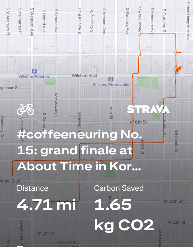It was down to the last day of the challenge (although the Chief Coffeeneur had just announced an extension of the deadline by a few days). It was a Monday, and my teacher-husband had the week off from school due to the Thanksgiving holiday. I had spent the morning doing more house cleaning in preparation for our kids coming into town for Thanksgiving. I told him I needed a break, and there was a coffee shop not far away, in Koreatown, that had been on the list of beautiful coffee shops, and that I wanted to give it a try on this last day of the challenge. He decided to join me, so we hopped on our bikes and rolled on over. First we stopped at the office building where I needed to check the mail, and then we were just a few blocks from About Time, our coffee destination.