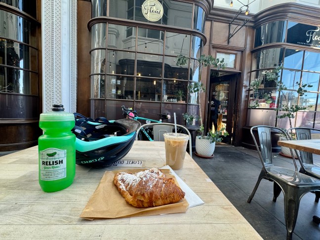 I made my way to the Burlington Arcade, and rolled my bike right on in. There was a long line of folks, but I was relieved to see that they were waiting to enter a different establishment in the arcade. I leaned my bike against the wall in front of Float and just locked the bike wheel to the frame, which seemed sufficient given I was never far from the bike or unable to keep it in view. Float seemed like more of an ice cream place, or as the name suggests, an ice cream float place. But I was on a coffee mission, so I ordered an iced lavendar latte and an almond croissant. The latter was quite good; the former was okay.
