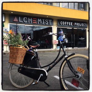 First things being first, I went straight to my coffee shop: Alchemist Coffee Project. This seemed the perfect choice for today’s coffeeneuring ride, as it was conveniently on my way to the First Unitarian Church, where I wanted to catch the service before joining the CicLAvia fun. I have been curious to try this place, as I often pass it when taking the 7th Street bike lane towards downtown Los Angeles. I was also curious to try this place since noticing it had taken the spot formerly known as the Bourbon Street Cafe, where I had been many times. I have a special place in my heart for Bourbon Street Cafe, as this is where all the first meetings happened back when the plans for Bikie Girl Bloomers were first being hatched.