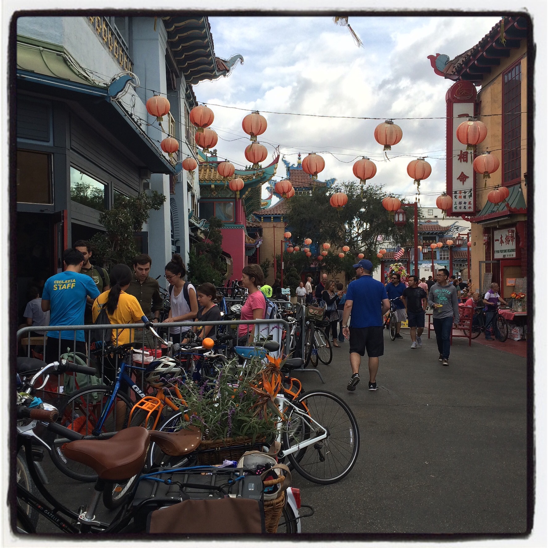 We continued along Broadway into Chinatown, where we joined a party for volunteers and supporters of CicLAvia hosted by Blossom Vietnamese Restaurant. The food at Blossom was good – I think we will have to go back and experience the restaurant as regular customers.