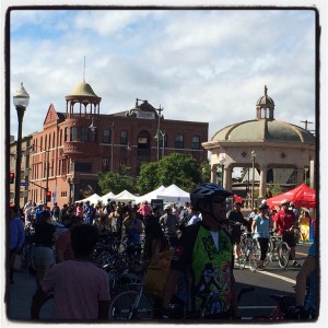 We followed the route into downtown and onto Broadway. Please note the awesome shirt hubby is wearing. It reads: “I never dreamed I’d end up married to a sexy cycling lady, but here I am, living the dream!” You’ll never guess who got that shirt for him.
