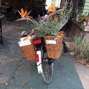 When I participate in CicLAvia, I usually like to bring along both of my Nantucket Basket Panniers, one filled with samples of my Bikie Girl Bloomers (never know when I’ll wish I had them with me), and the other with a floral display (just because). This time, I tried adding some Bikie Girl stickers to help advertise, but I think I need a bigger sign.