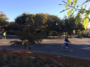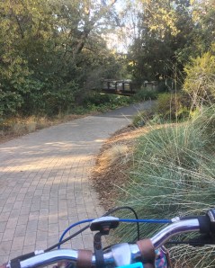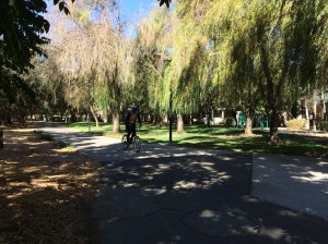 This got me to 3rd Street, a street with whom I have a conflicted love-hate relationship. Sometimes I just take the lane, because there are some places you can’t get to except via 3rd Street, and why shouldn’t I? Sometimes (especially at night) I ride on the sidewalk. Today, I took the lane, but the stress of it wore me down, and when I got to the last long block, I hopped over to take advantage of the paved path along the outside edge of Pan Pacific Park.