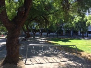 So I took that skinny little bike lane all the way to the University of Southern California (USC), cut through the USC campus, and on into downtown. Once I got to Birdies, I was pleased to see that, once again, I was able to lock my bike to a good rack right in front of the donut shop.